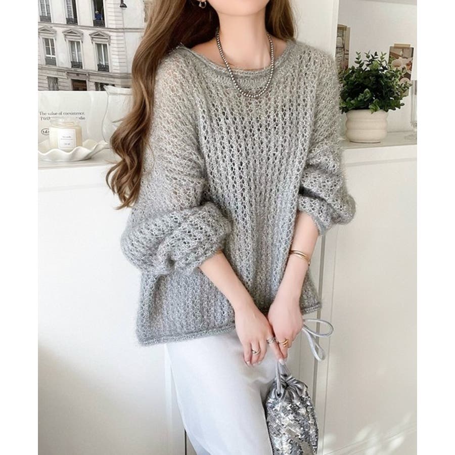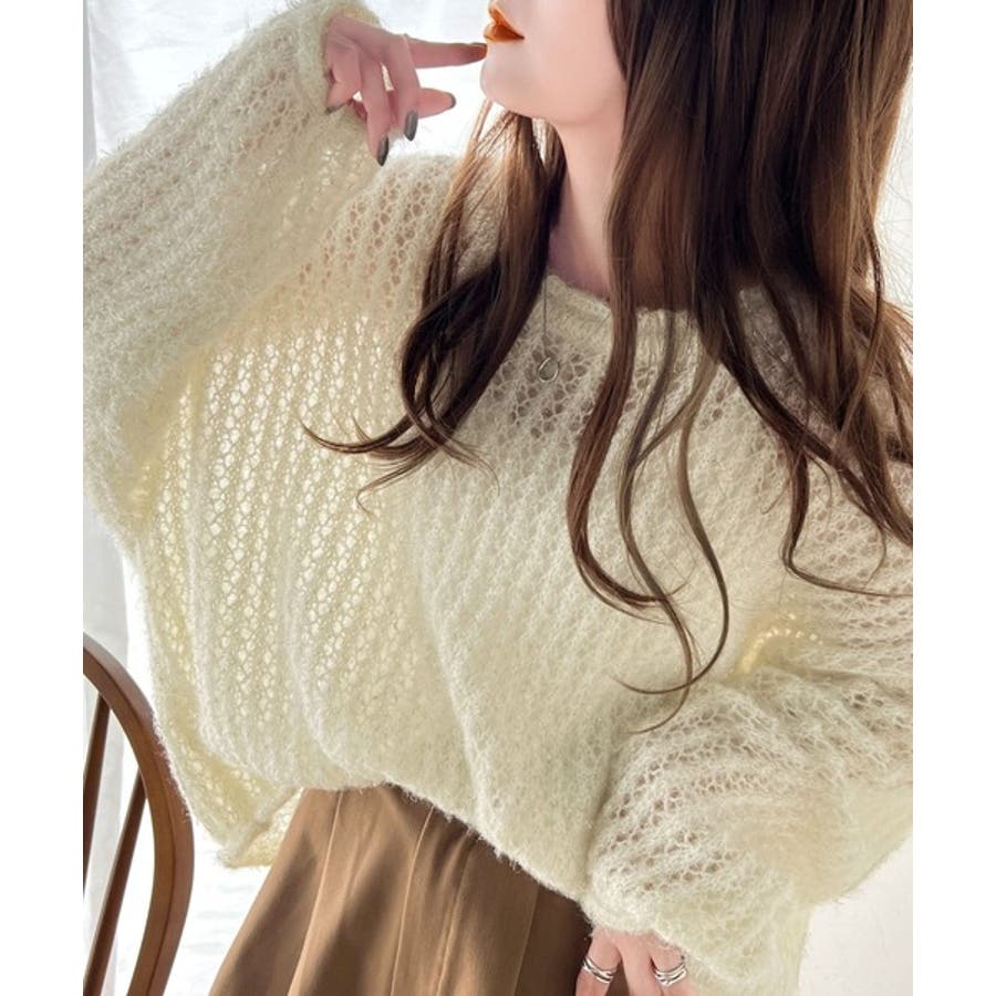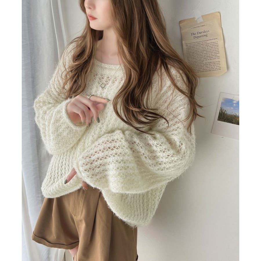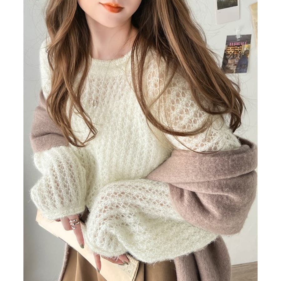 ざっくりとした透け感のある編地で、インナー次第で様々な着こなしが楽しめます。