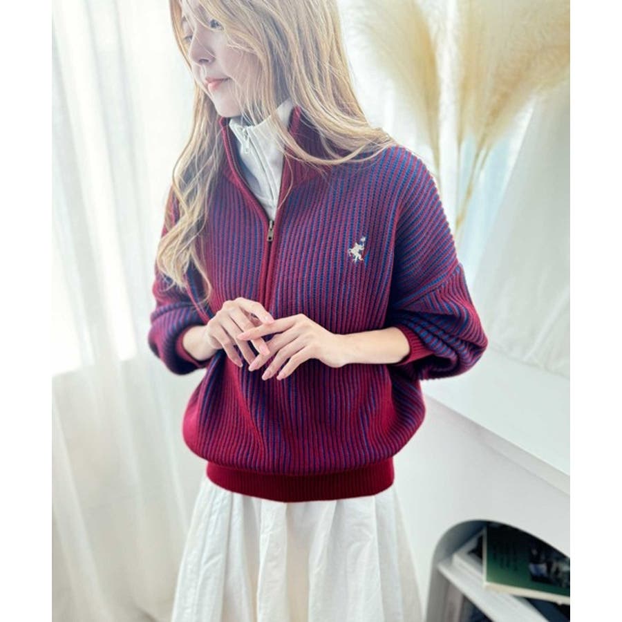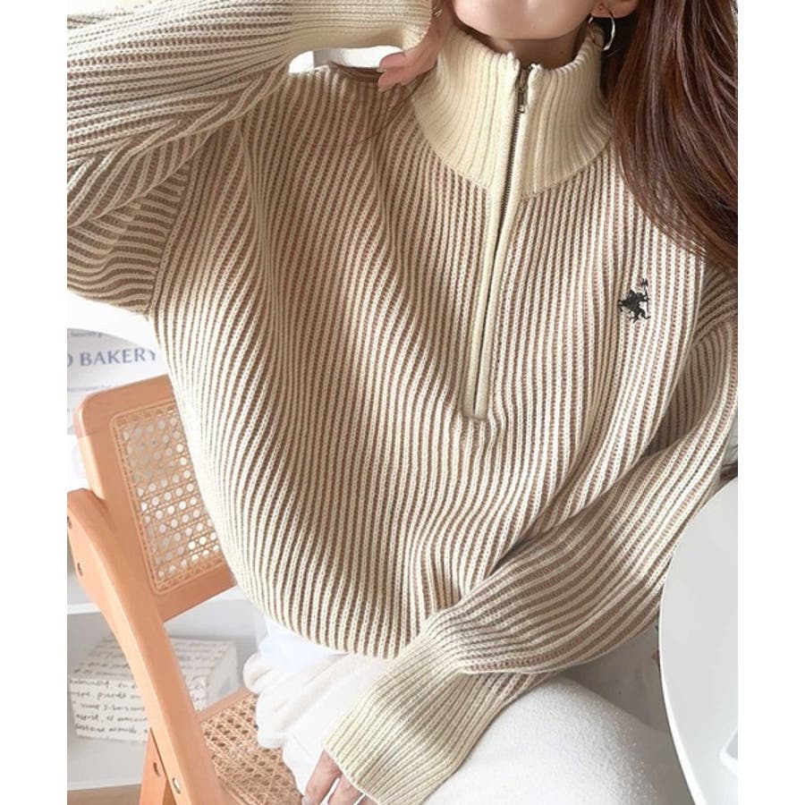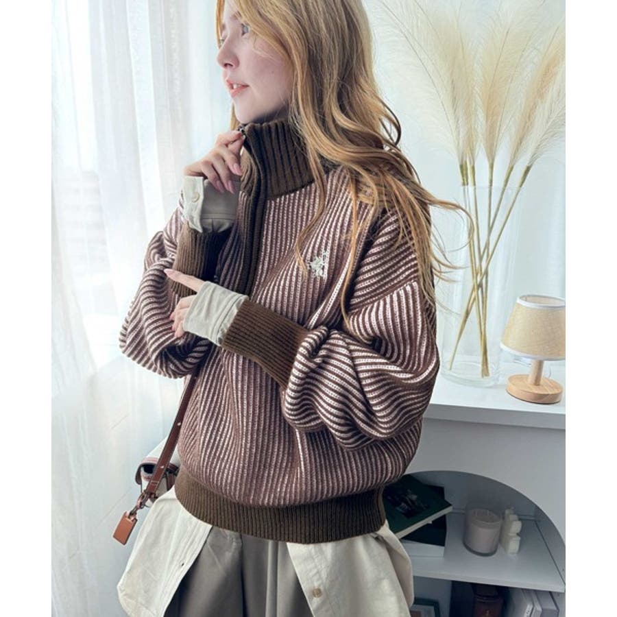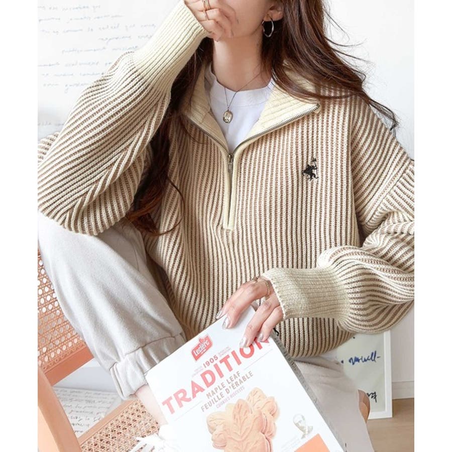 お洒落な配色でワンランク上の秋冬コーデ。胸刺繍バイカラーリブニットハーフジッププ…