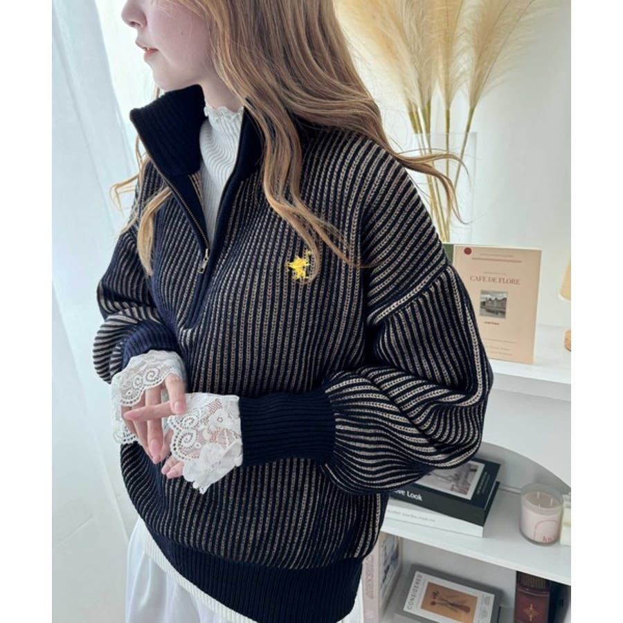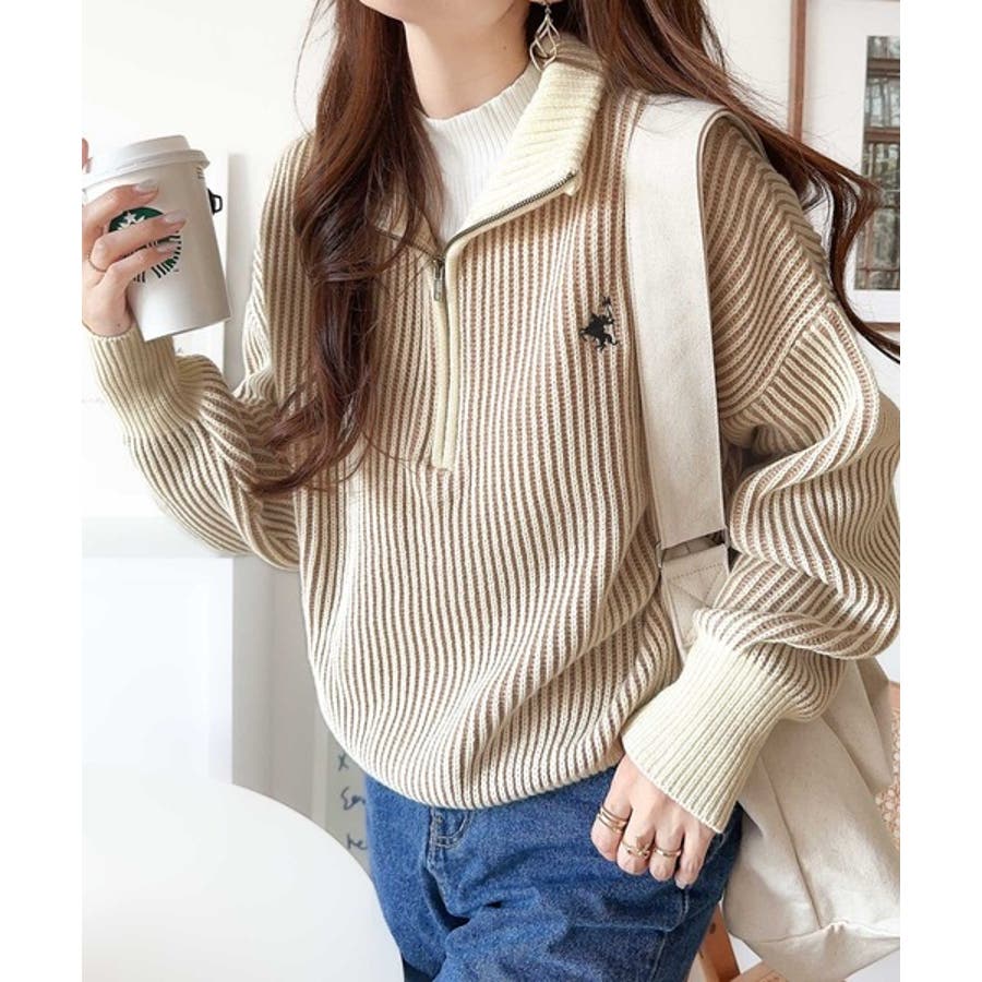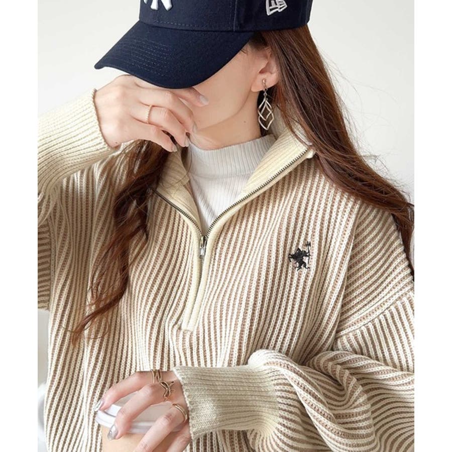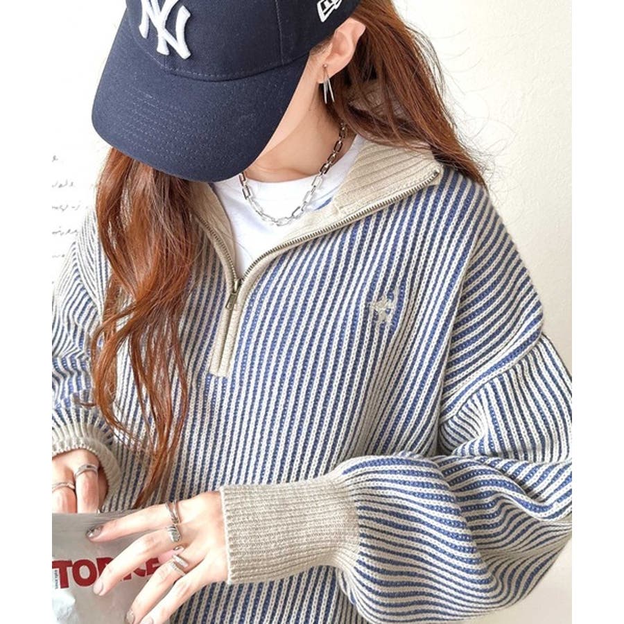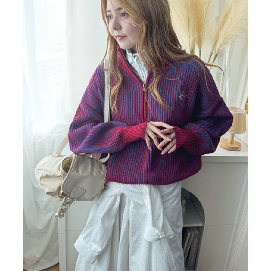 お洒落な配色でワンランク上の秋冬コーデ。胸刺繍バイカラーリブニットハーフジッププ…