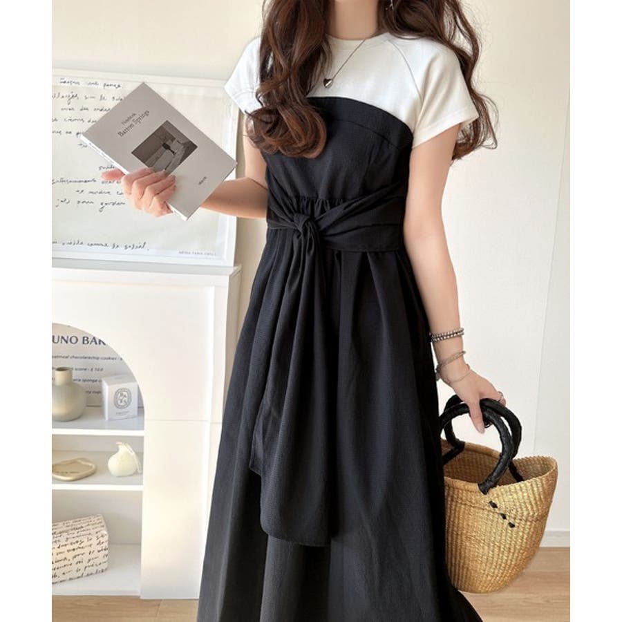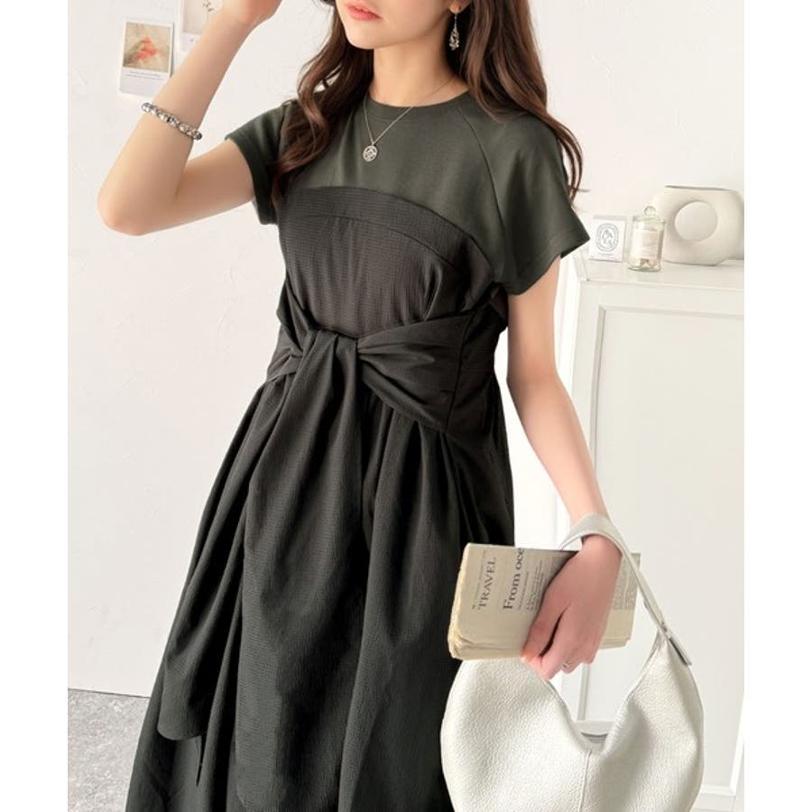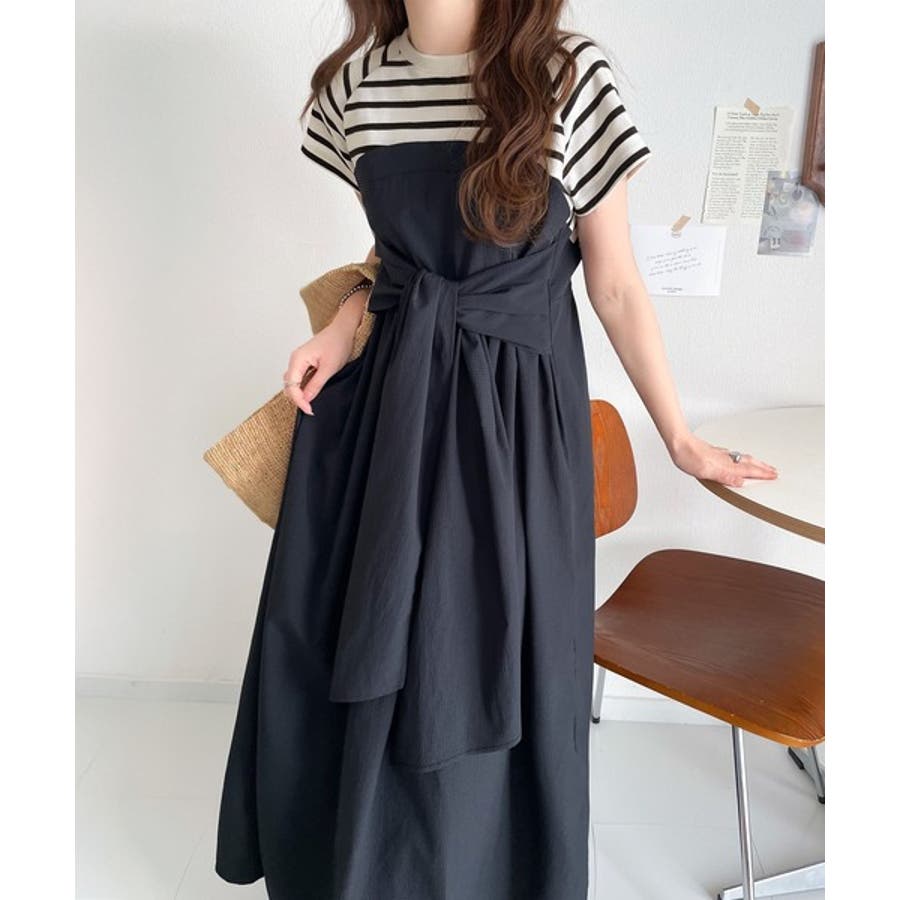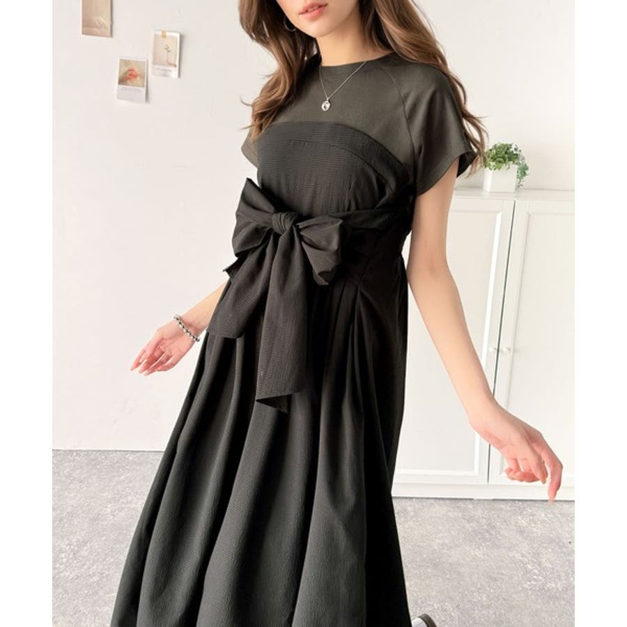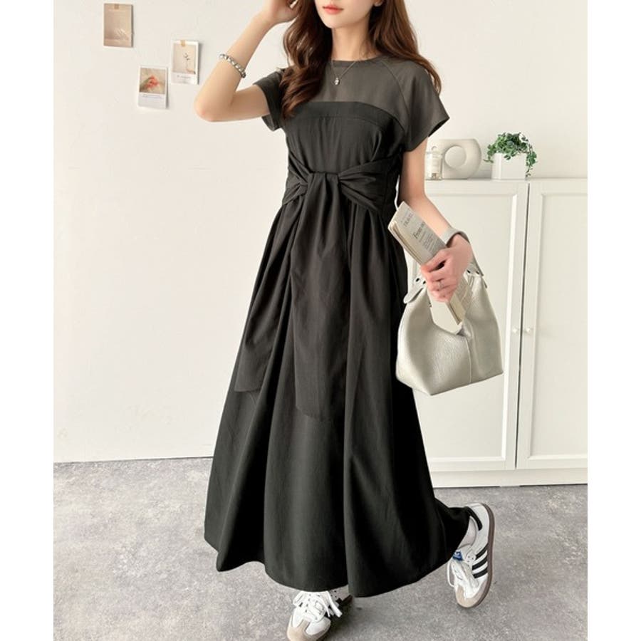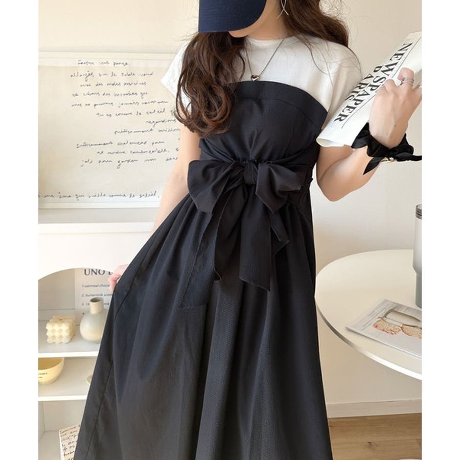 【チャコール×ブラック】一枚で旬のワンピスタイルが完成♪ビスチェ風2wayリボン使いサッカー素材ドッキン…