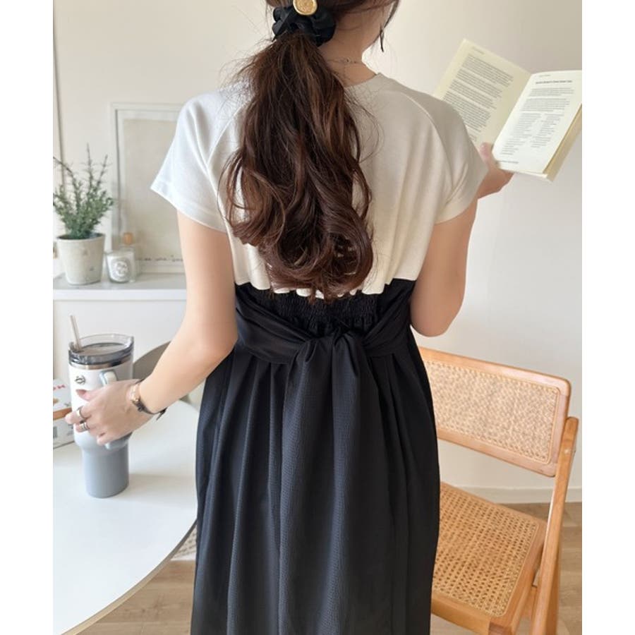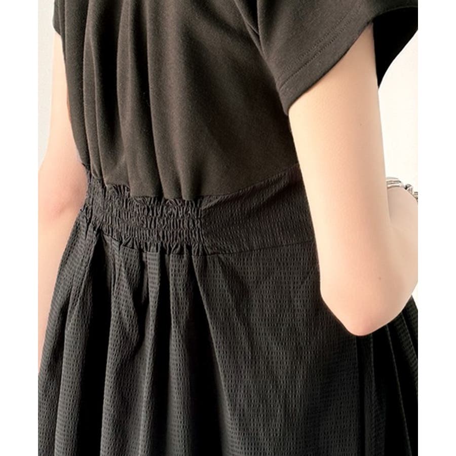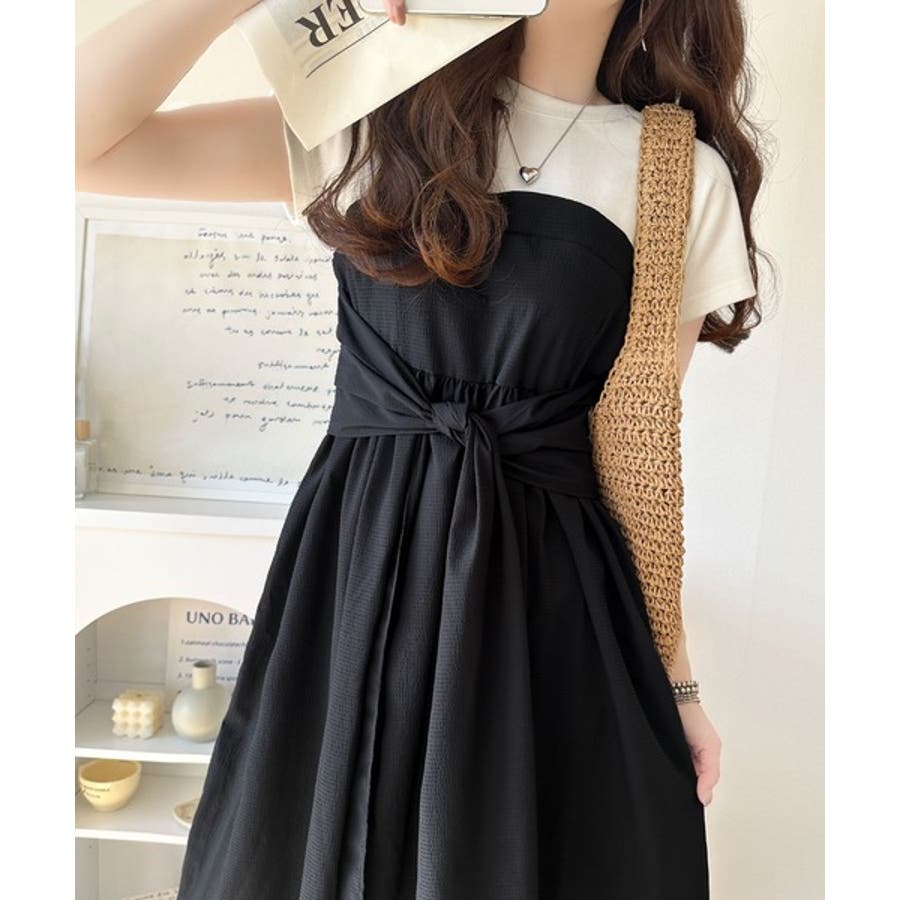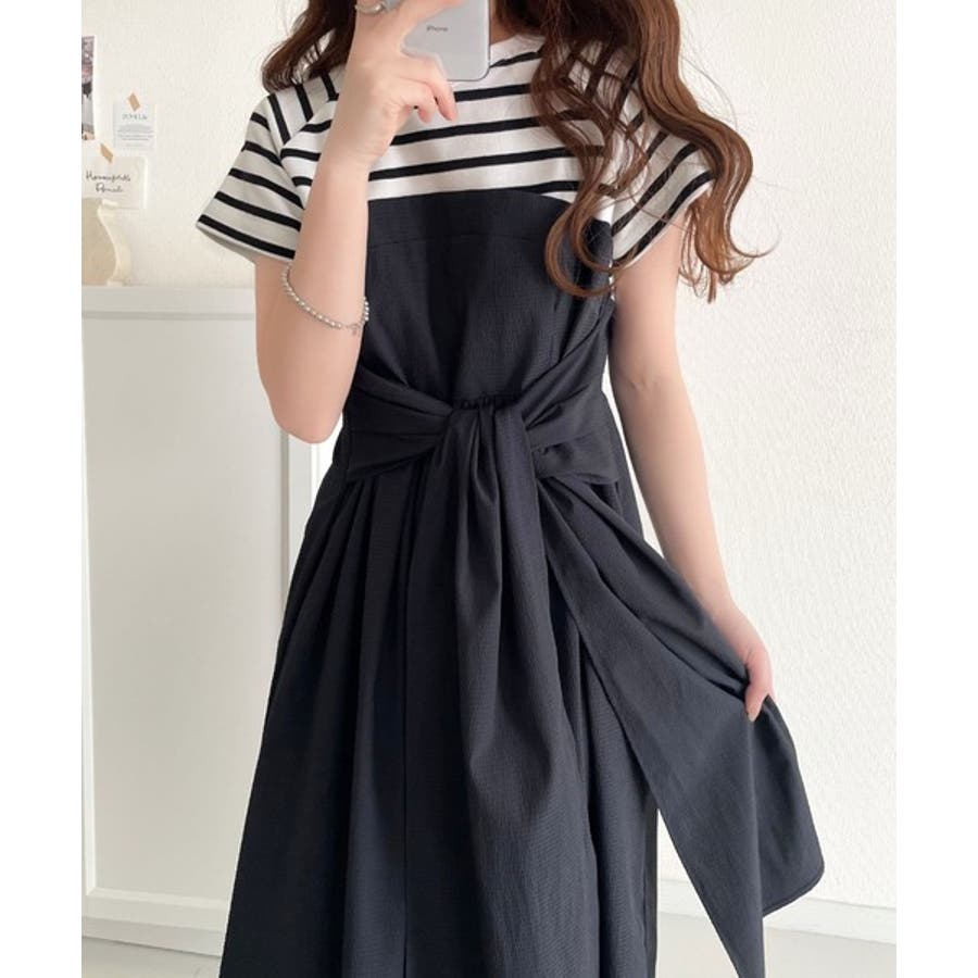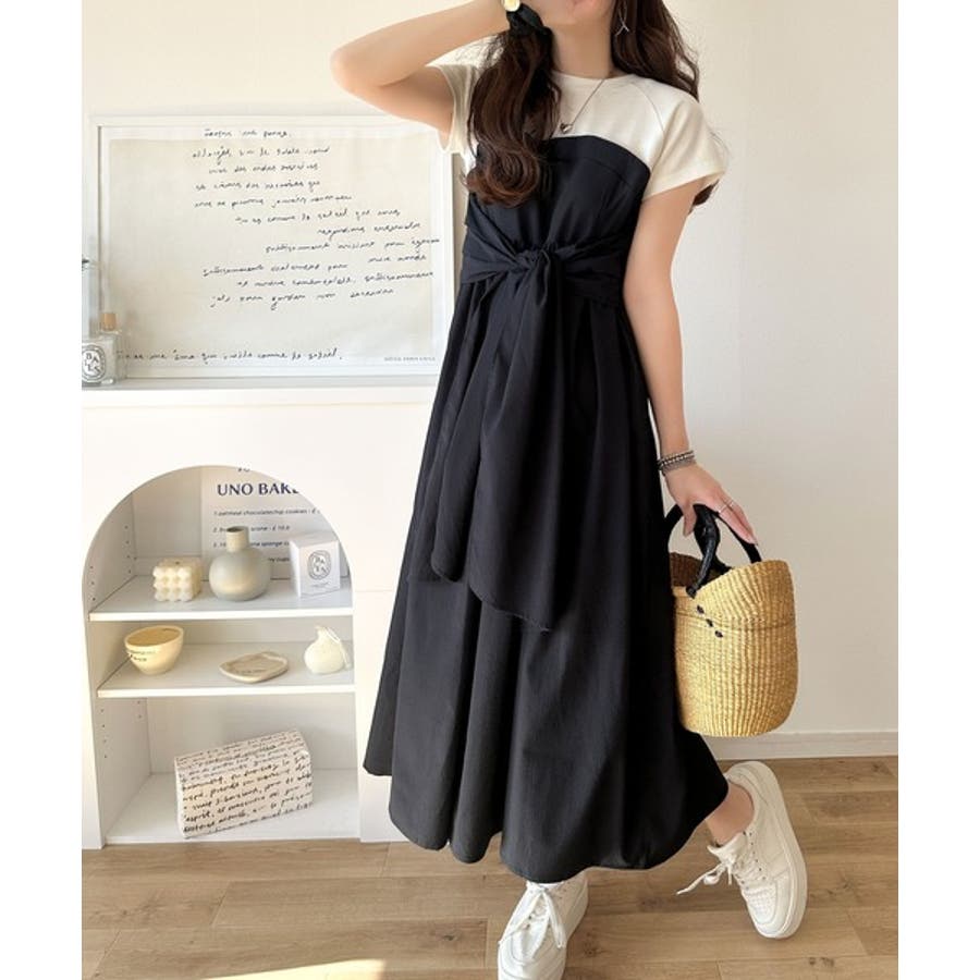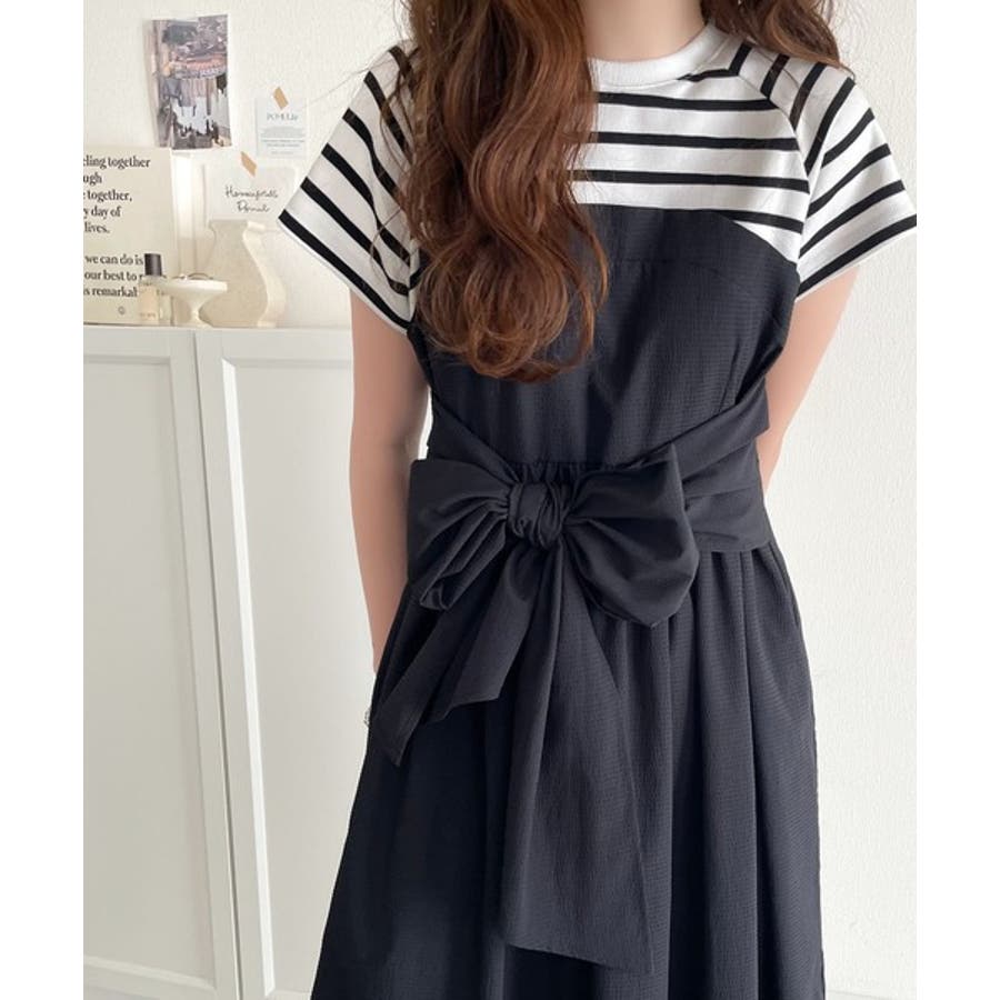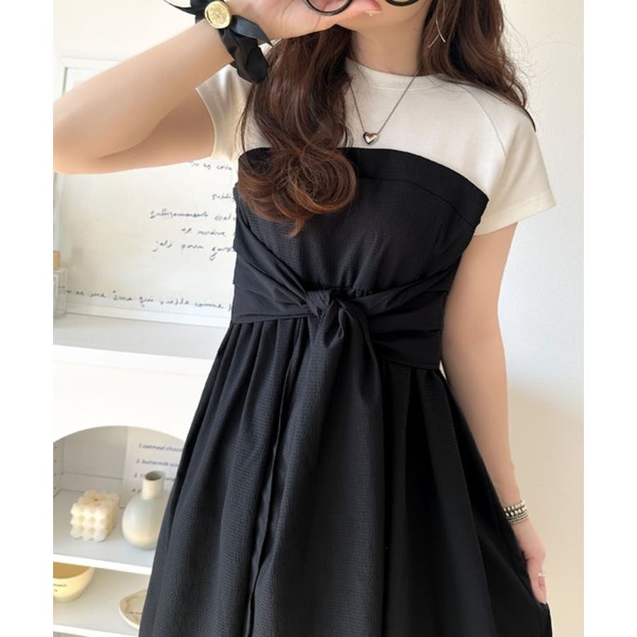 【チャコール×ブラック】一枚で旬のワンピスタイルが完成♪ビスチェ風2wayリボン使いサッカー素材ドッキン…