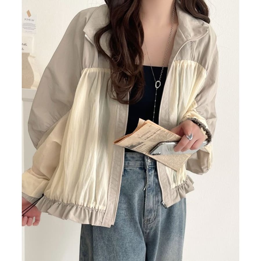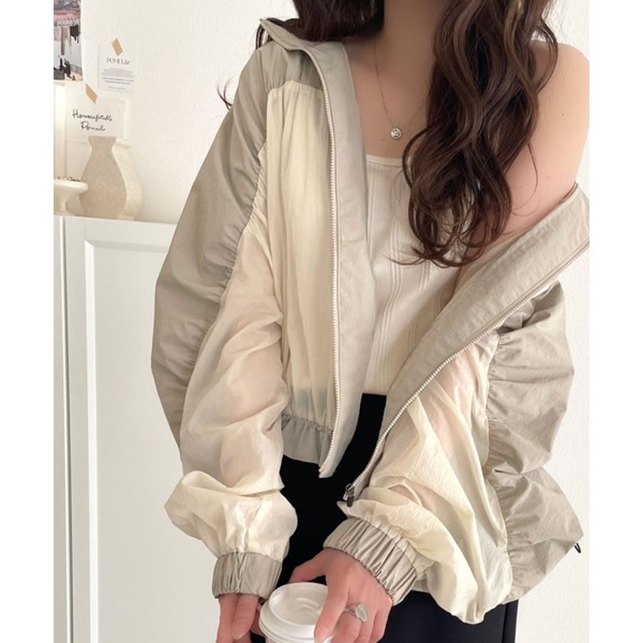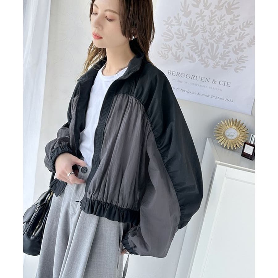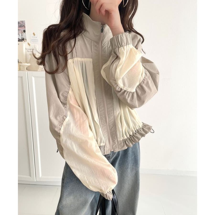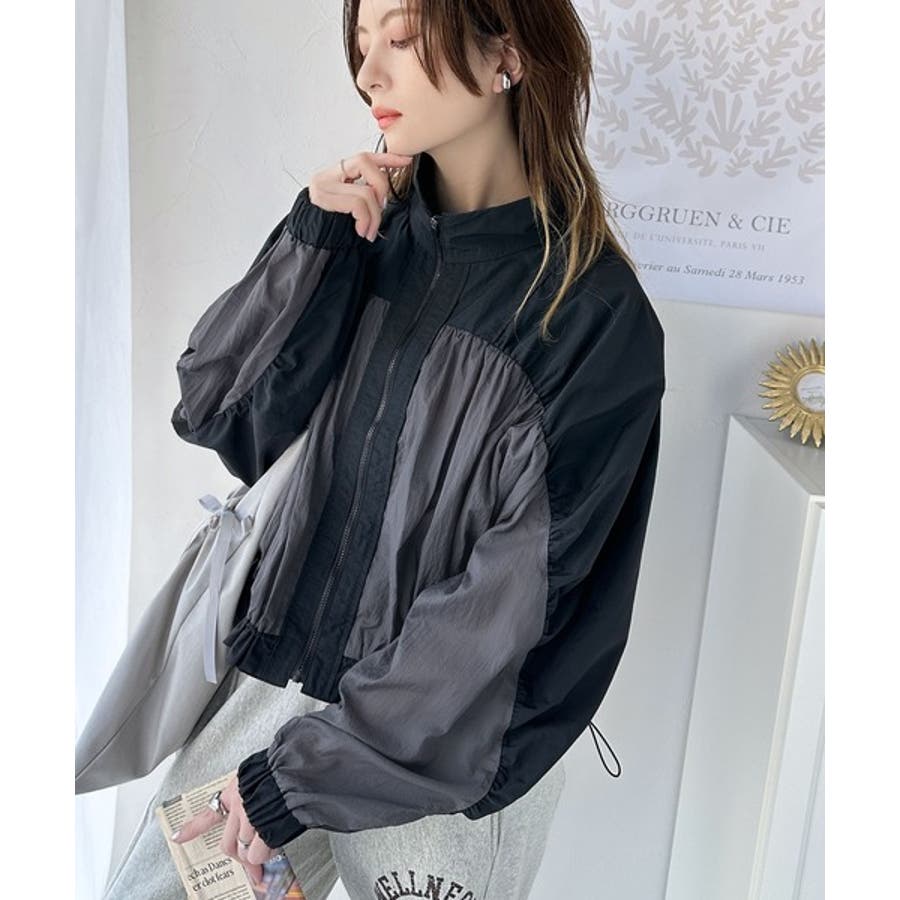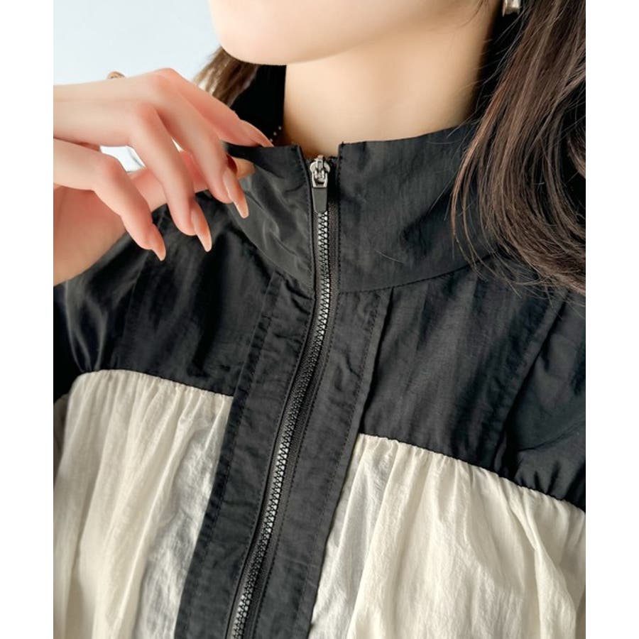 柔らかなシアーが魅力。軽量ナイロン異素材ドッキングギャザー使いスタンドカラーブル…
