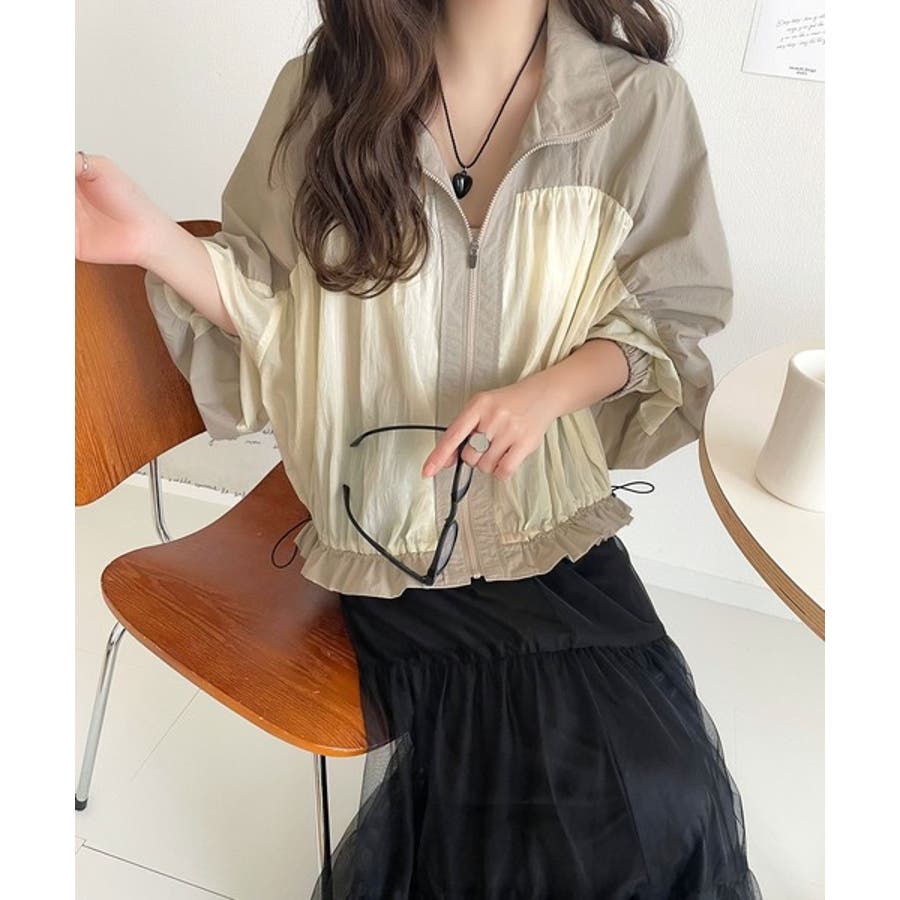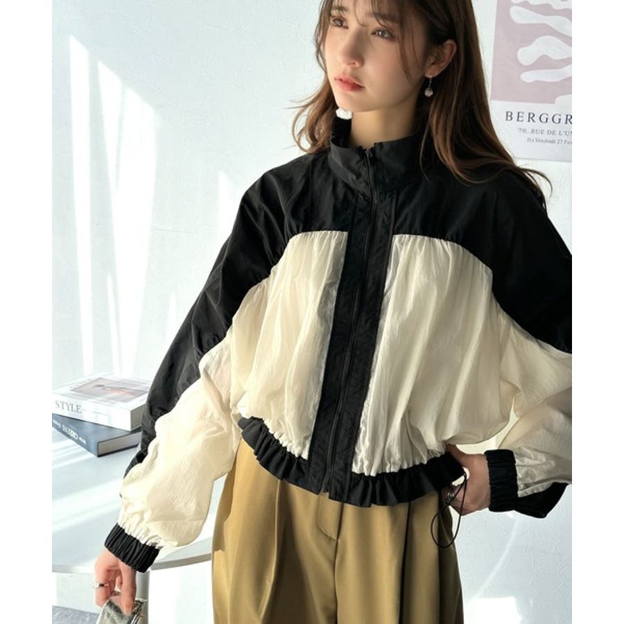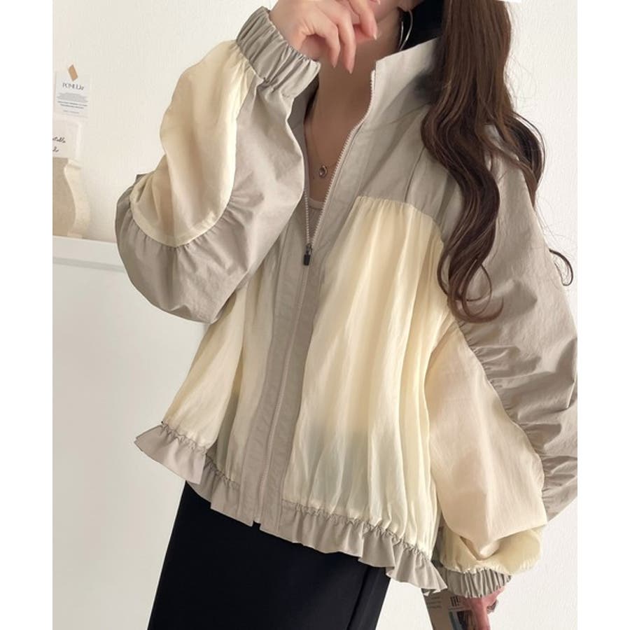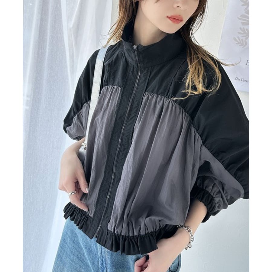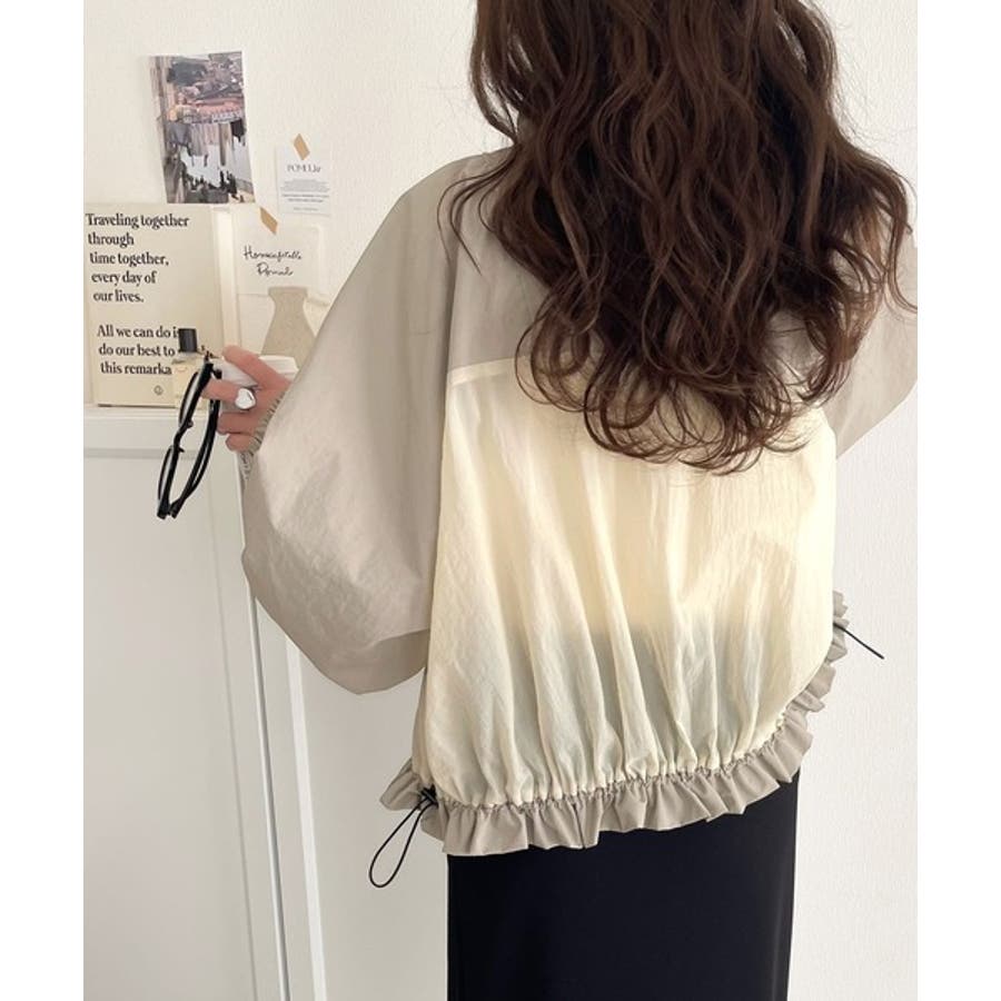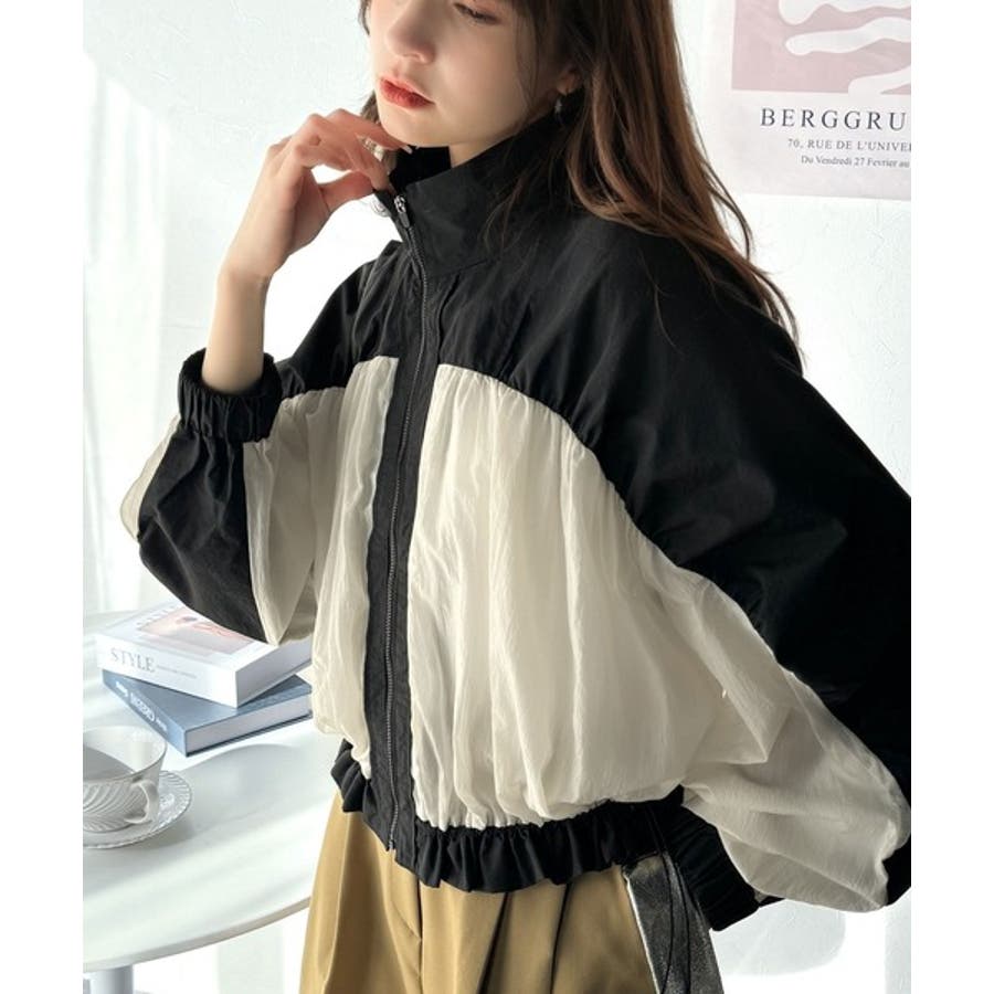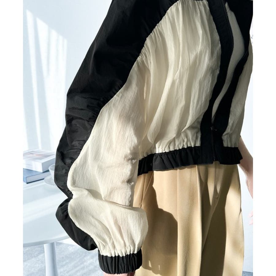 柔らかなシアーが魅力。軽量ナイロン異素材ドッキングギャザー使いスタンドカラーブル…