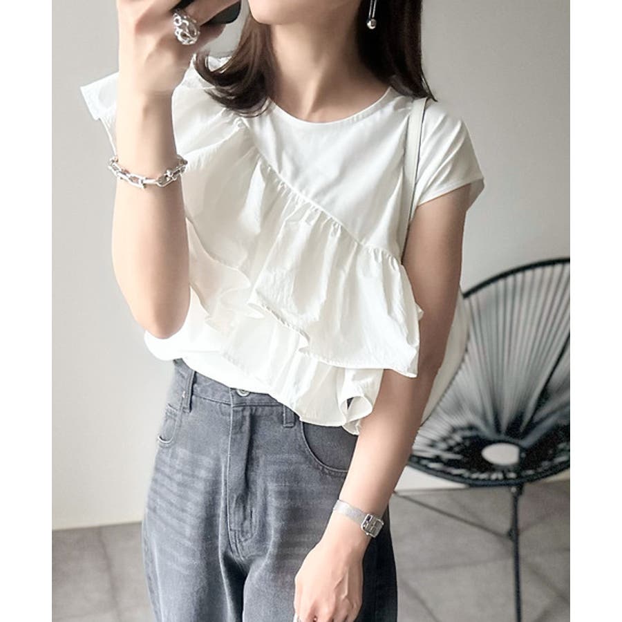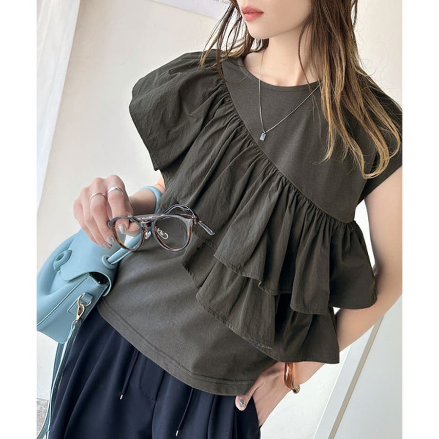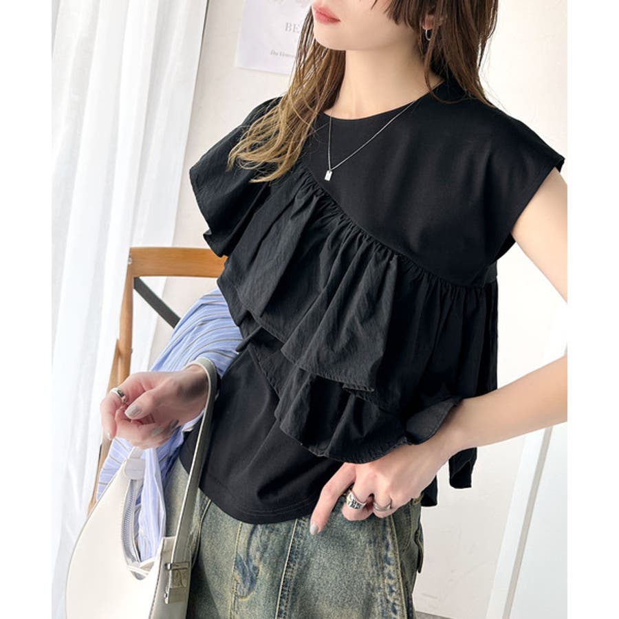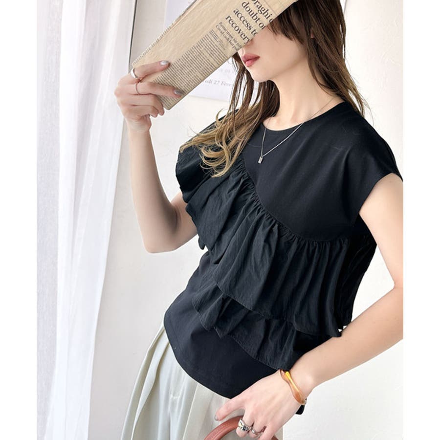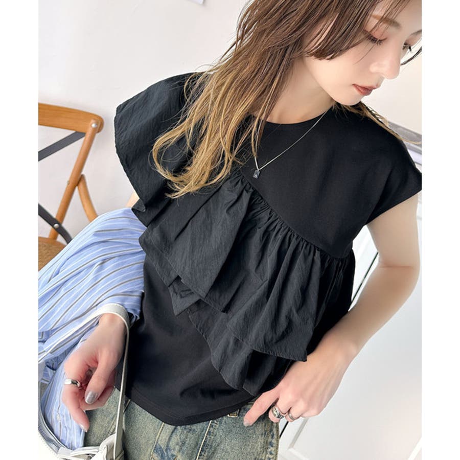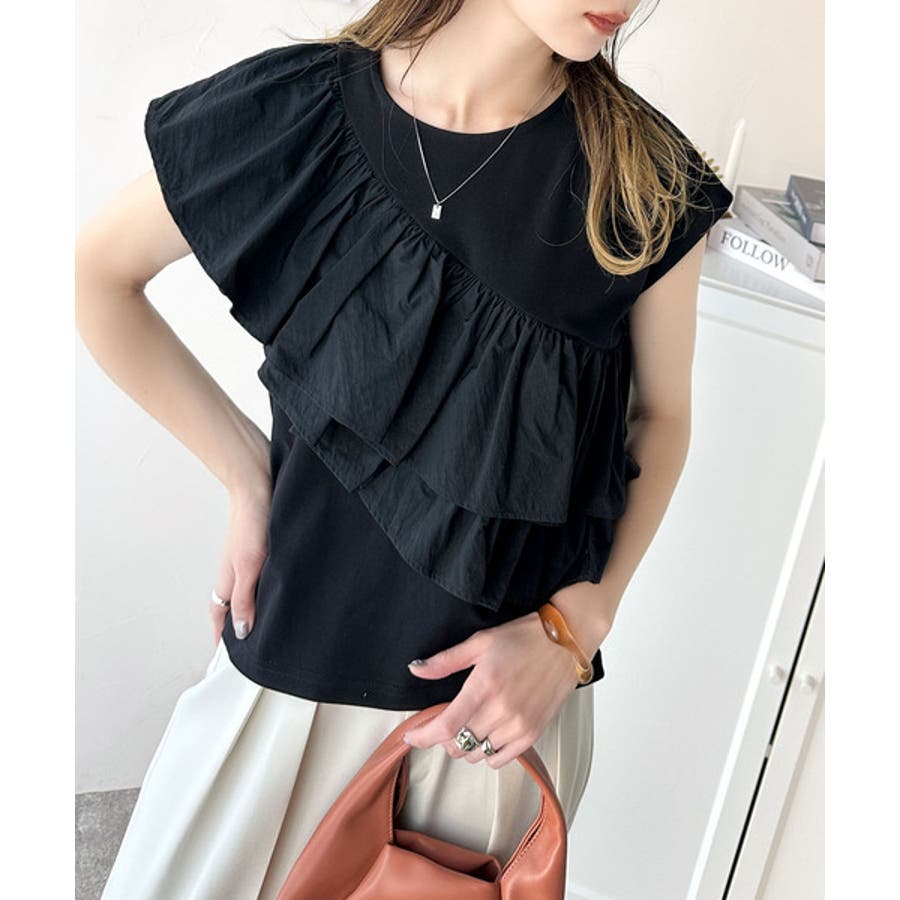 一枚で着映える♪異素材ドッキングアシメトリーラッフルデザインフレンチスリーブカッ…