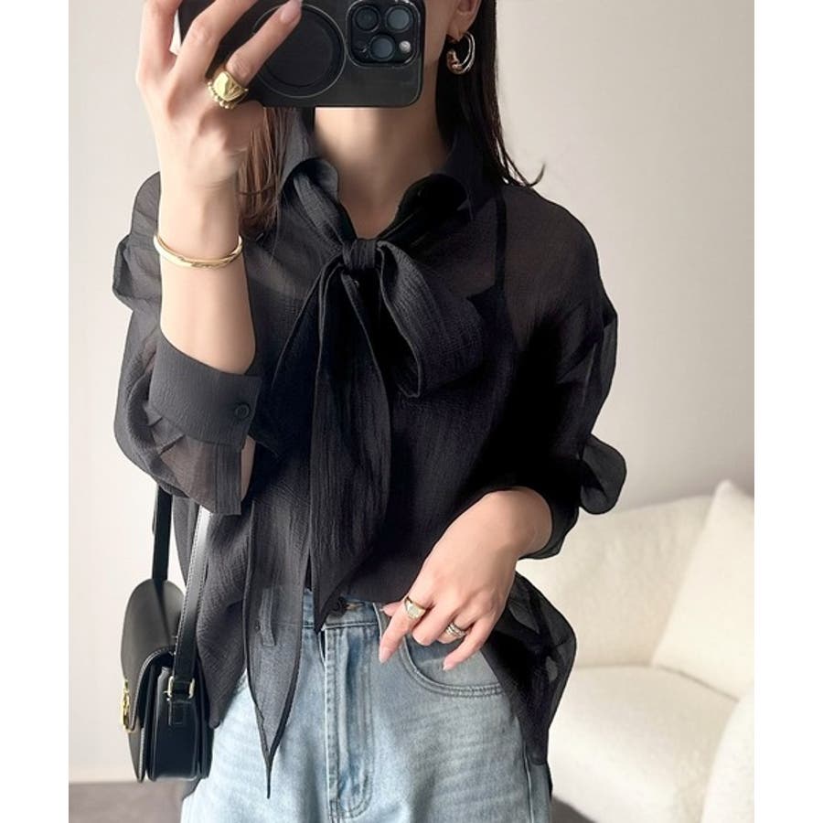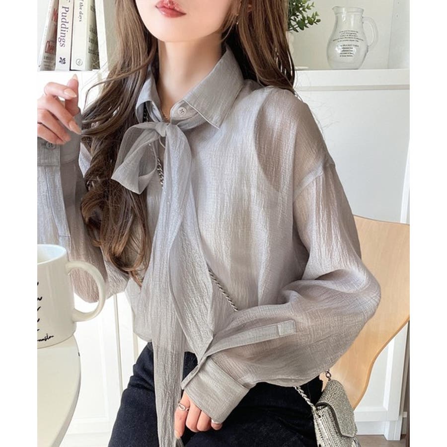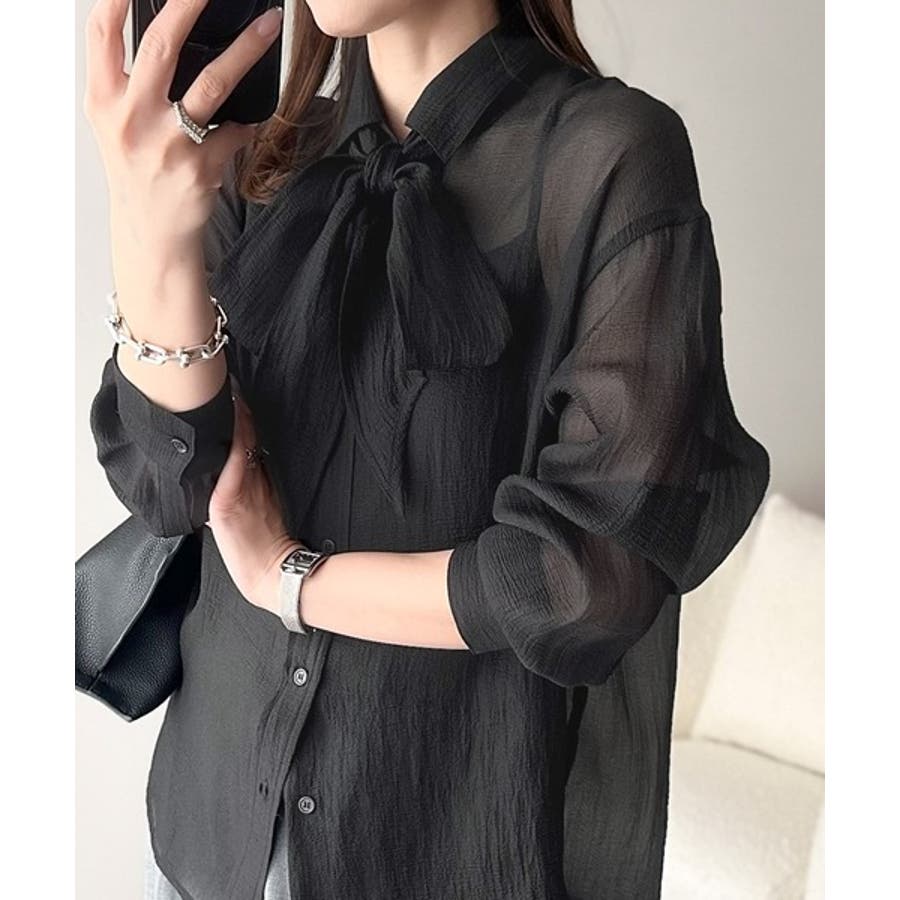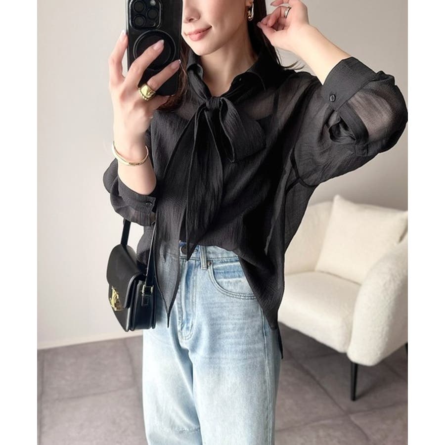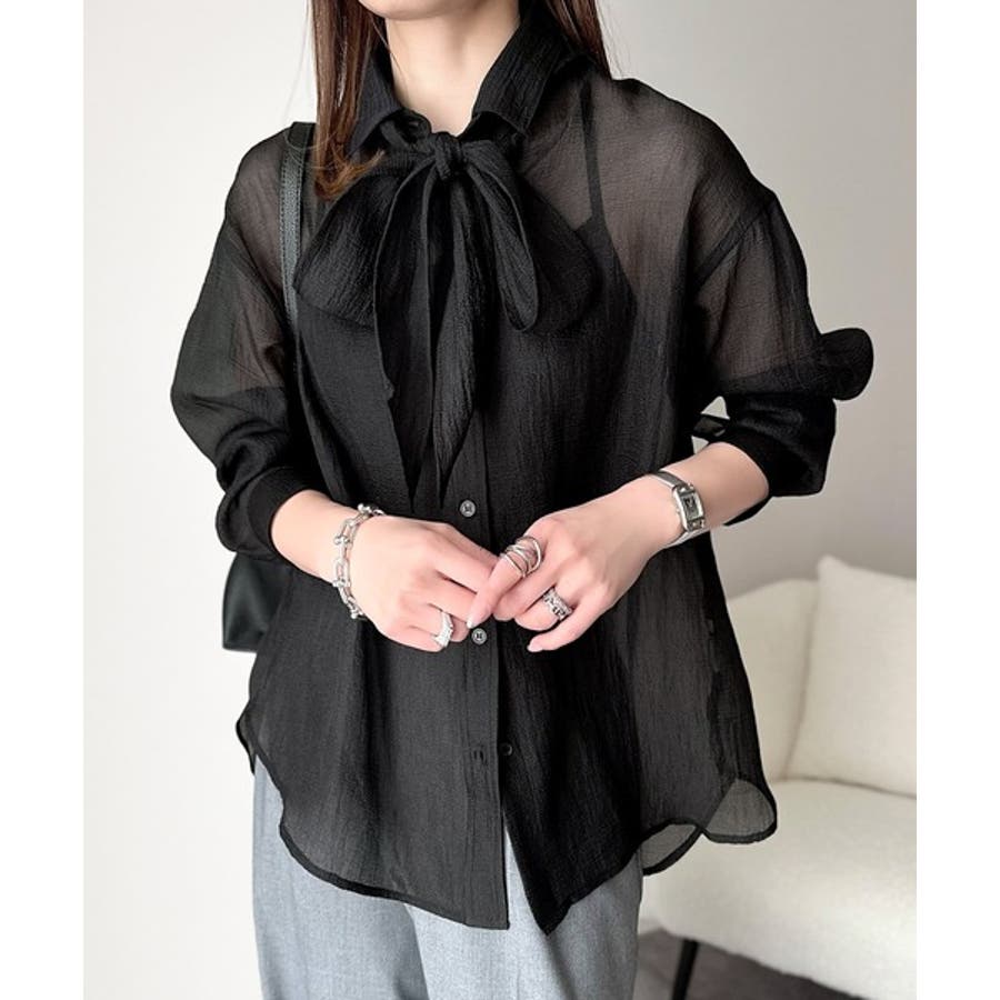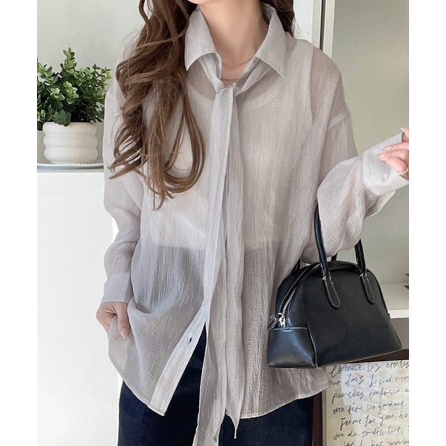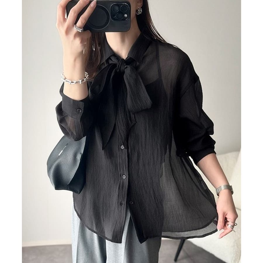 このリボンタイ付きシアーシャツは、カジュアルにもエレガントにもスタイリングが楽しめる優れもの♪
