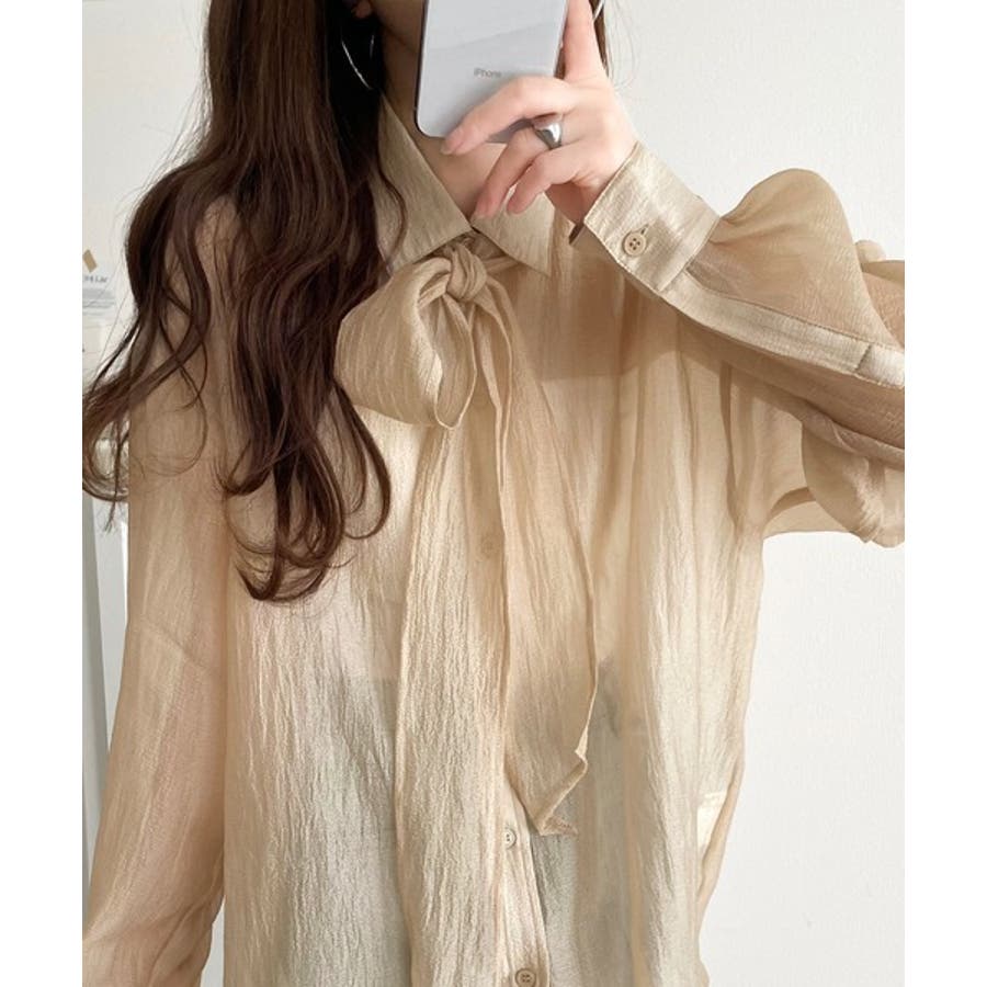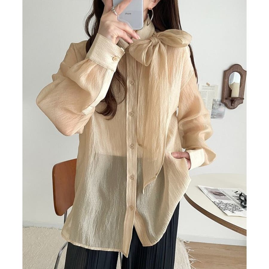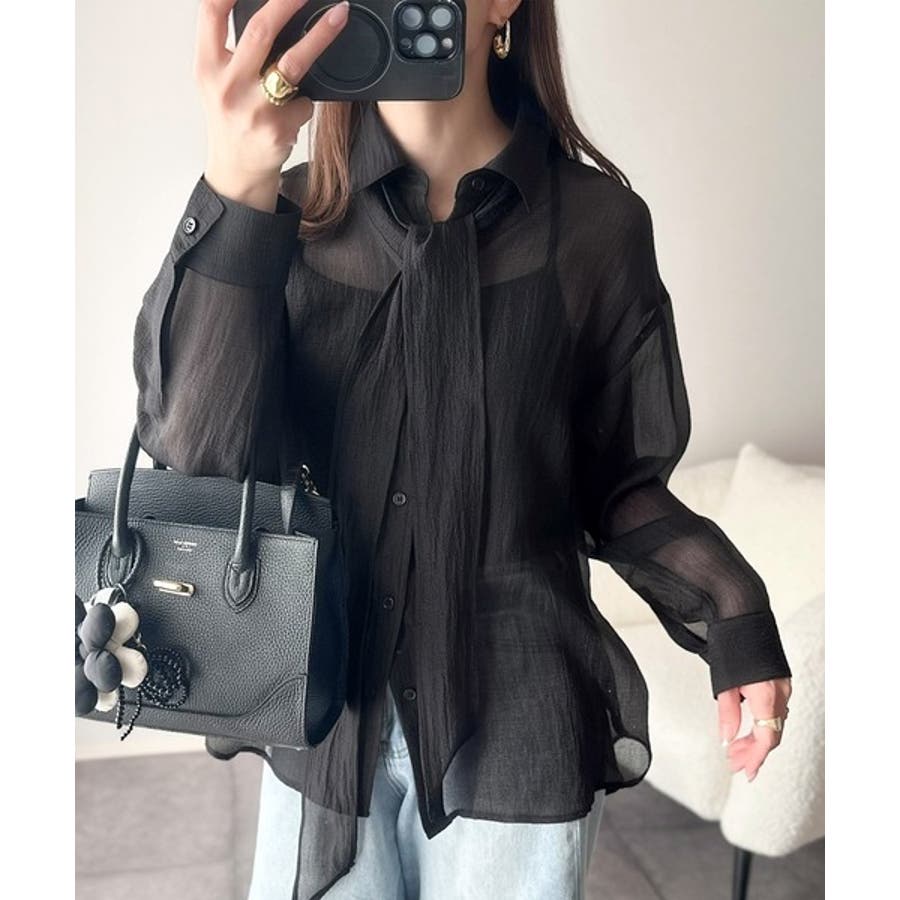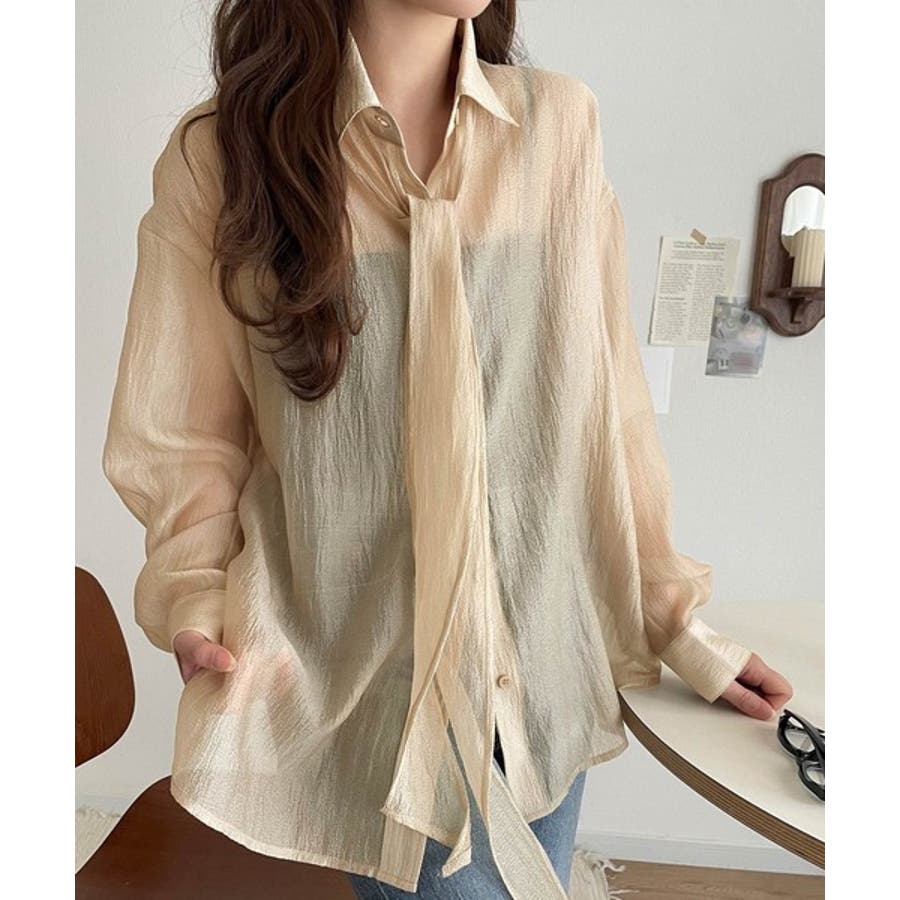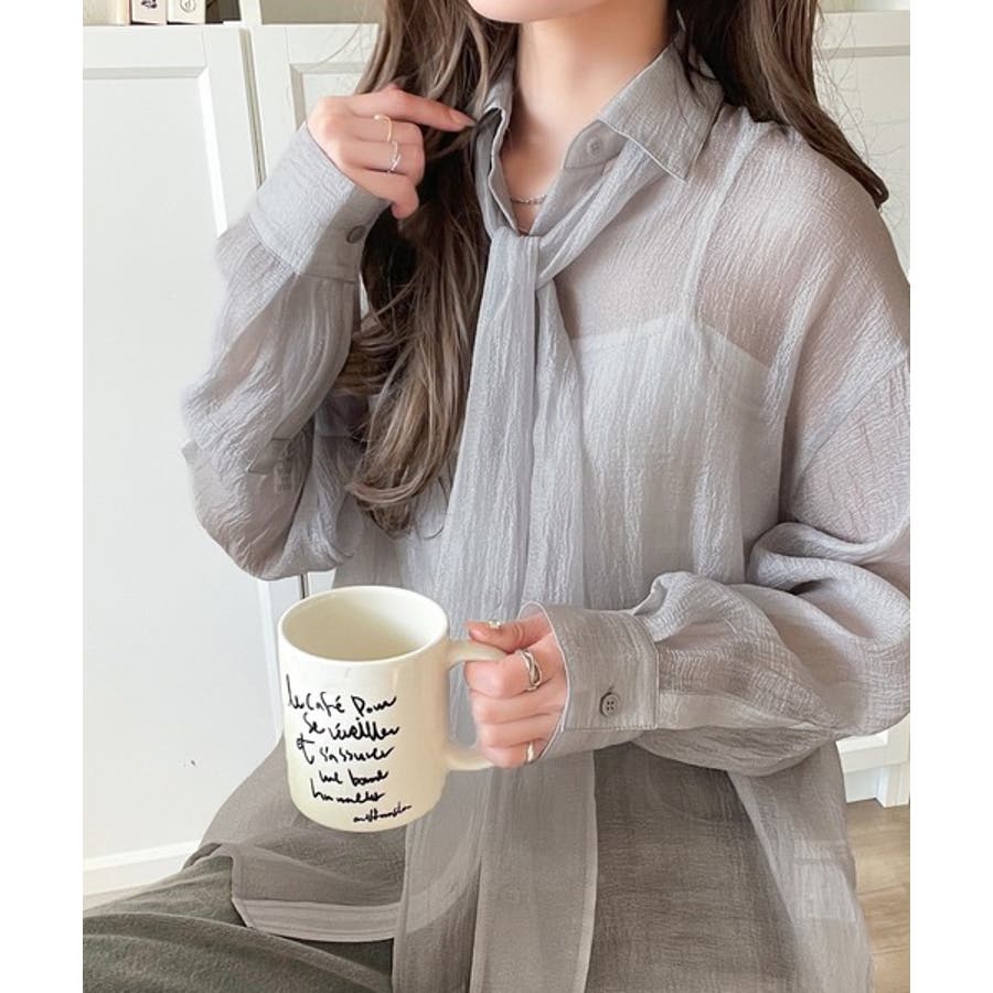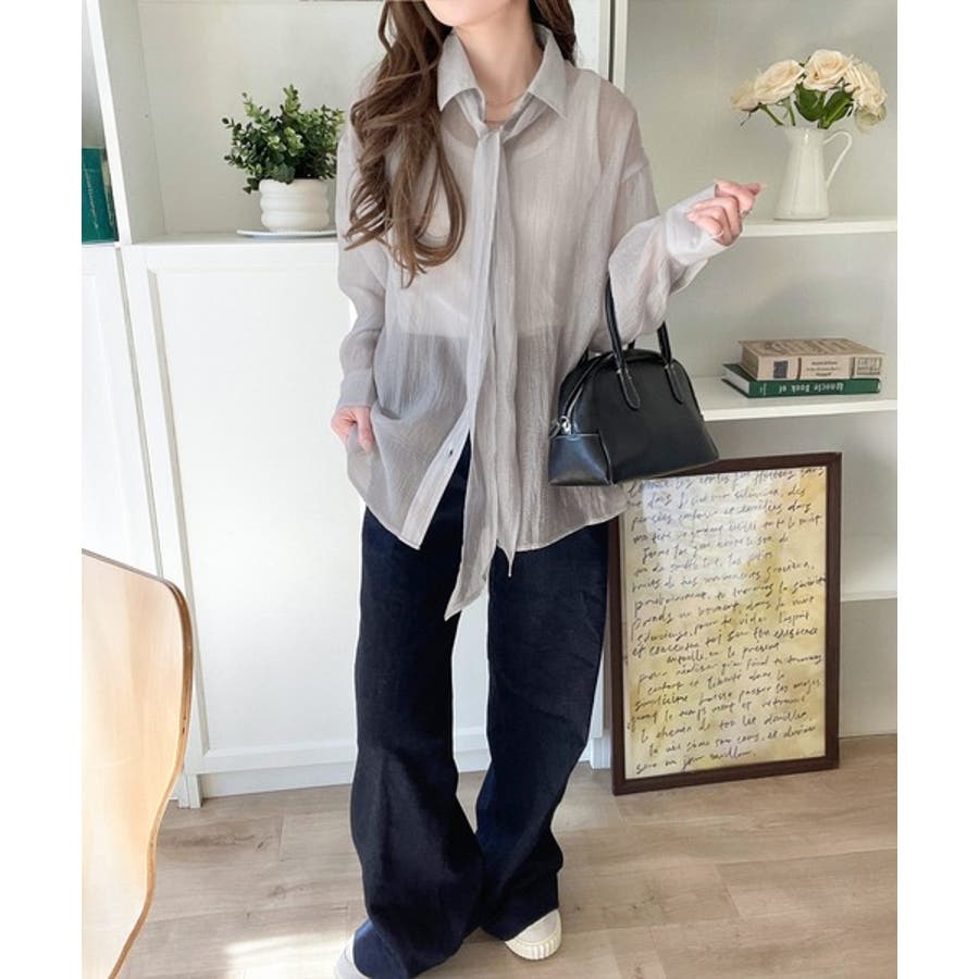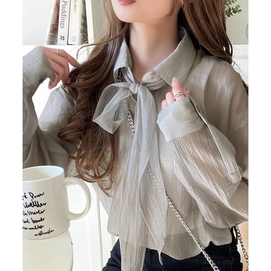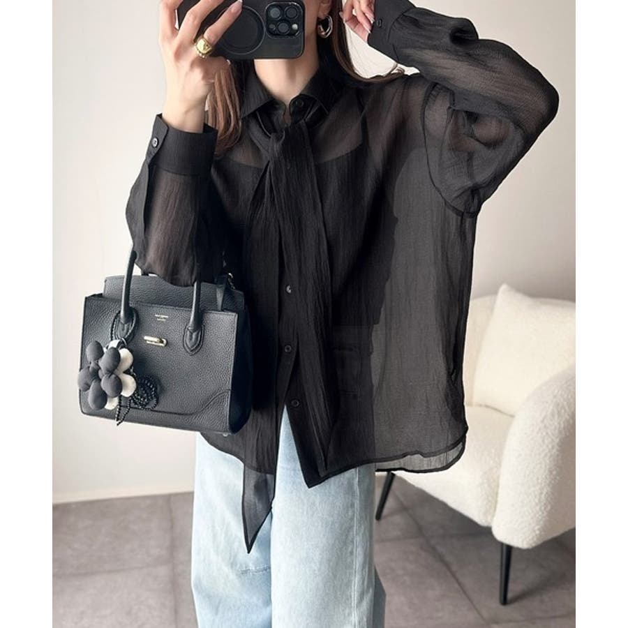 このリボンタイ付きシアーシャツは、カジュアルにもエレガントにもスタイリングが楽しめる優れもの♪