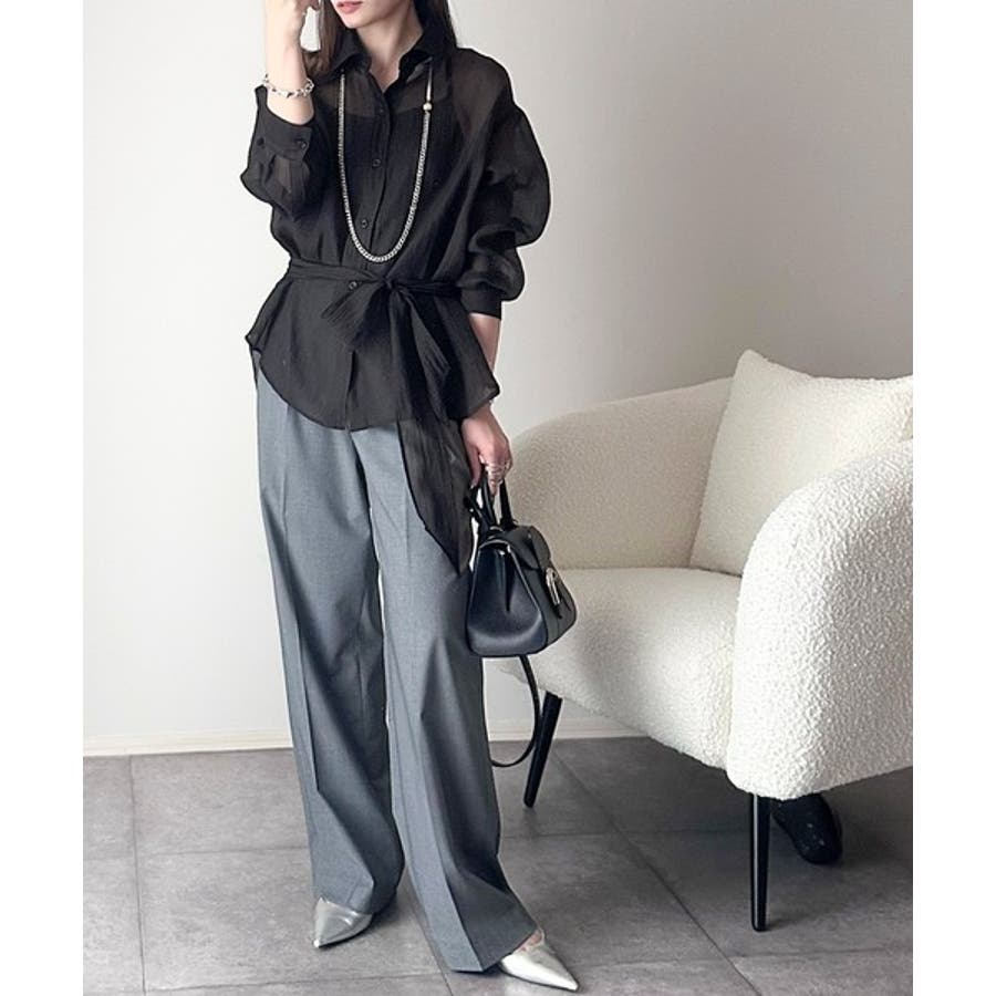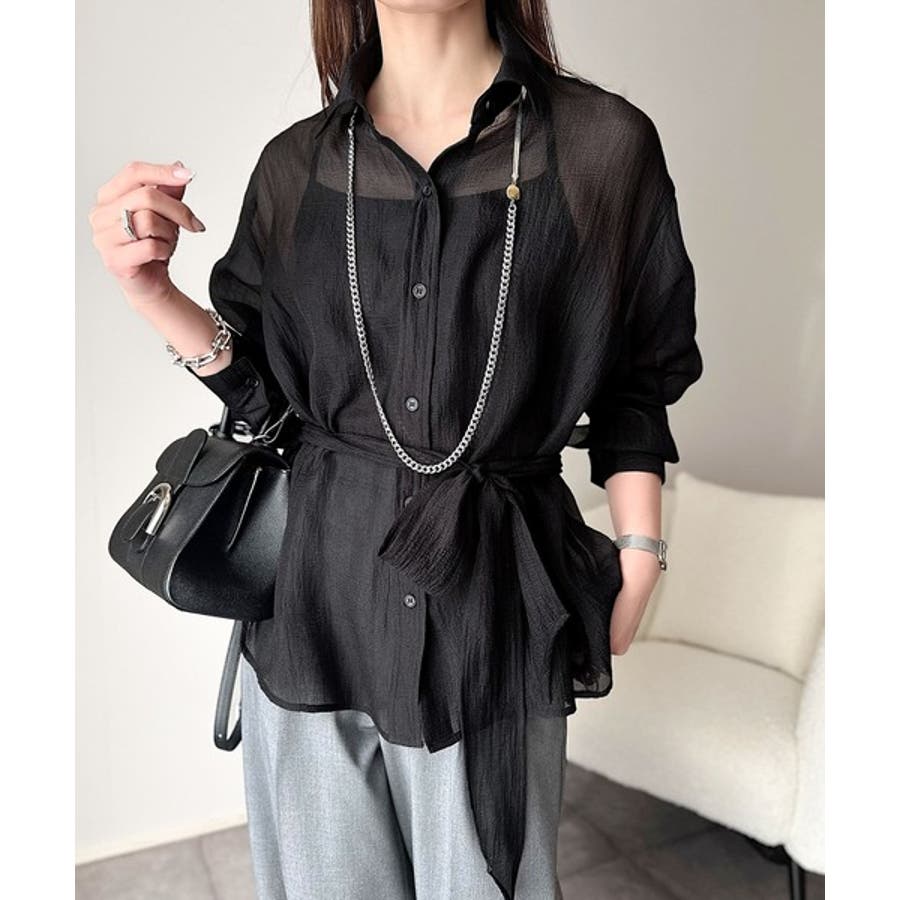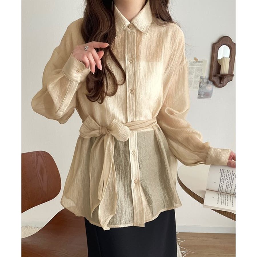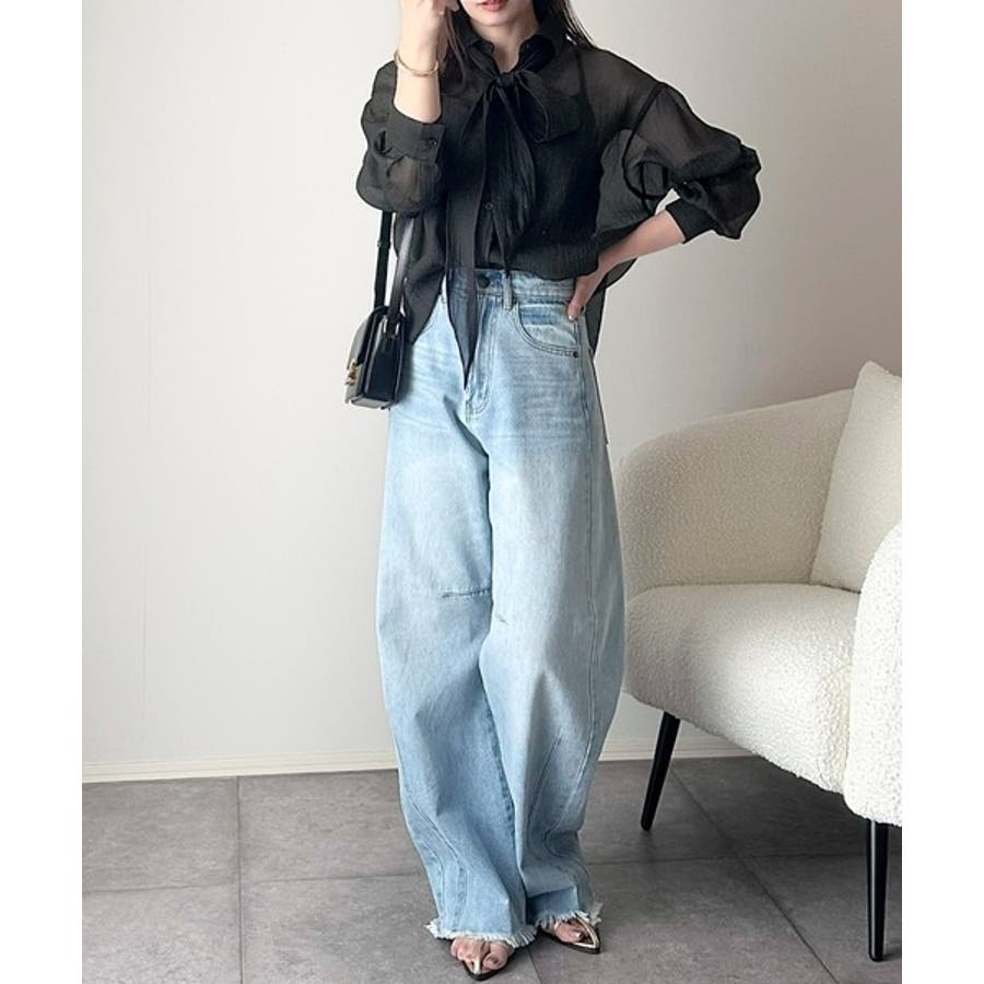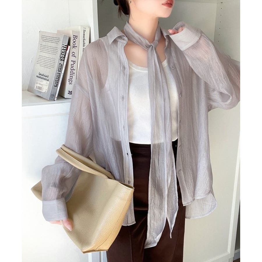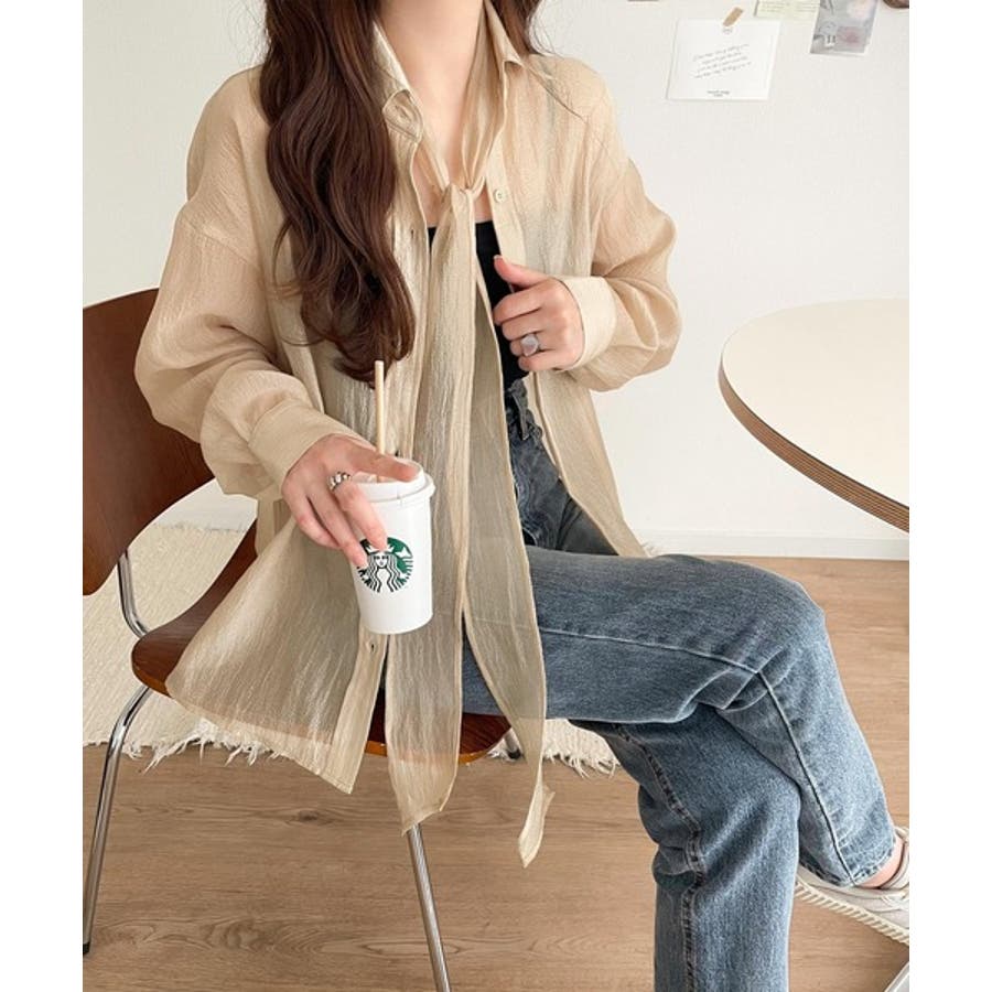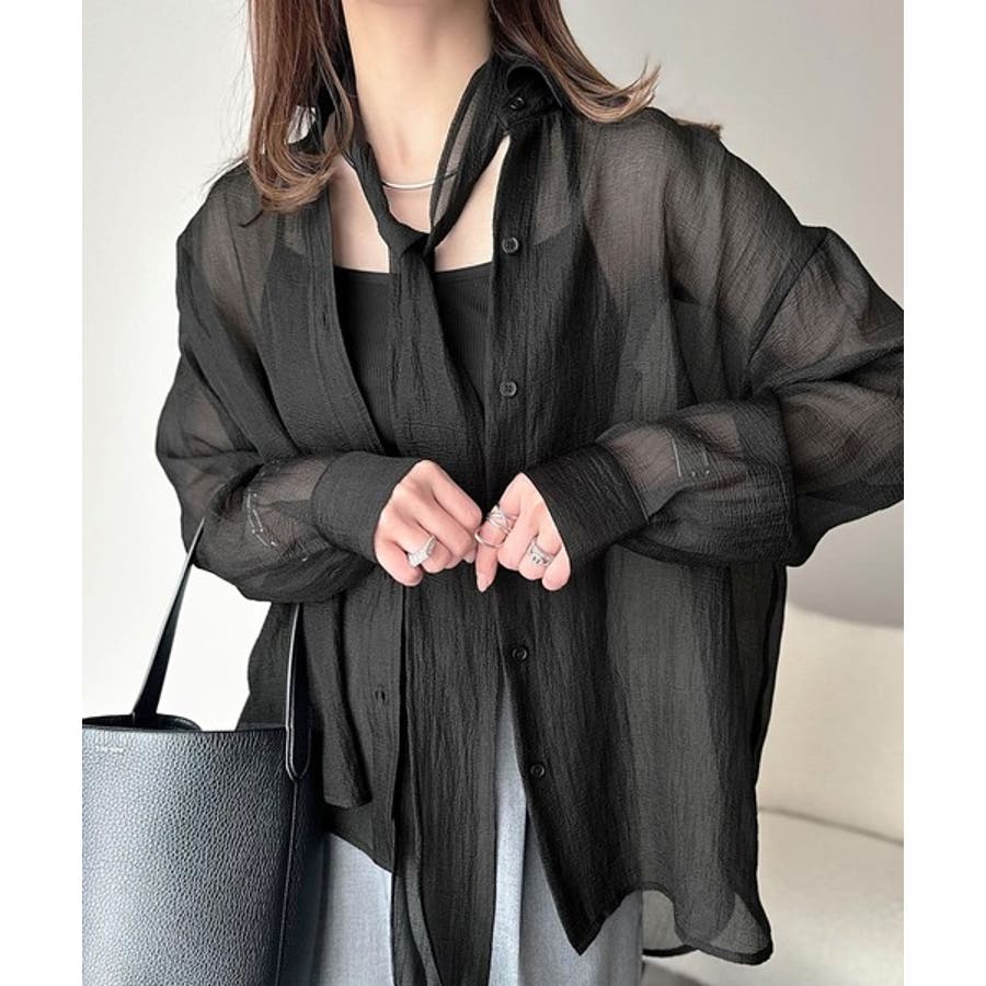 このリボンタイ付きシアーシャツは、カジュアルにもエレガントにもスタイリングが楽しめる優れもの♪