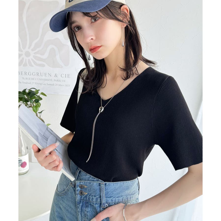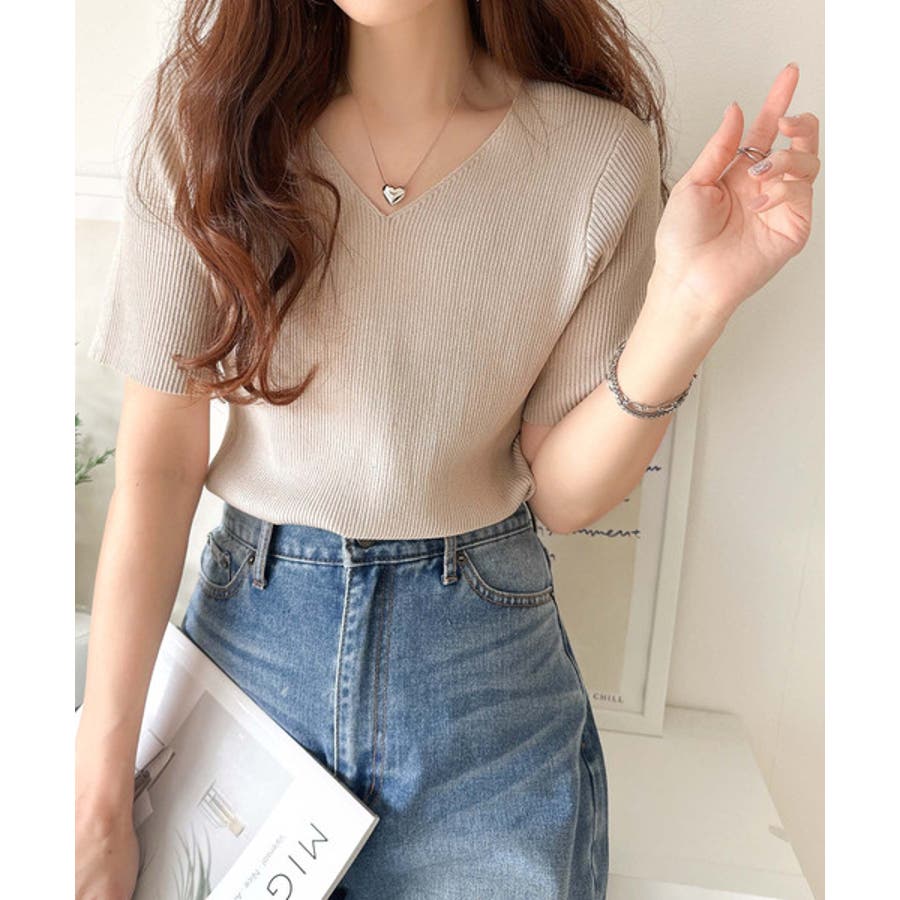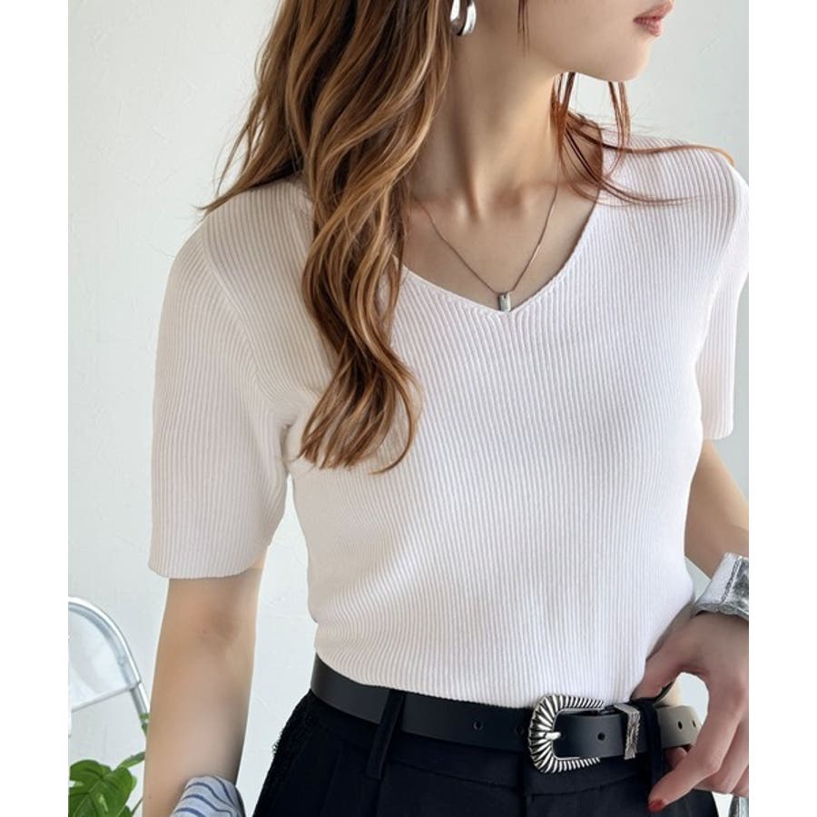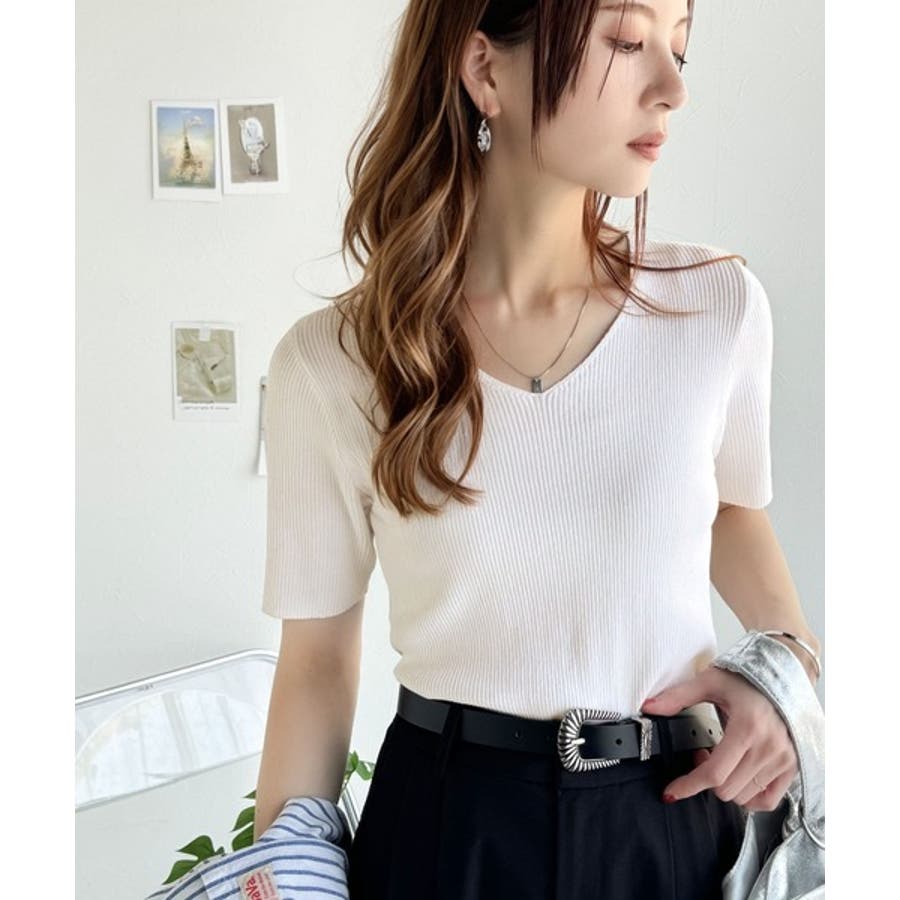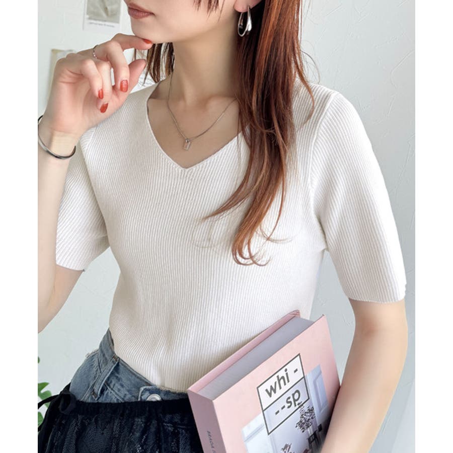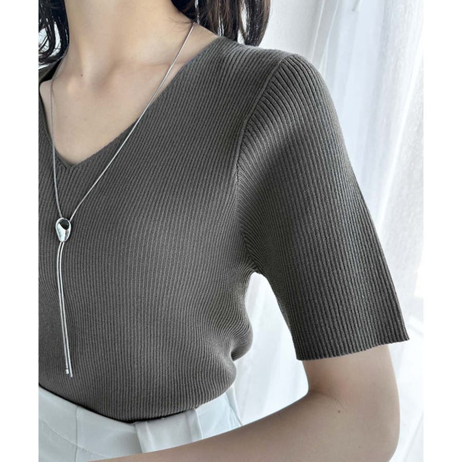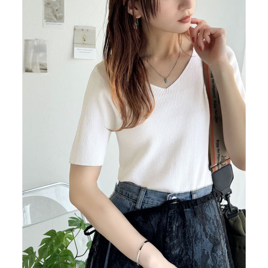 Vネックがシンプル上品な5分袖サマーリブニットで