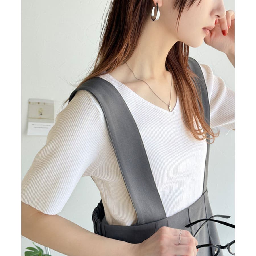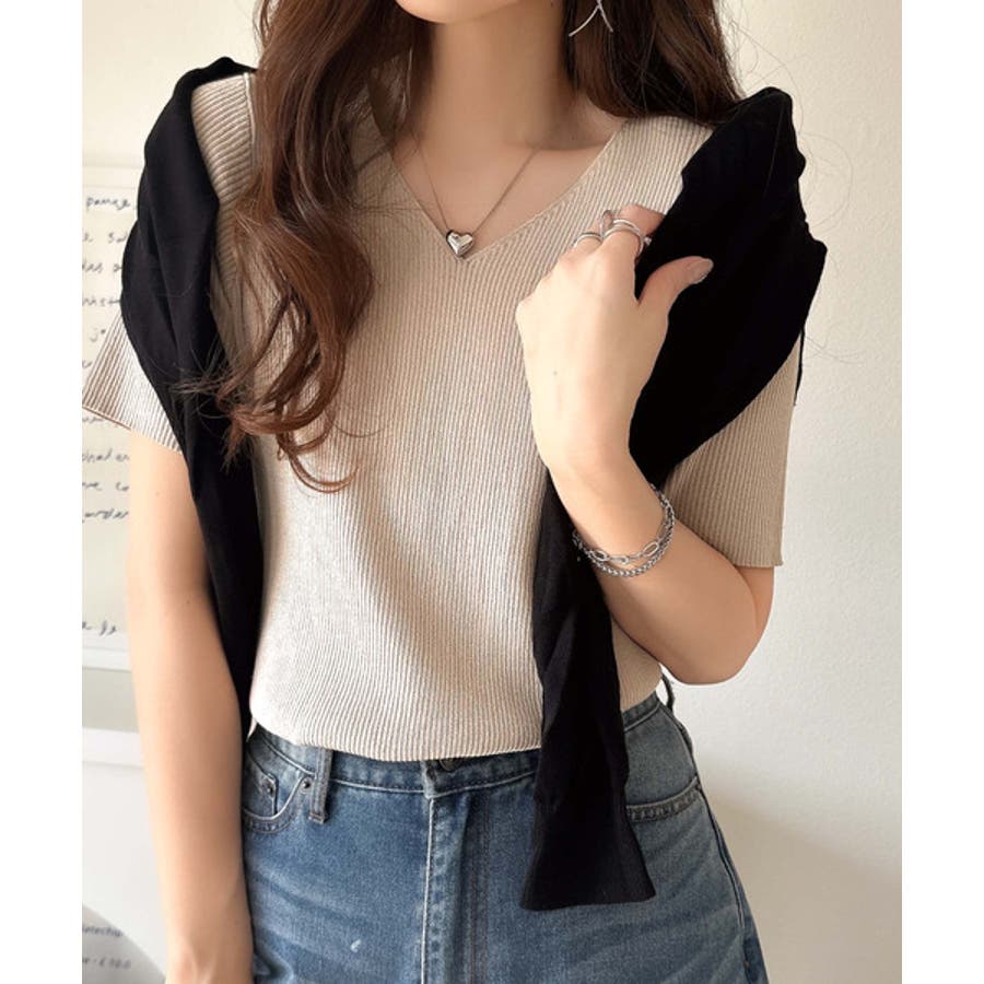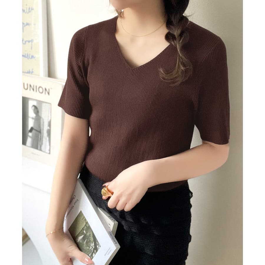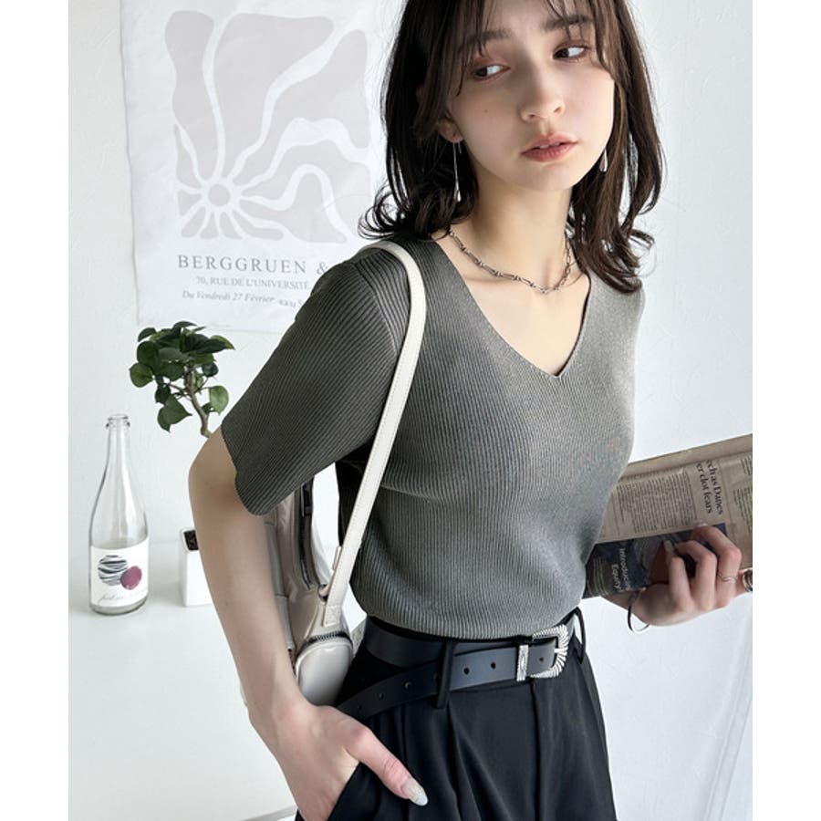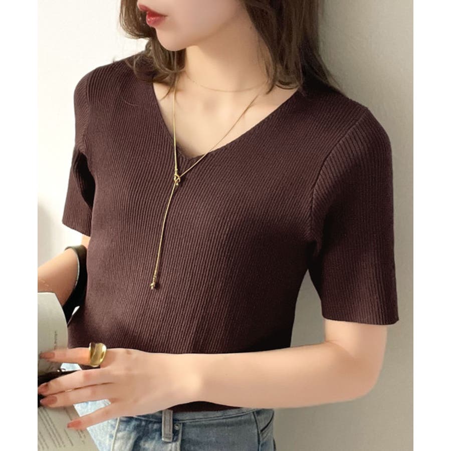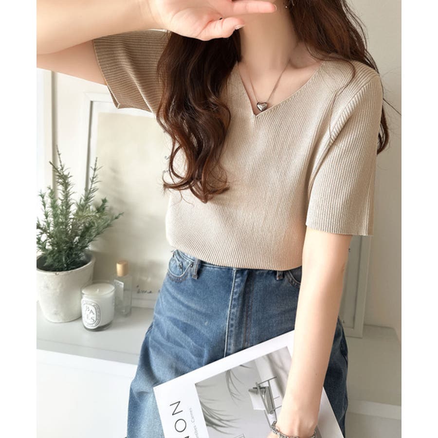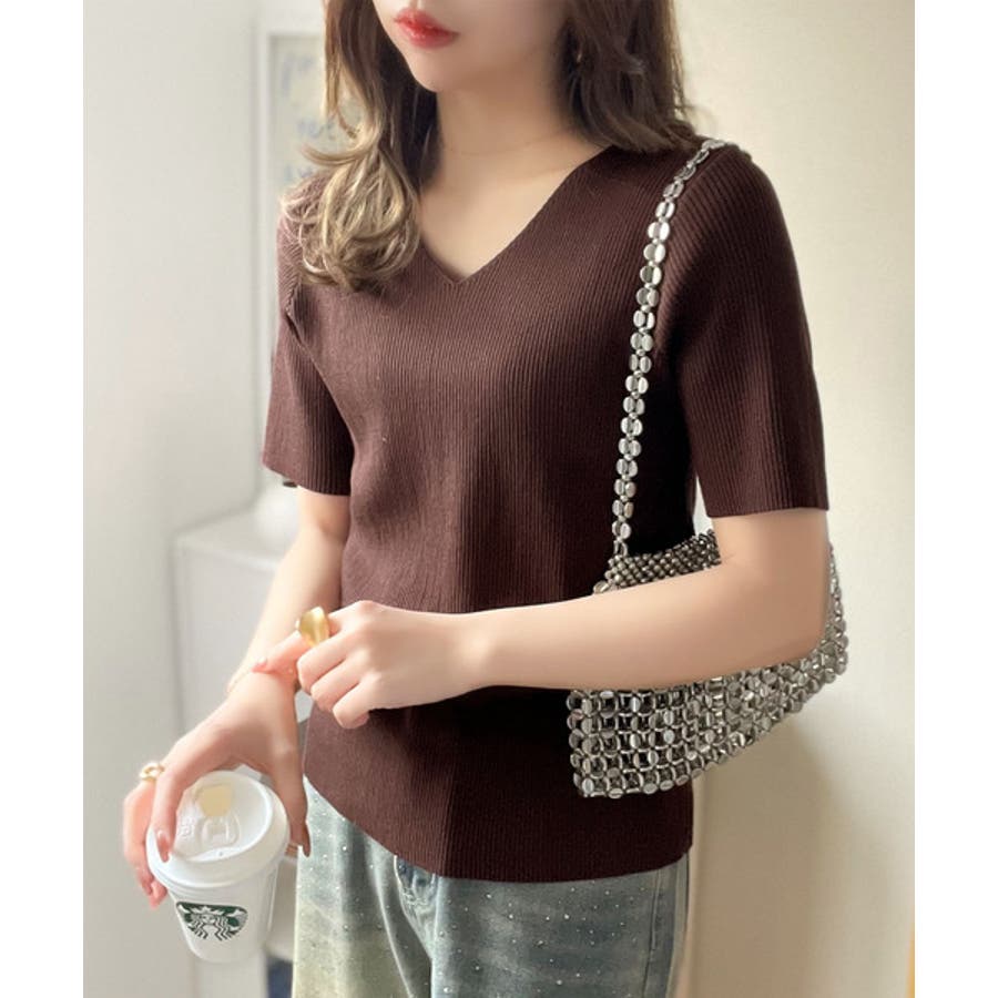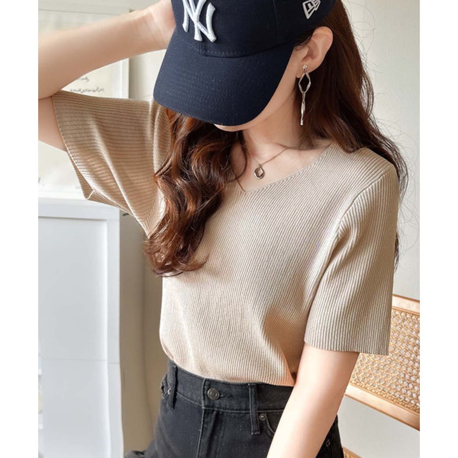 Vネックがシンプル上品な5分袖サマーリブニットで
