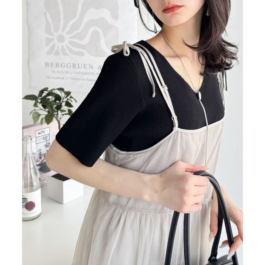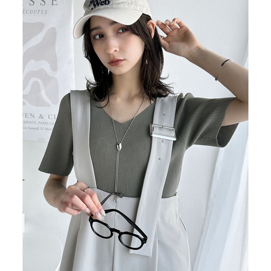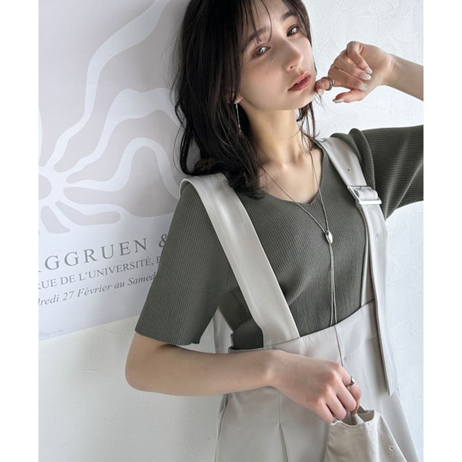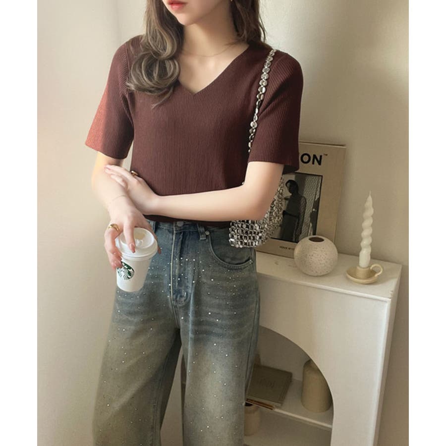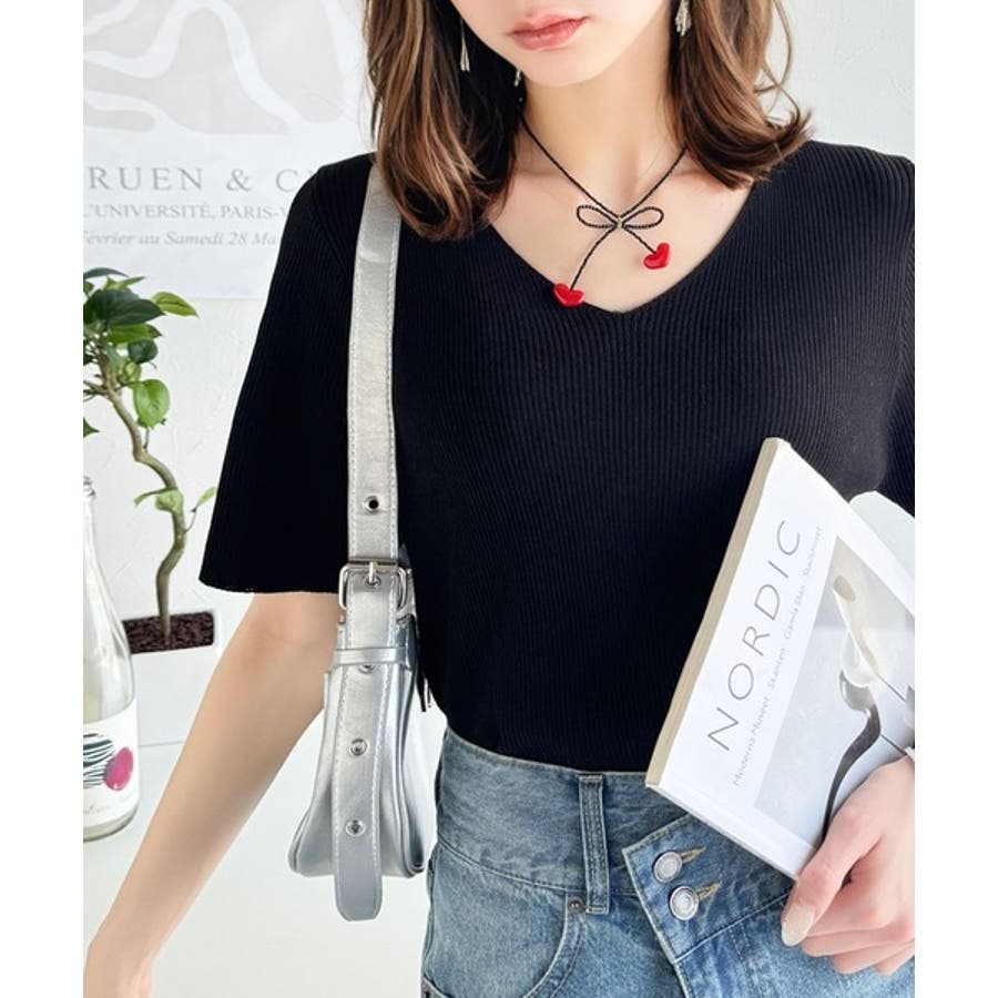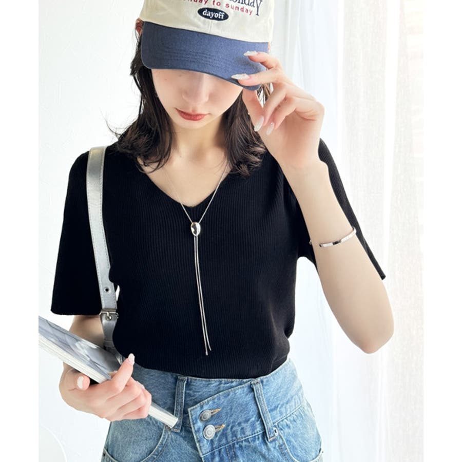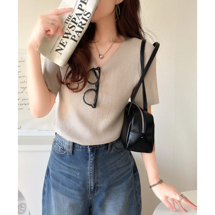 Vネックがシンプル上品な5分袖サマーリブニットで