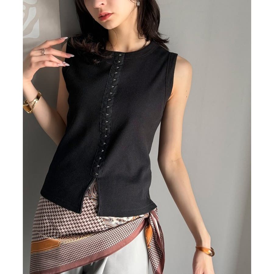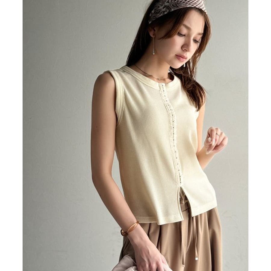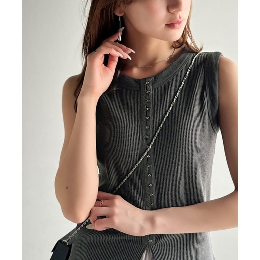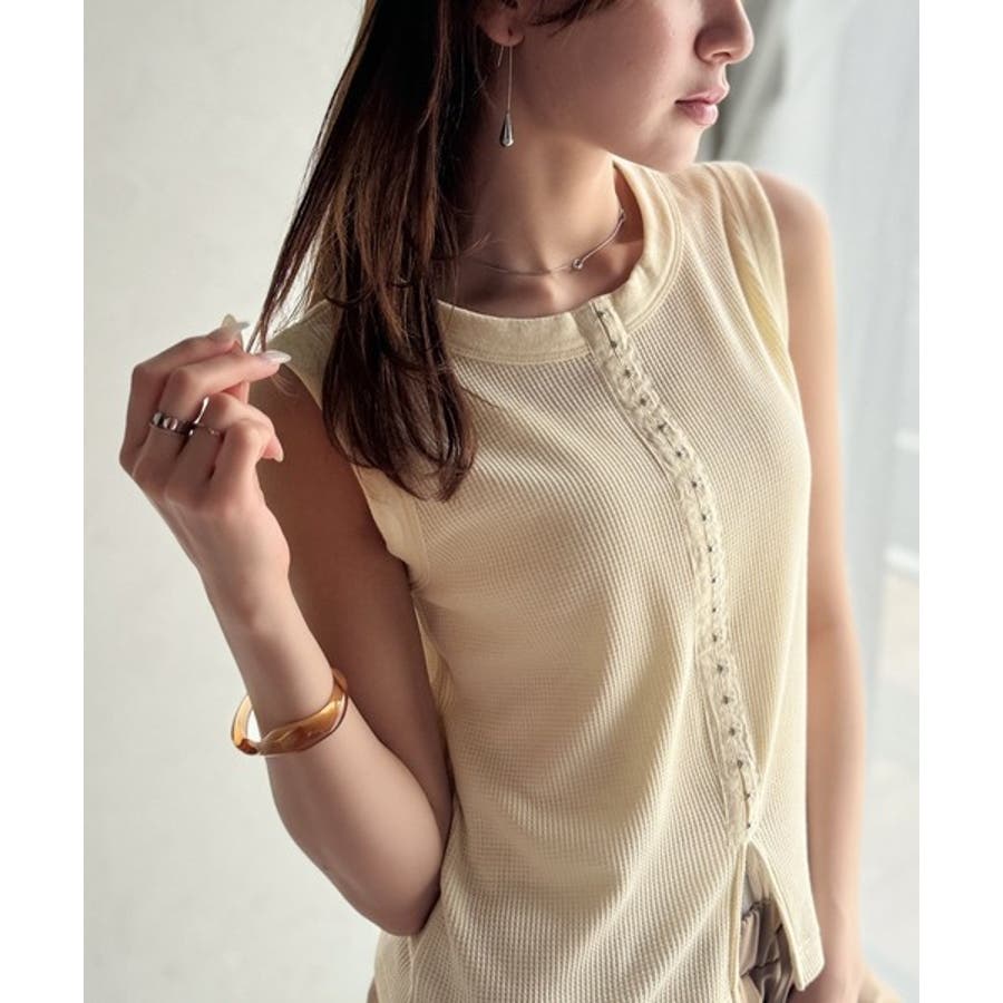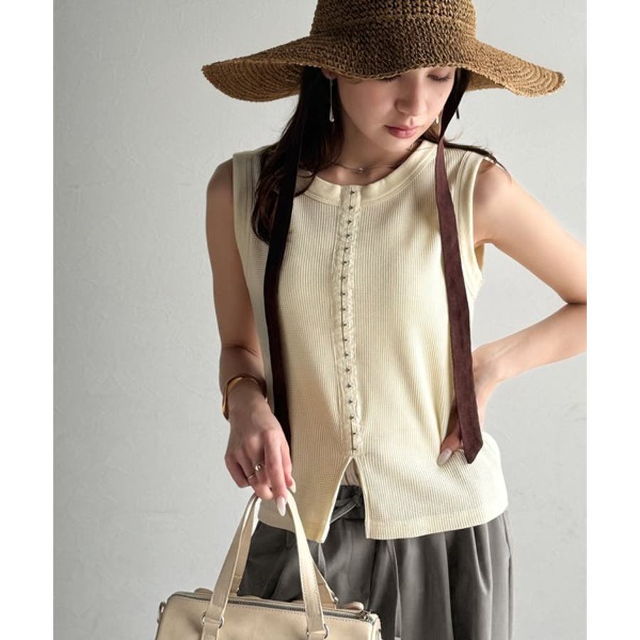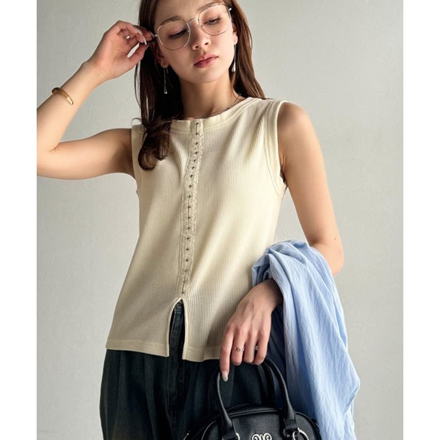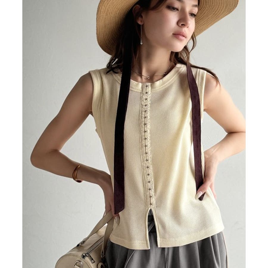軽やかに魅せる、今どきカジュアルの主役。フロントホックワッフルノースリーブトップ…