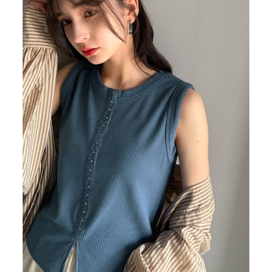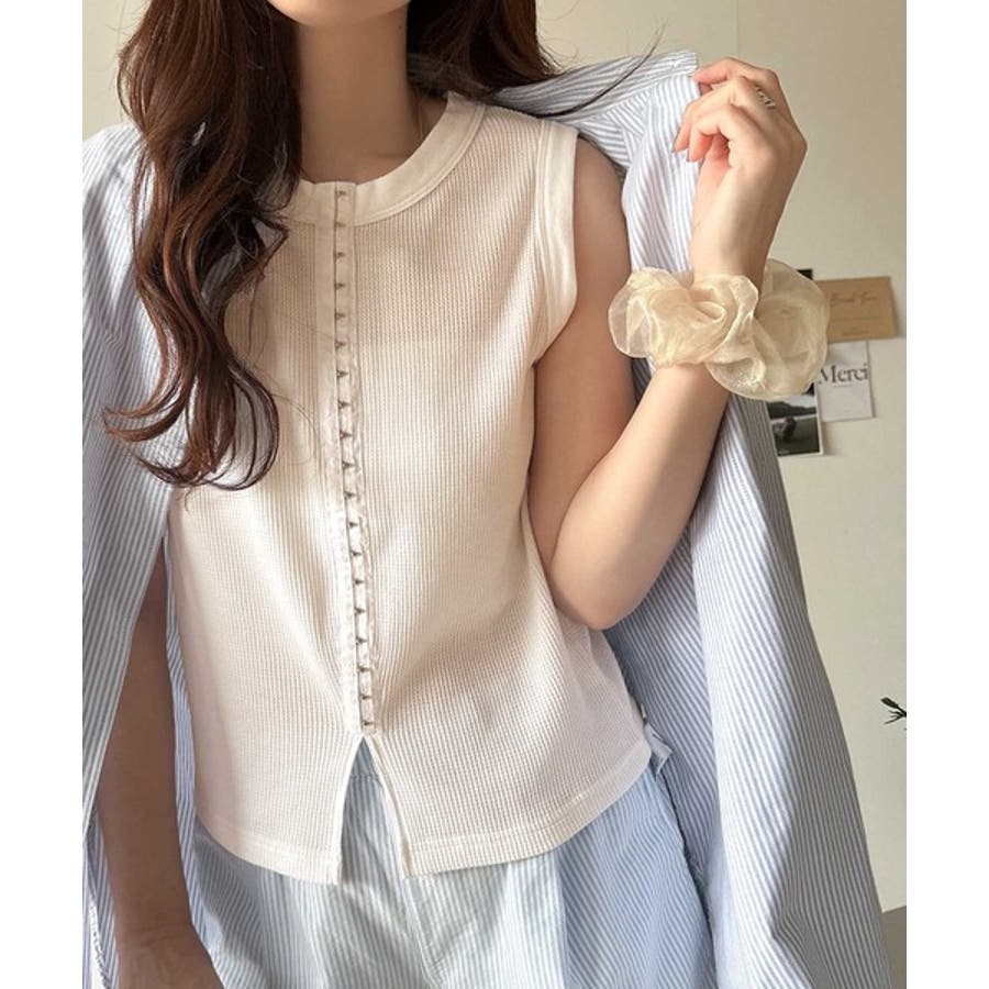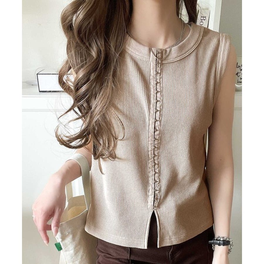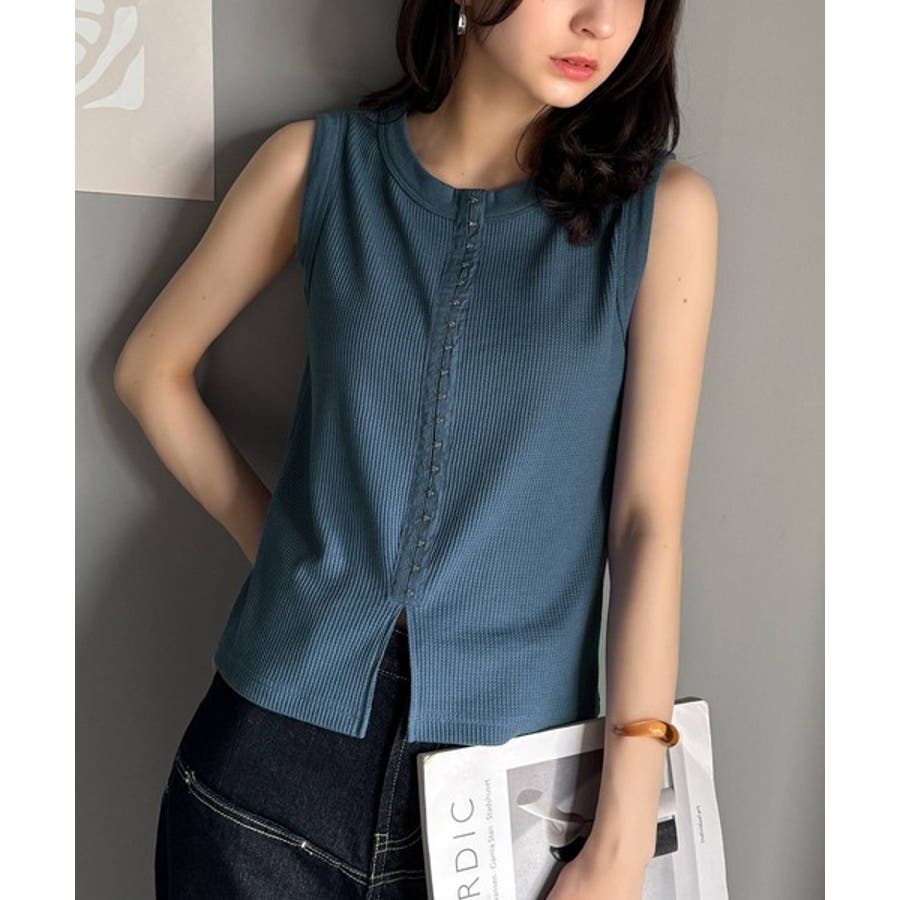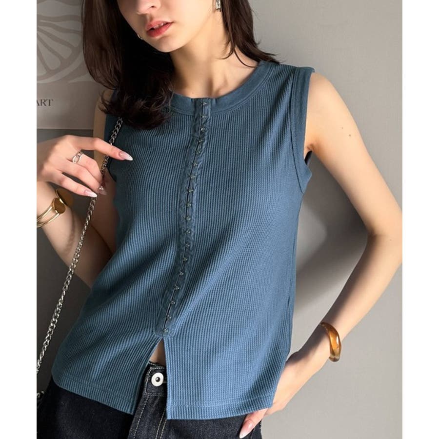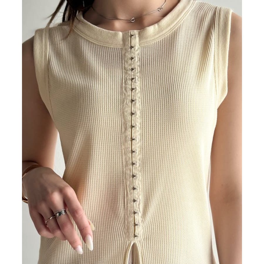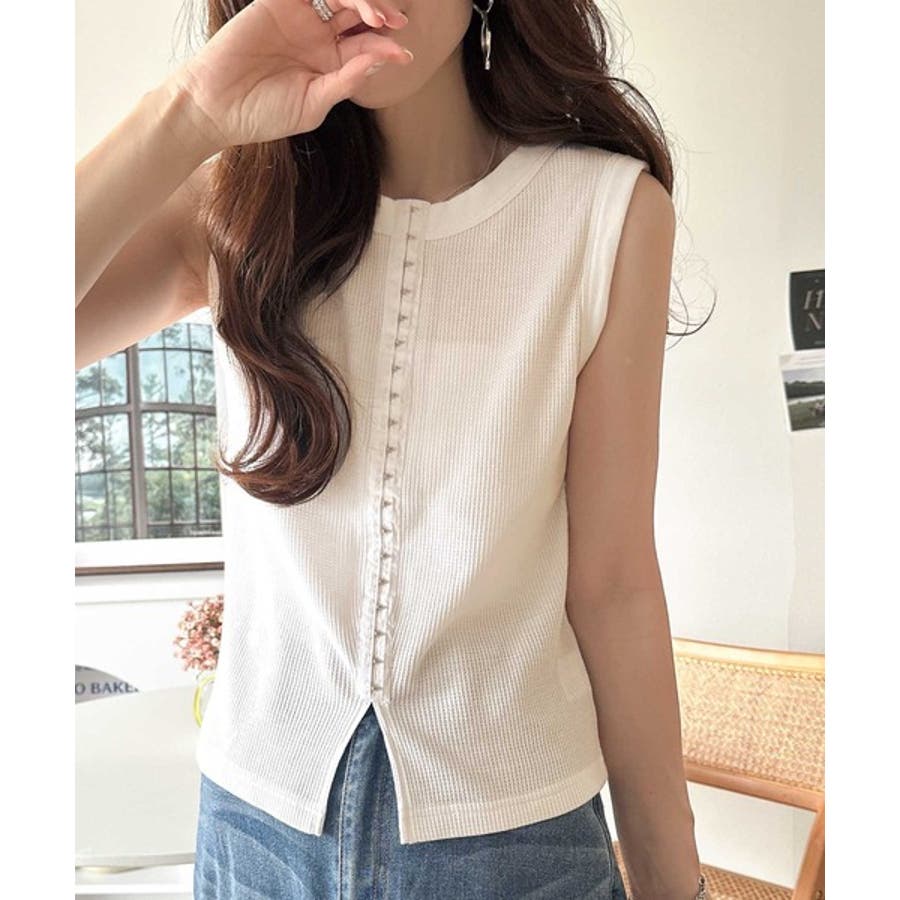 軽やかに魅せる、今どきカジュアルの主役。フロントホックワッフルノースリーブトップ…