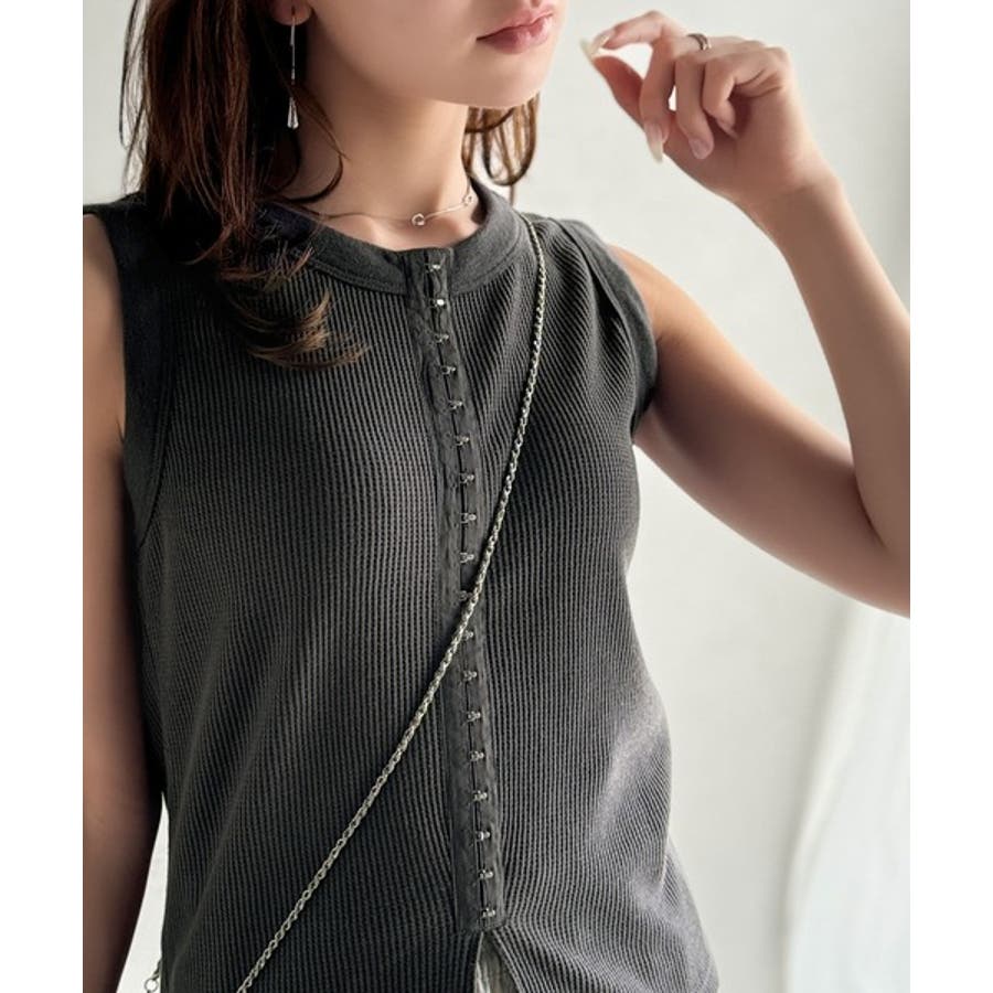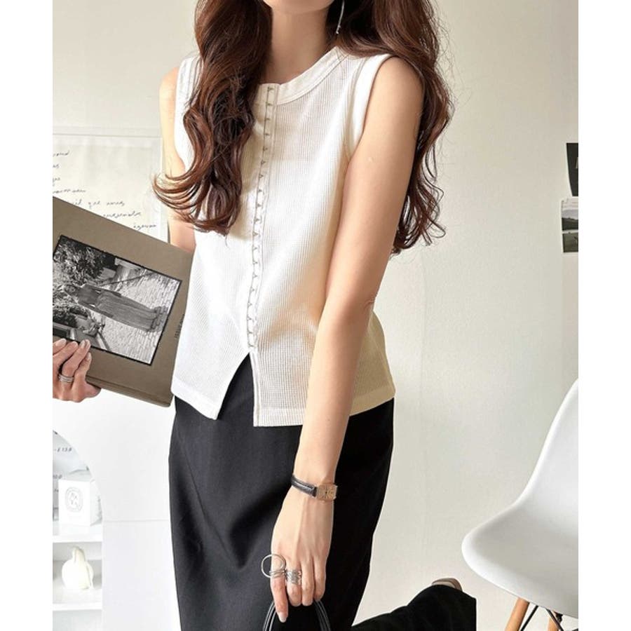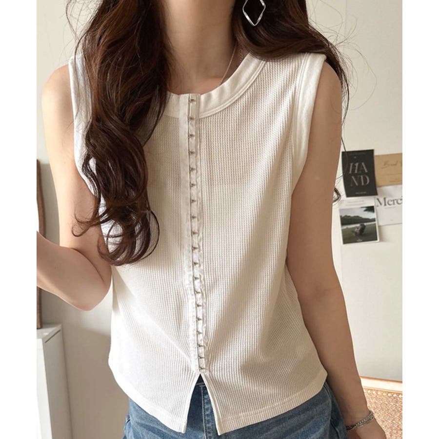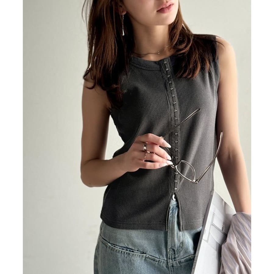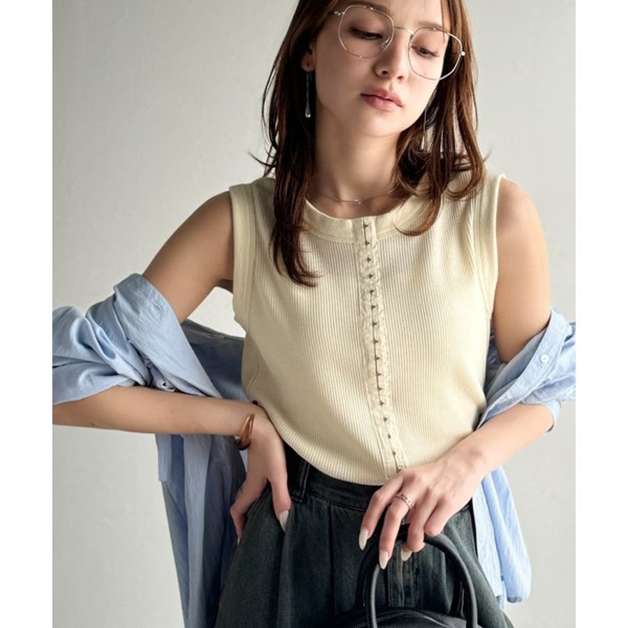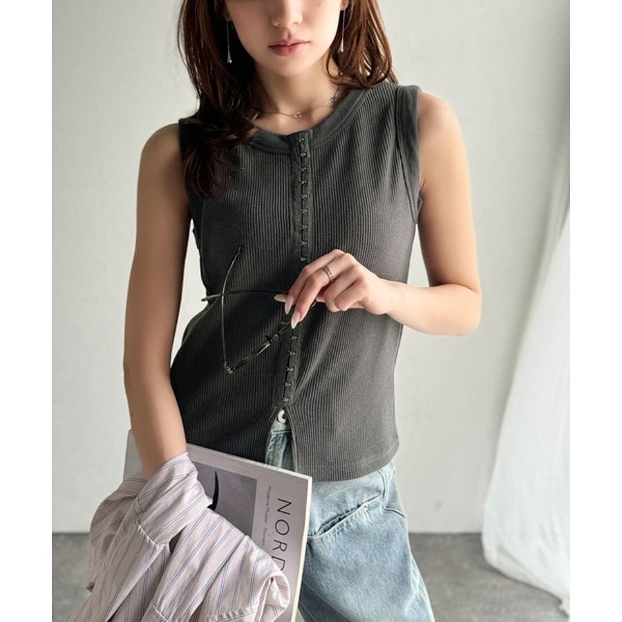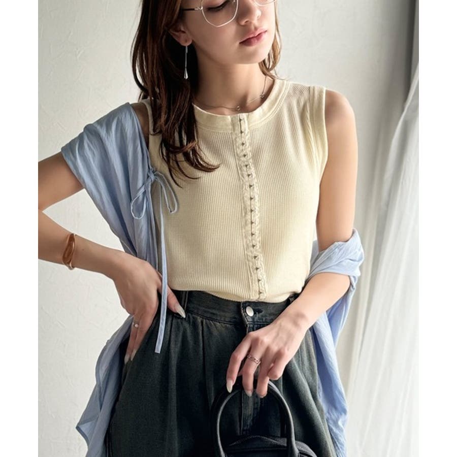 軽やかに魅せる、今どきカジュアルの主役。フロントホックワッフルノースリーブトップ…
