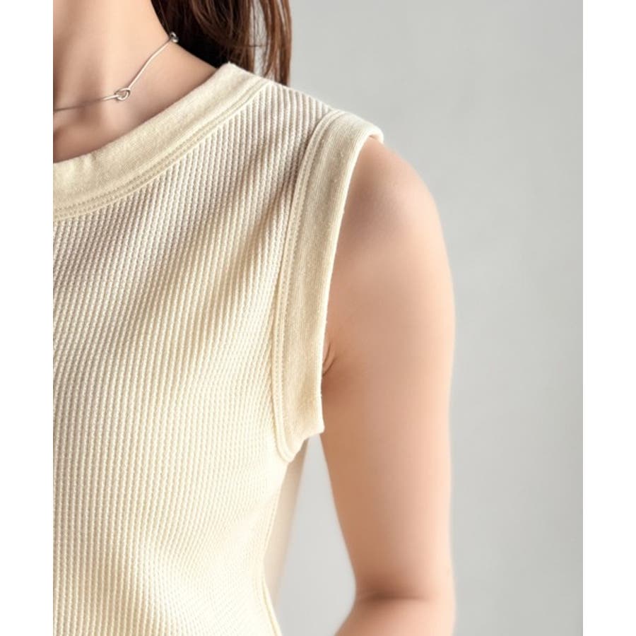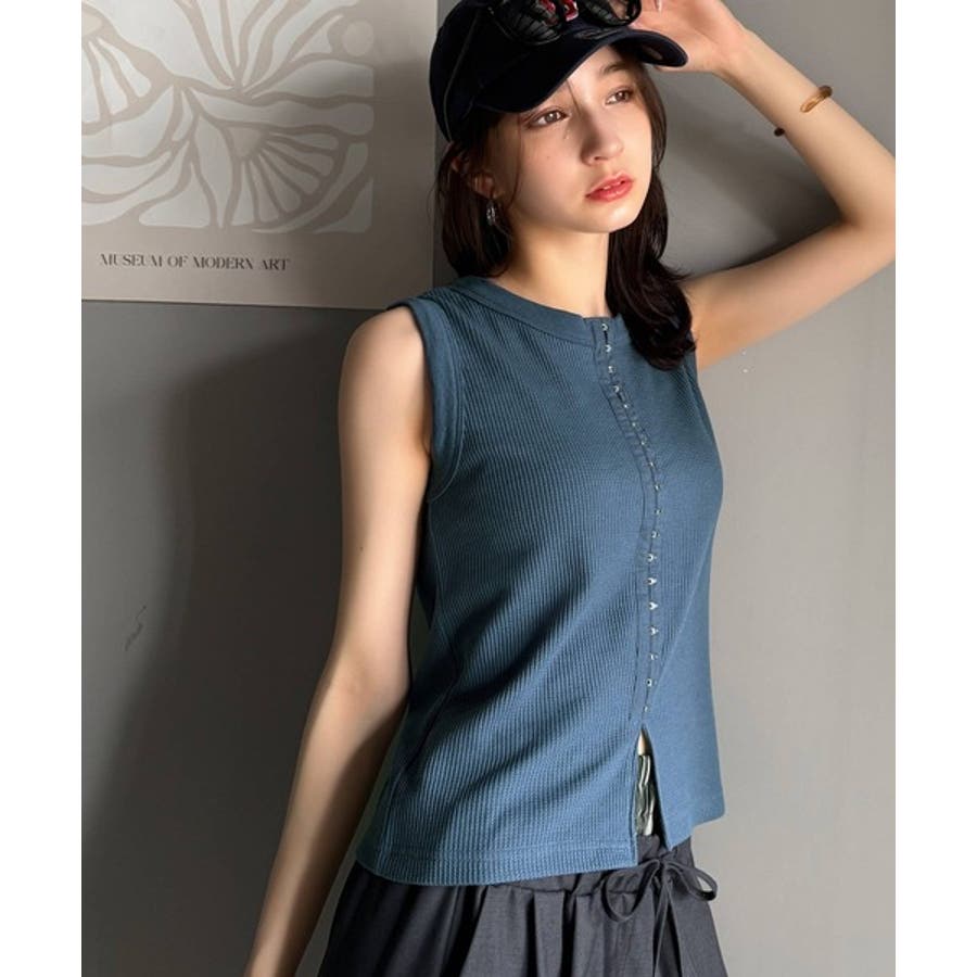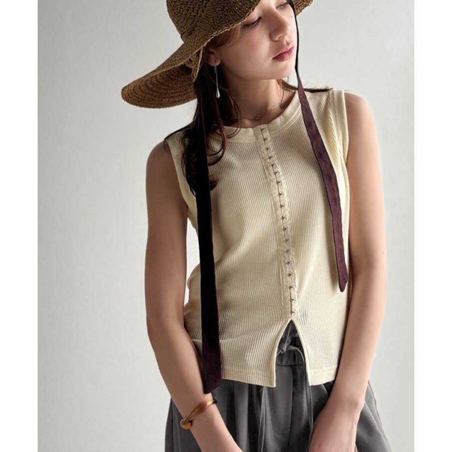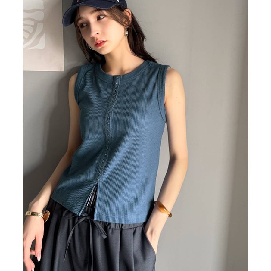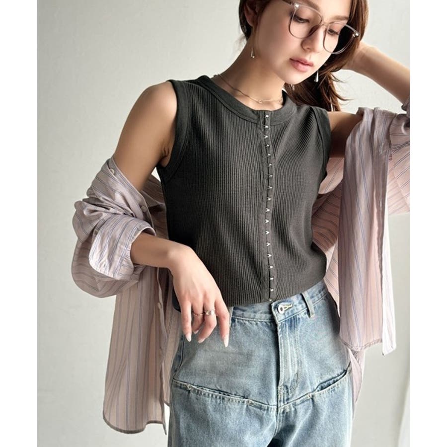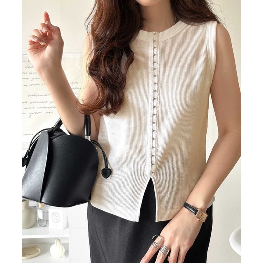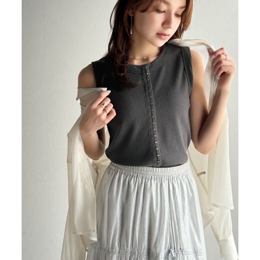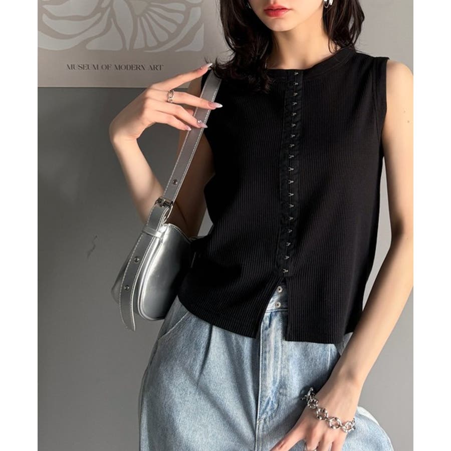 軽やかに魅せる、今どきカジュアルの主役。フロントホックワッフルノースリーブトップ…