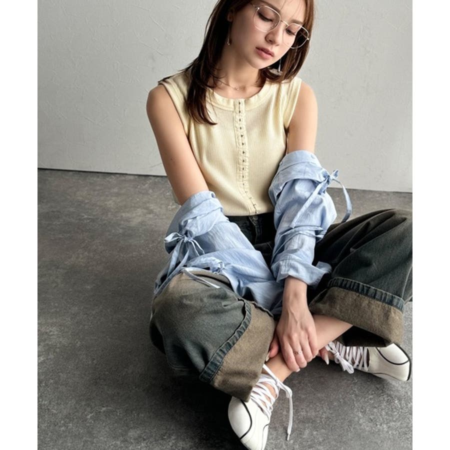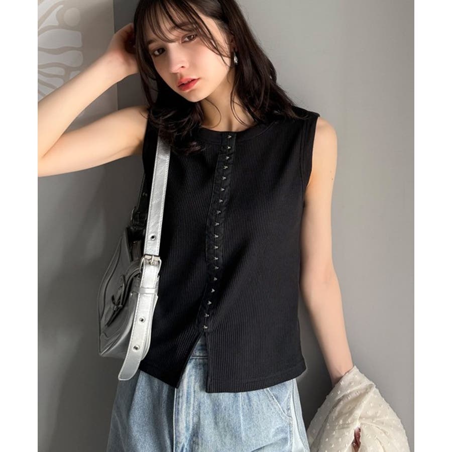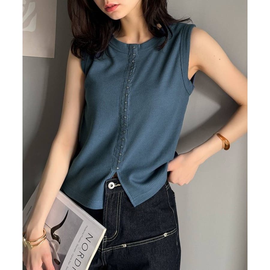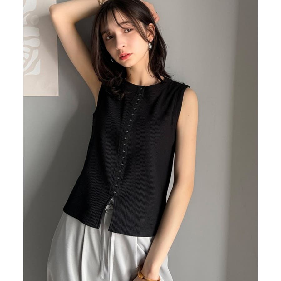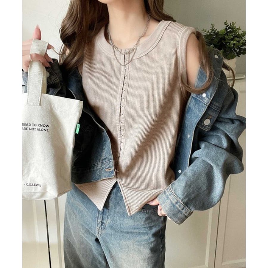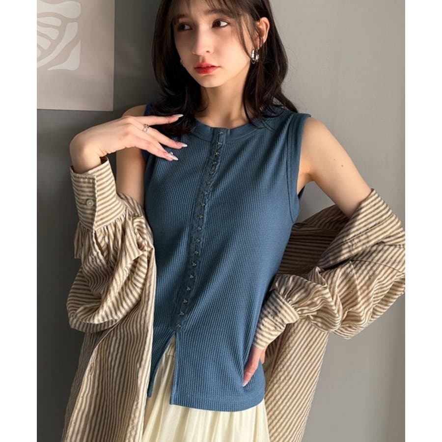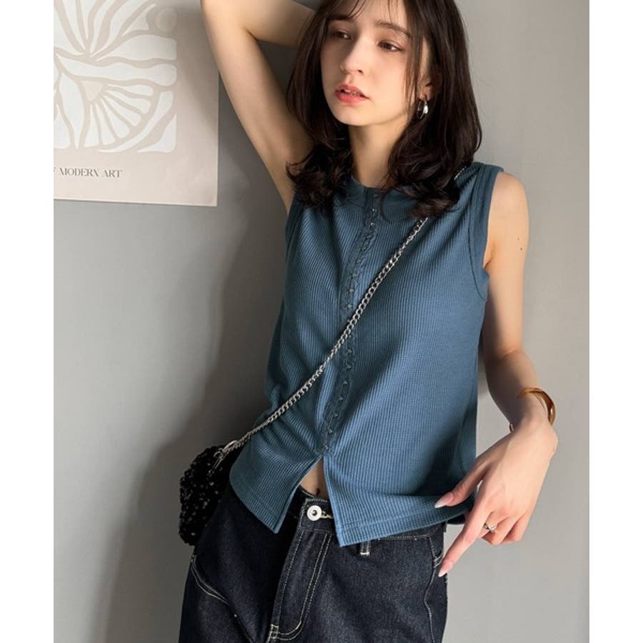 軽やかに魅せる、今どきカジュアルの主役。フロントホックワッフルノースリーブトップ…