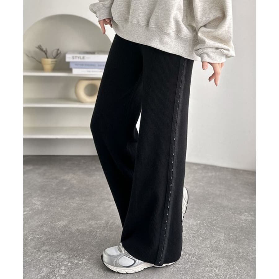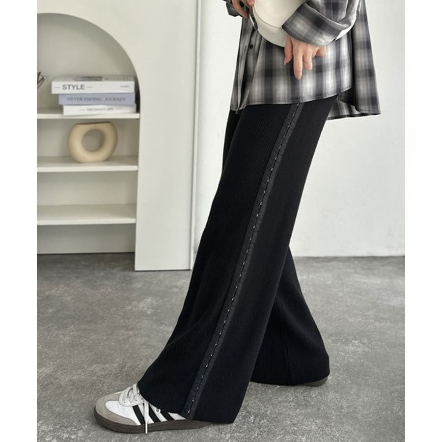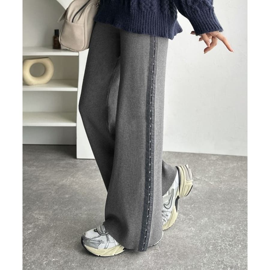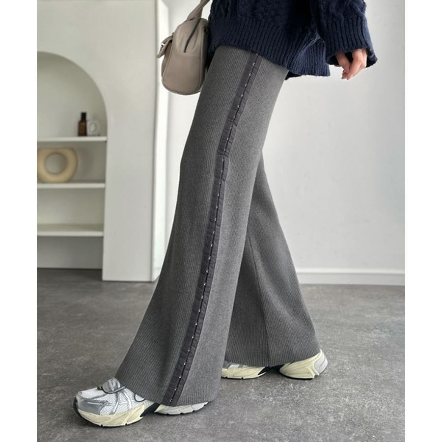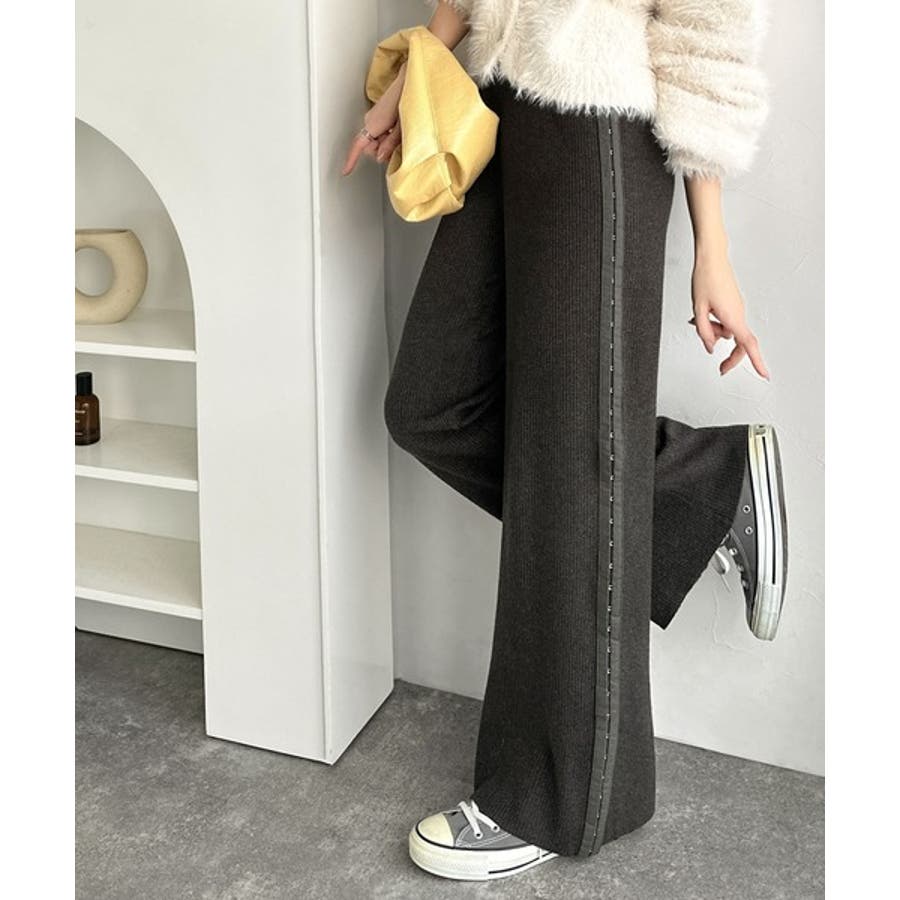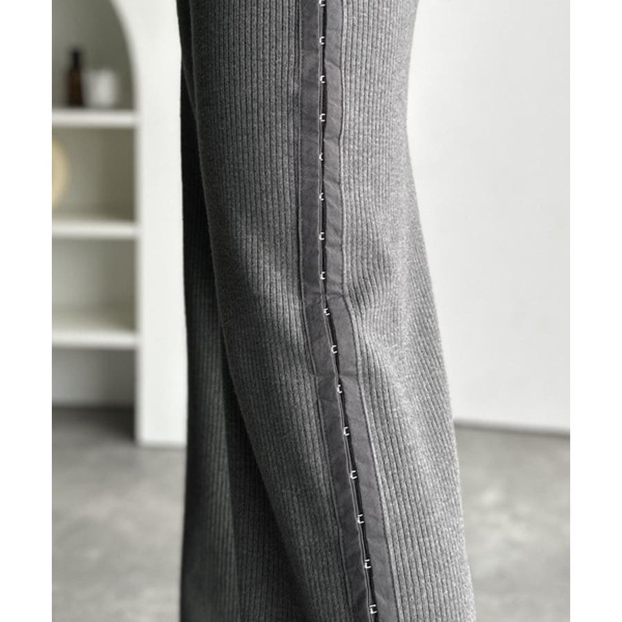 サイドの別生地ラインとさりげないホックがアクセントのリブニットパンツ。
