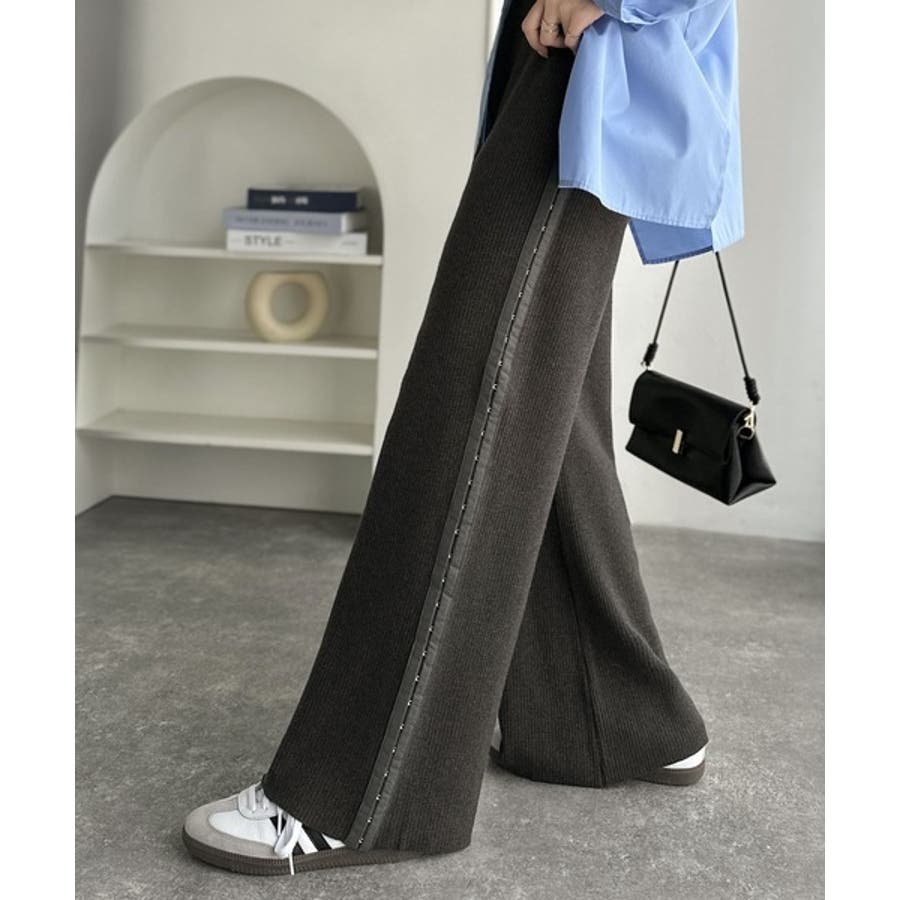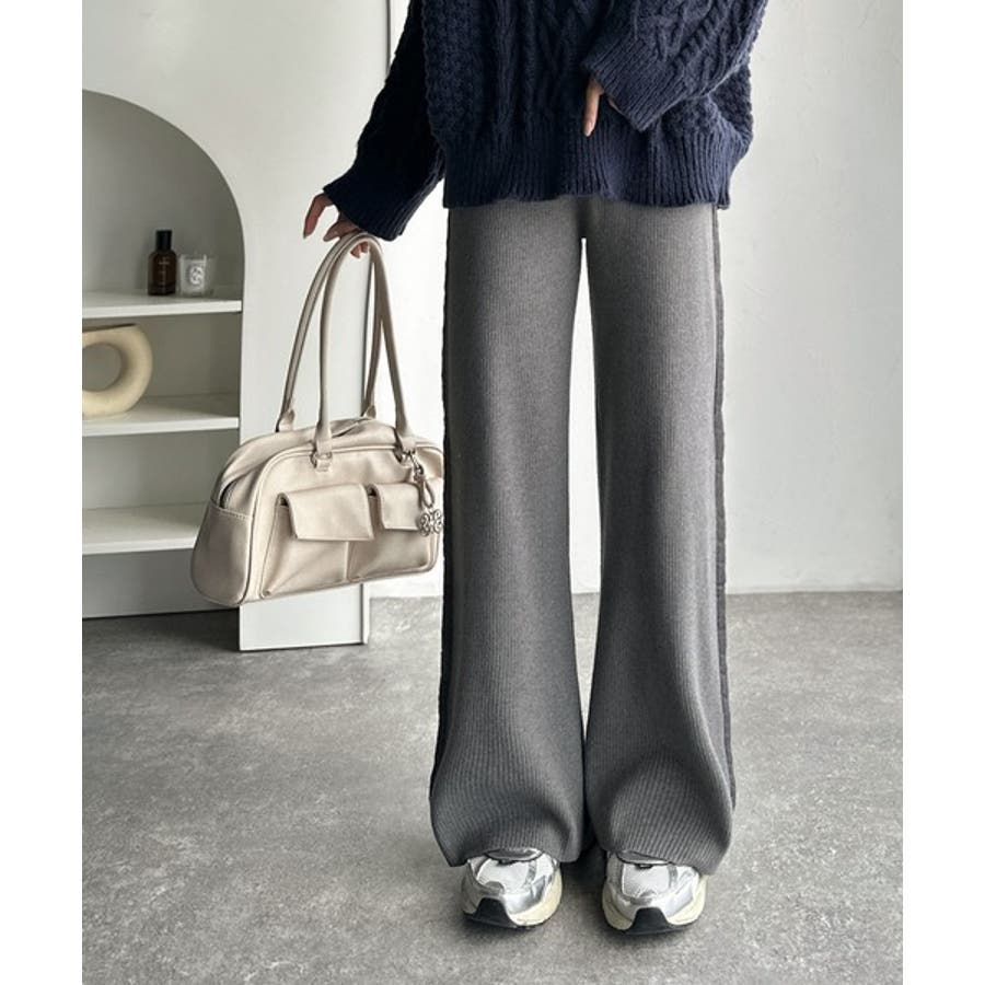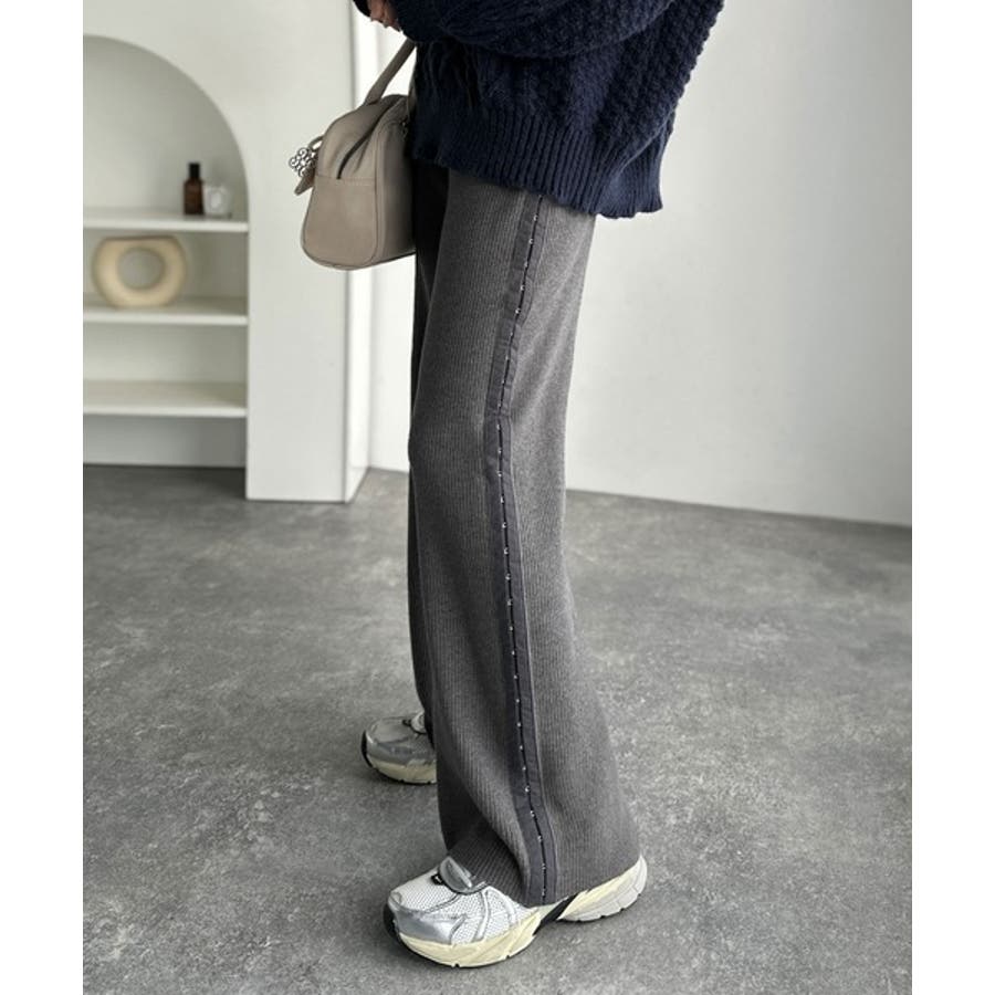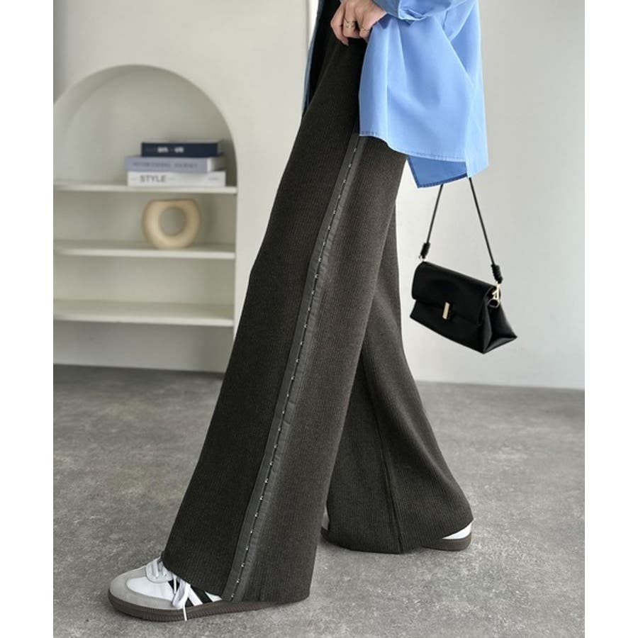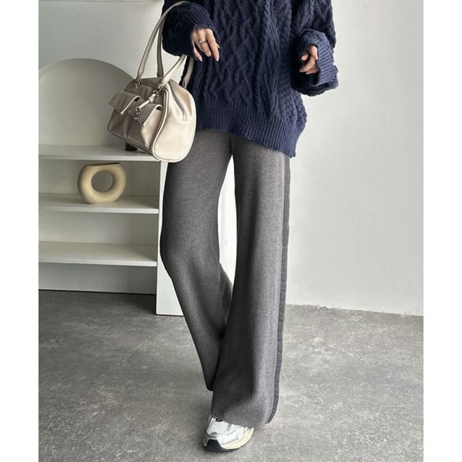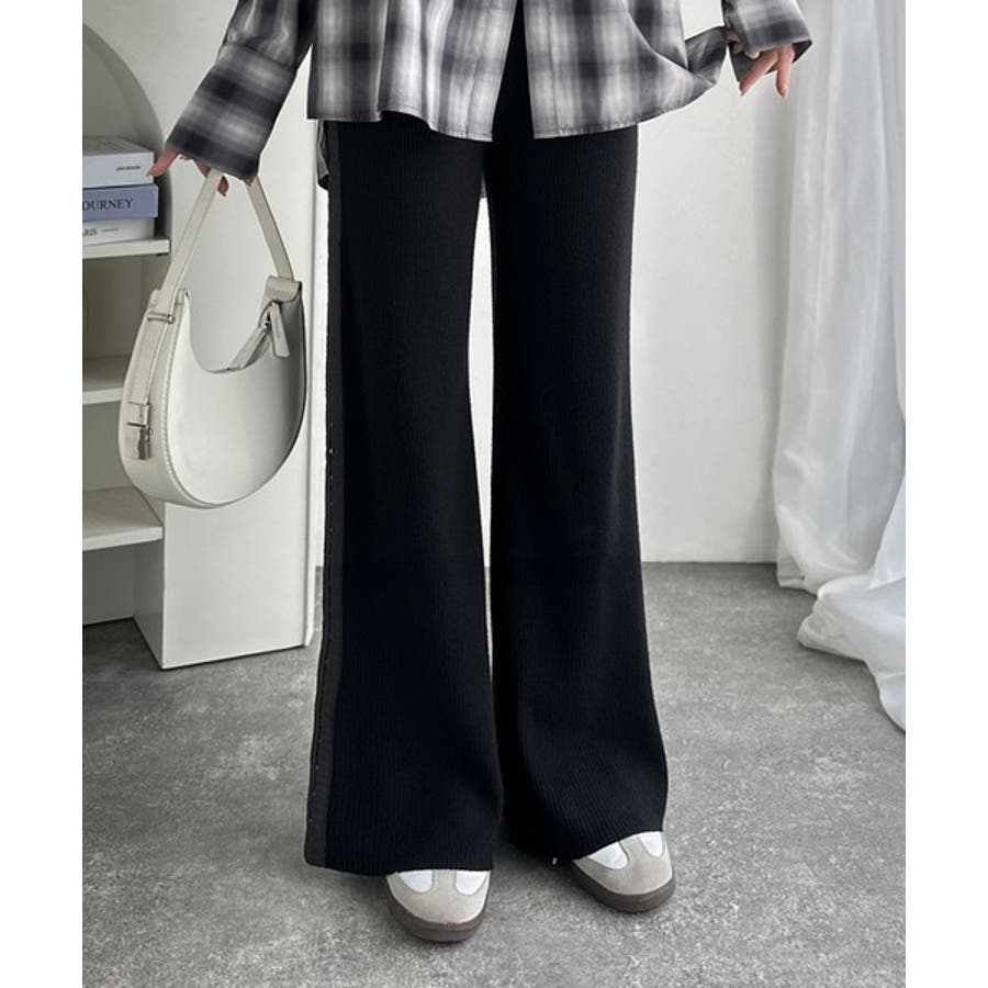 サイドの別生地ラインとさりげないホックがアクセントのリブニットパンツ。