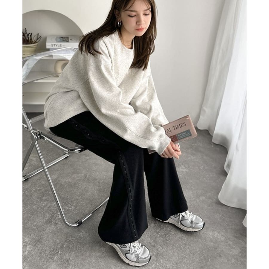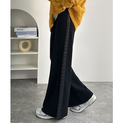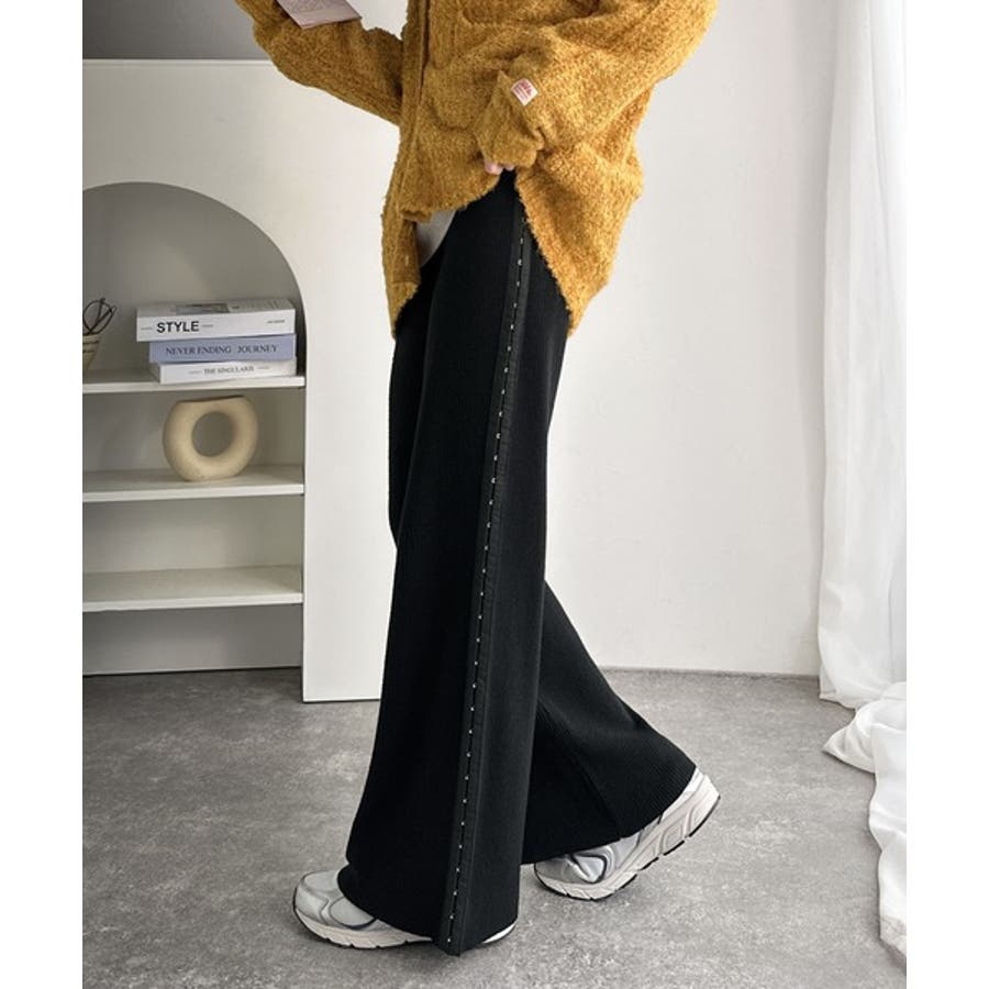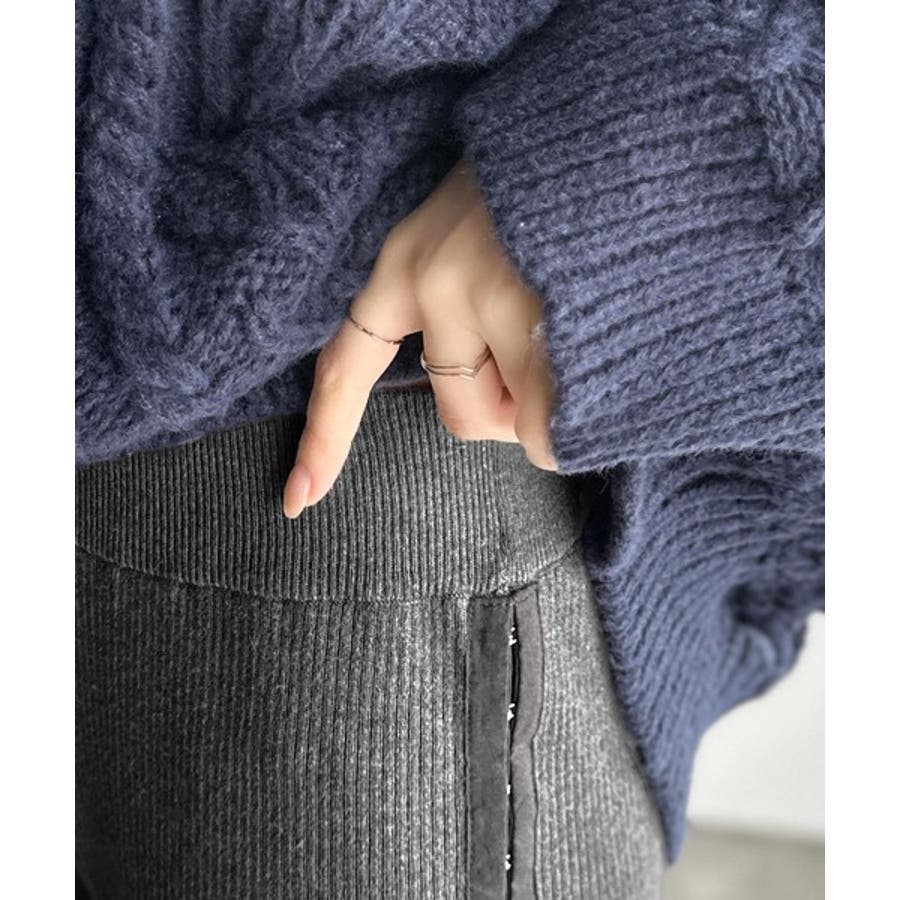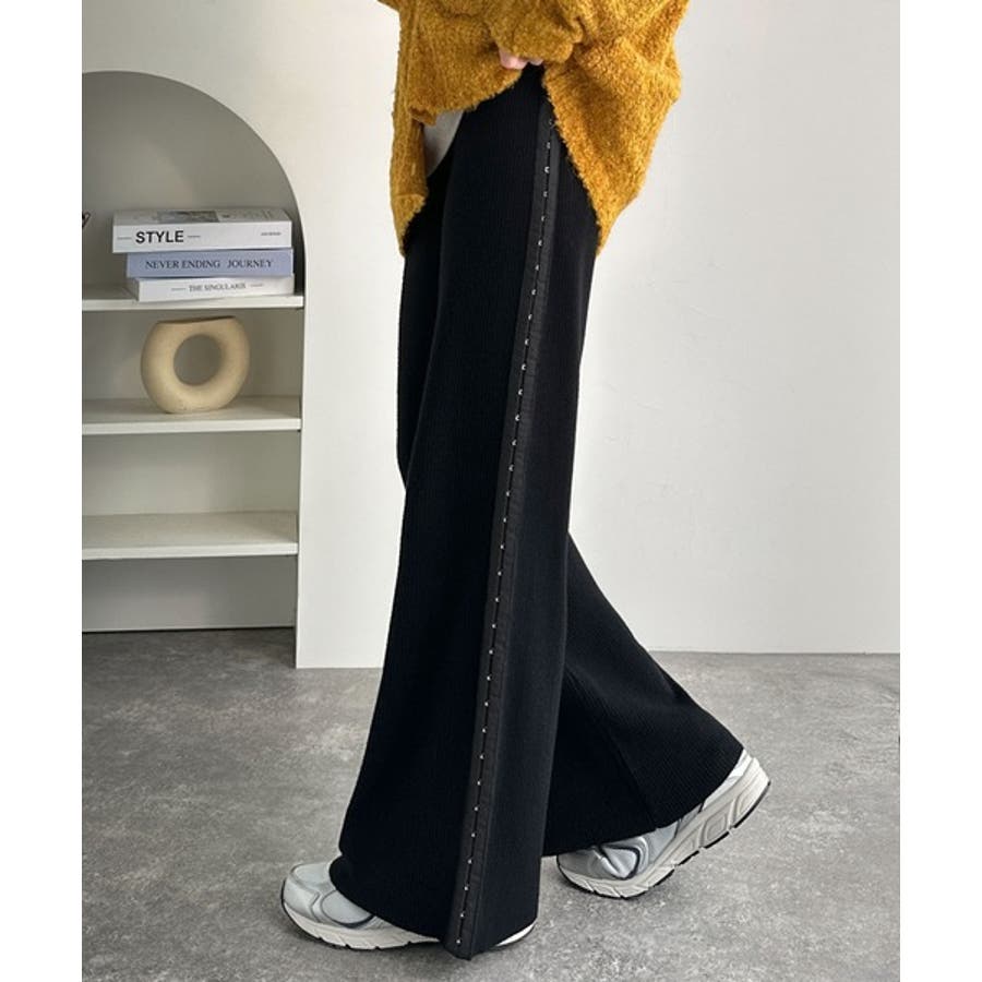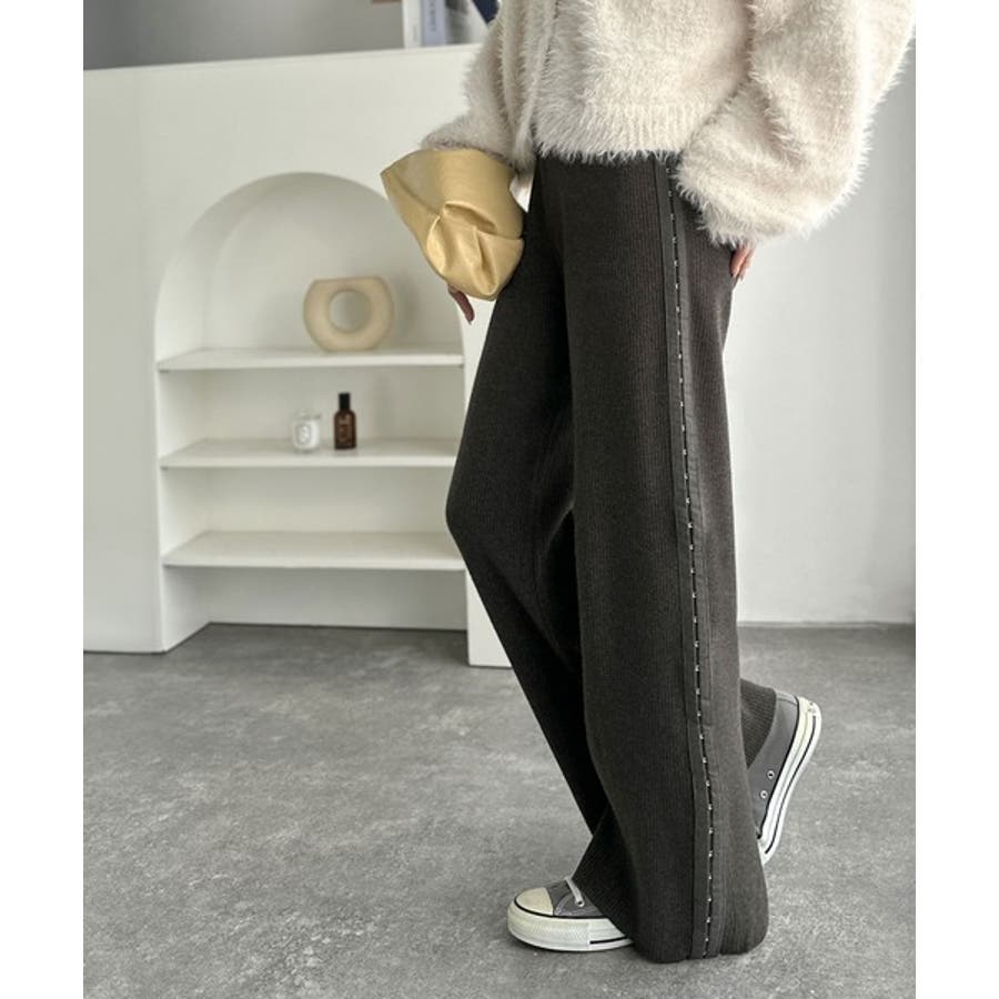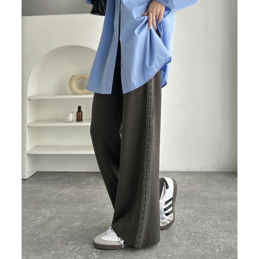 サイドの別生地ラインとさりげないホックがアクセントのリブニットパンツ。