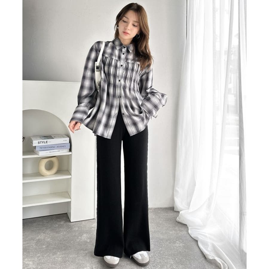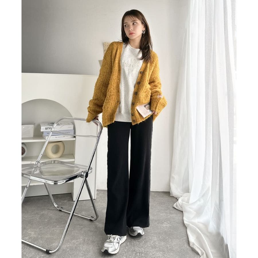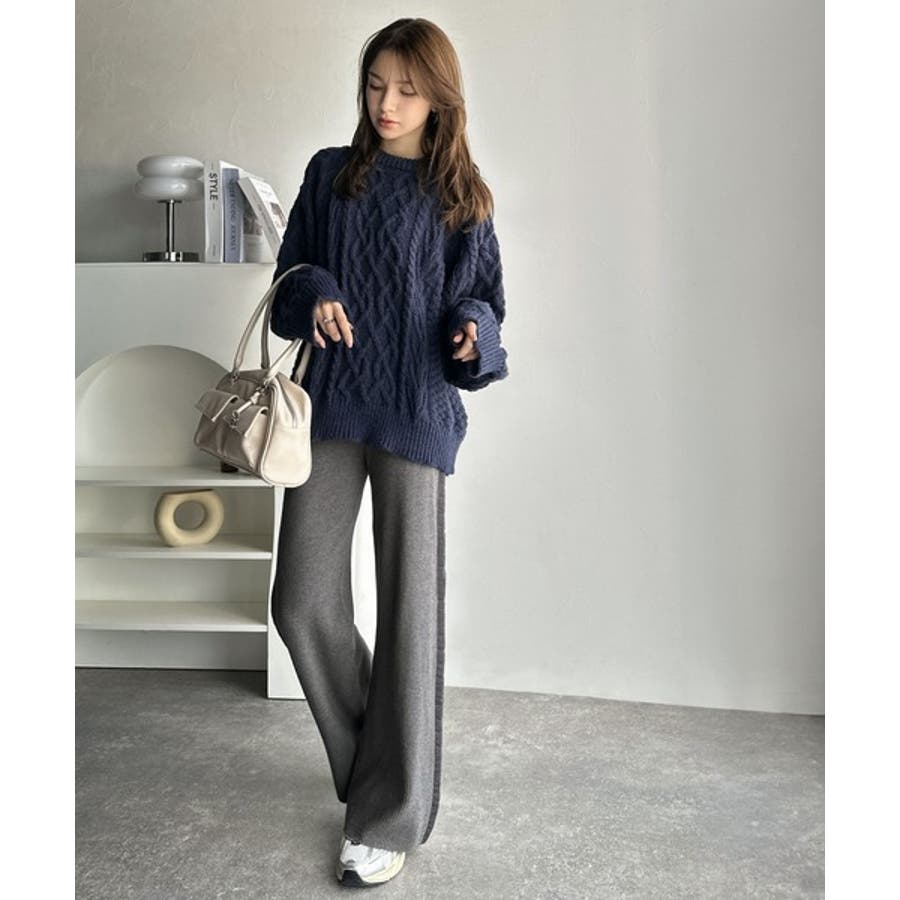 絶妙なフレアなシルエットがポイントのリブニットパンツ。