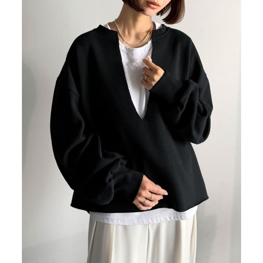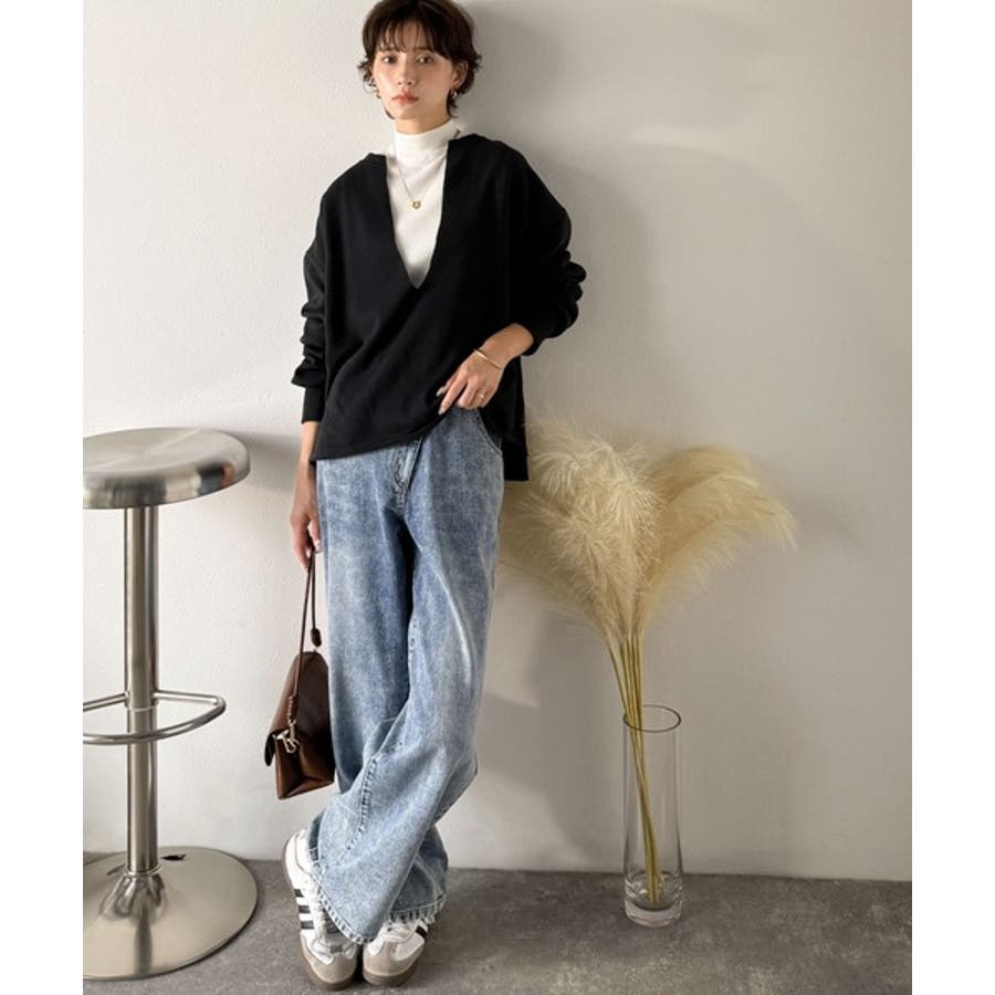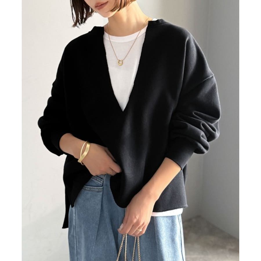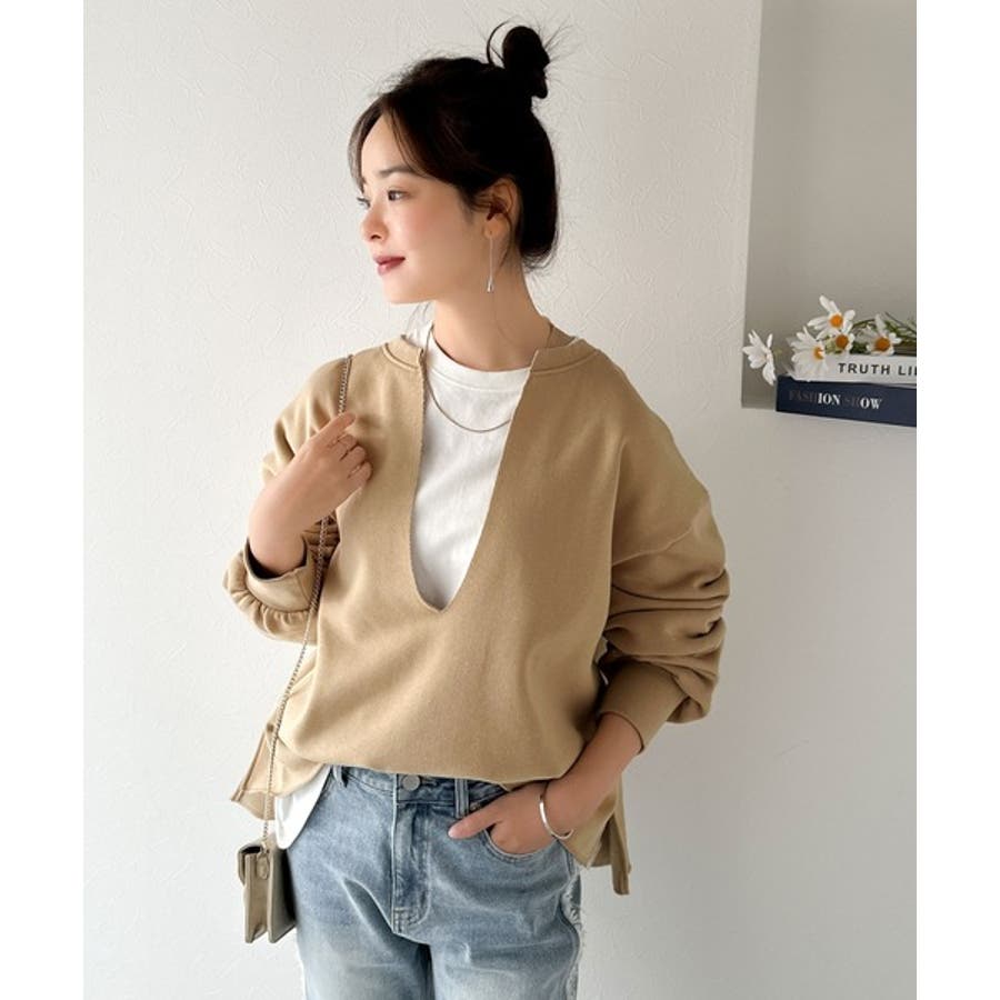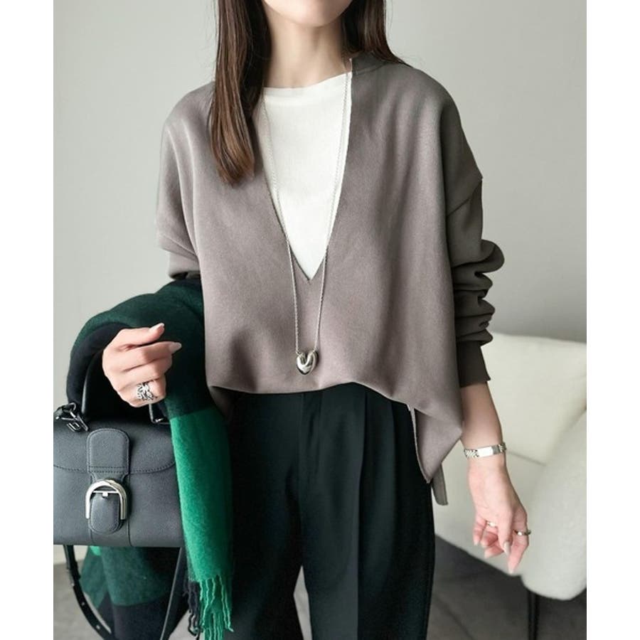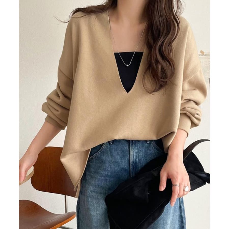 胸下まで空いたVネックは、インナー次第で表情をガラッと変えることができるのが魅力。