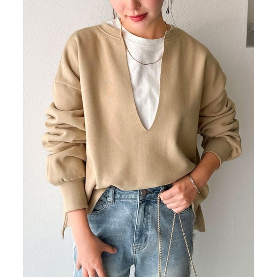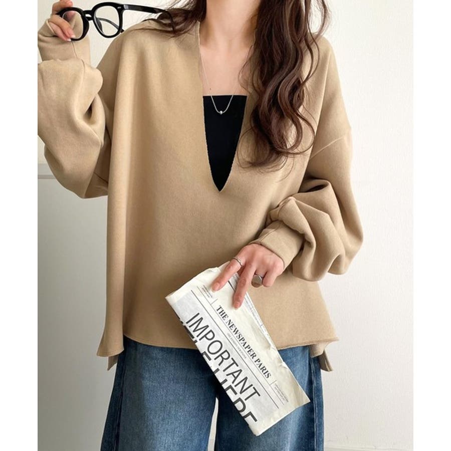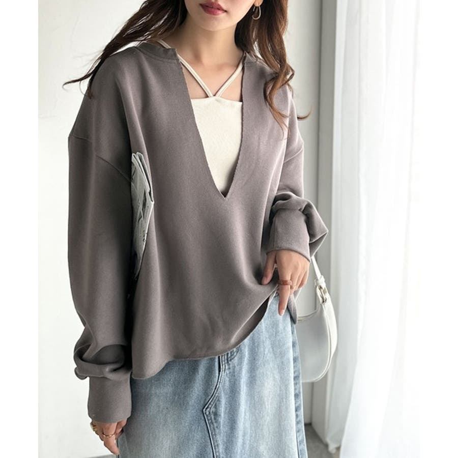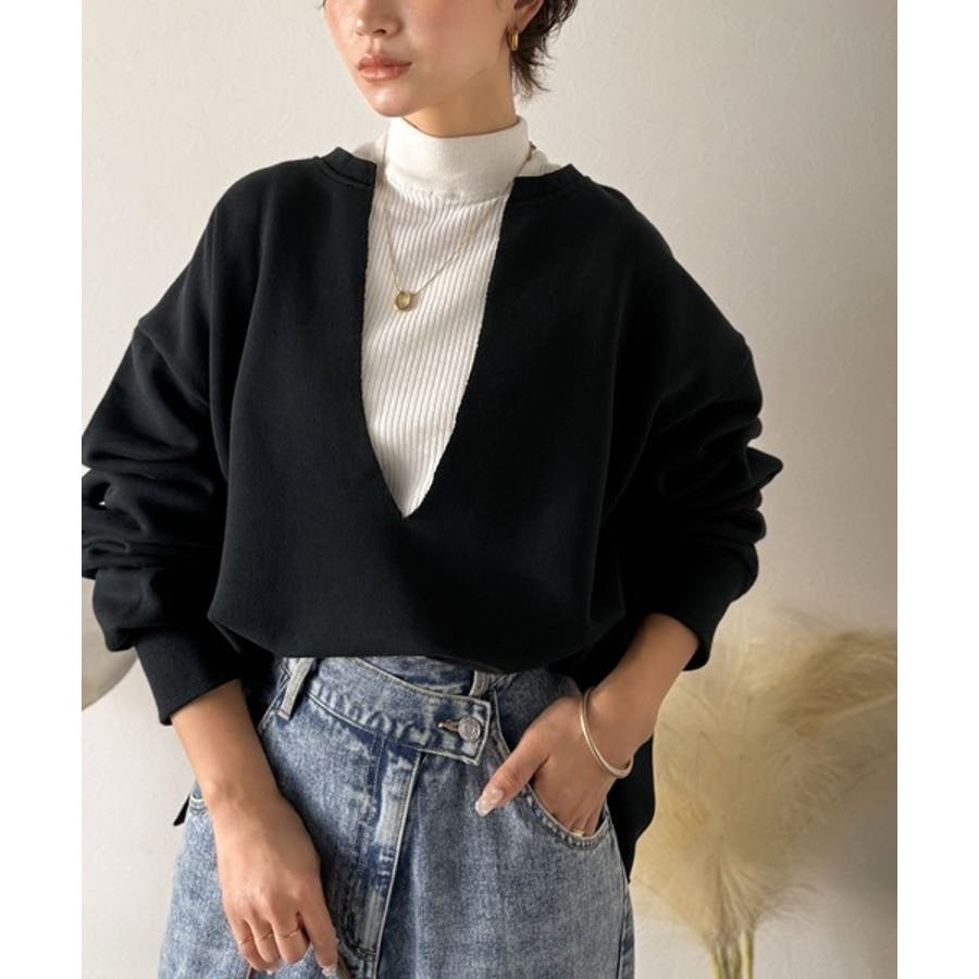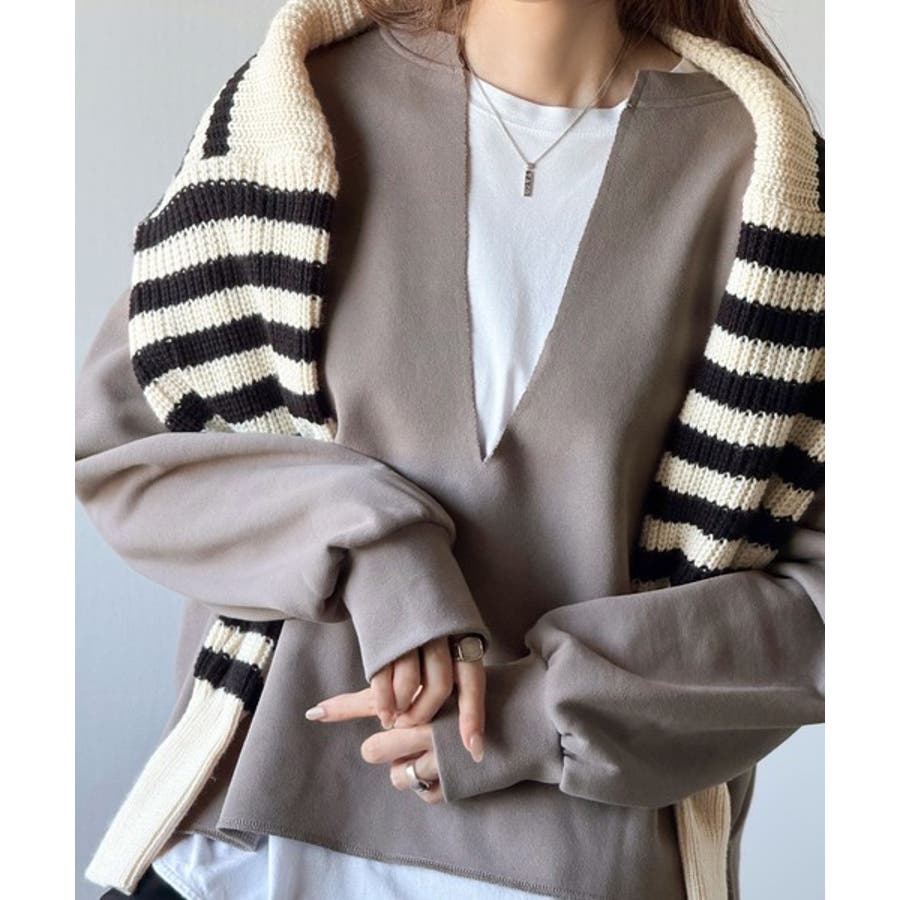 胸下まで空いたVネックは、インナー次第で表情をガラッと変えることができるのが魅力。