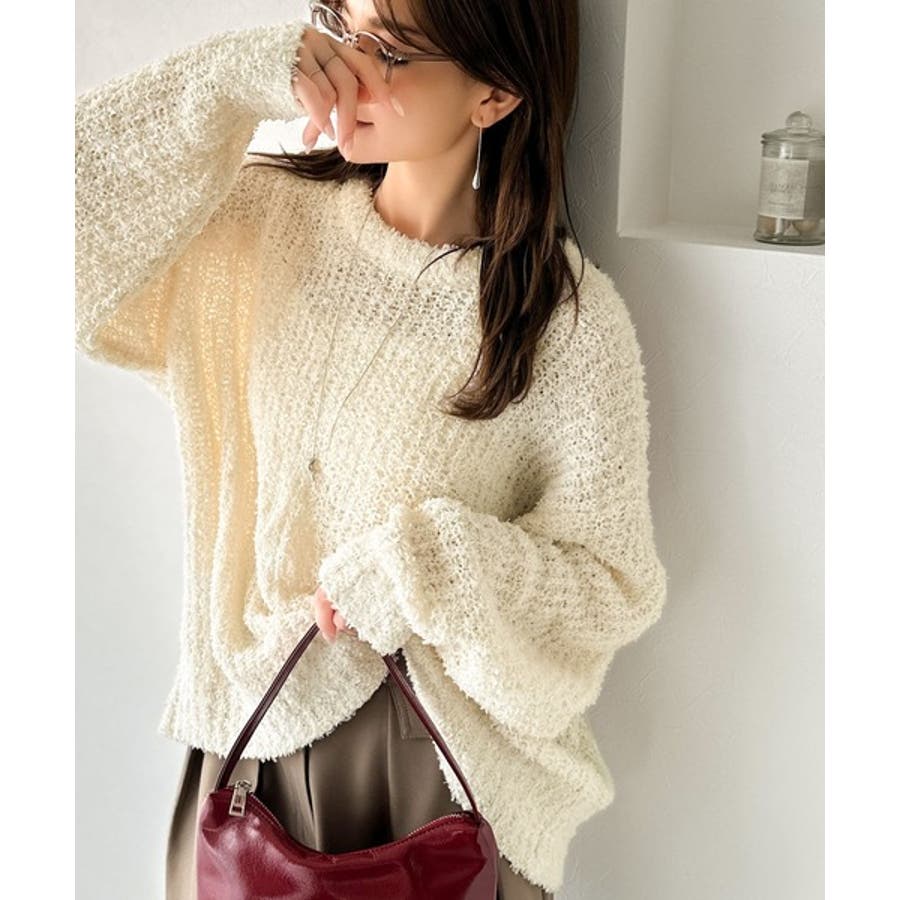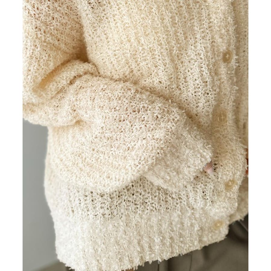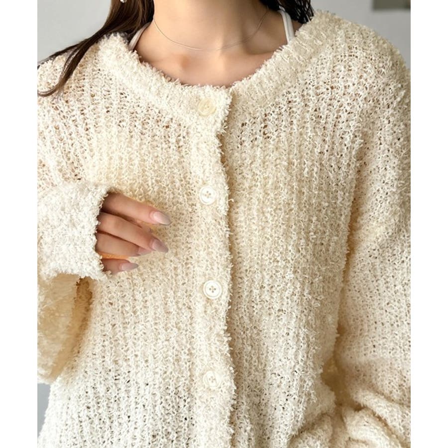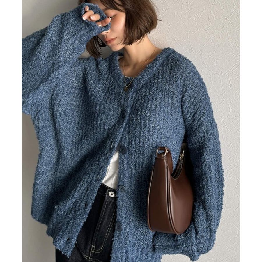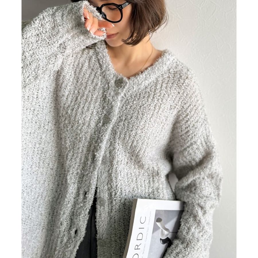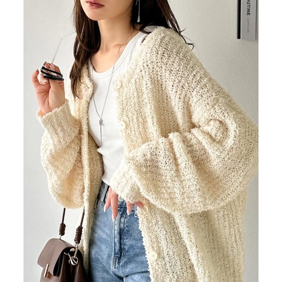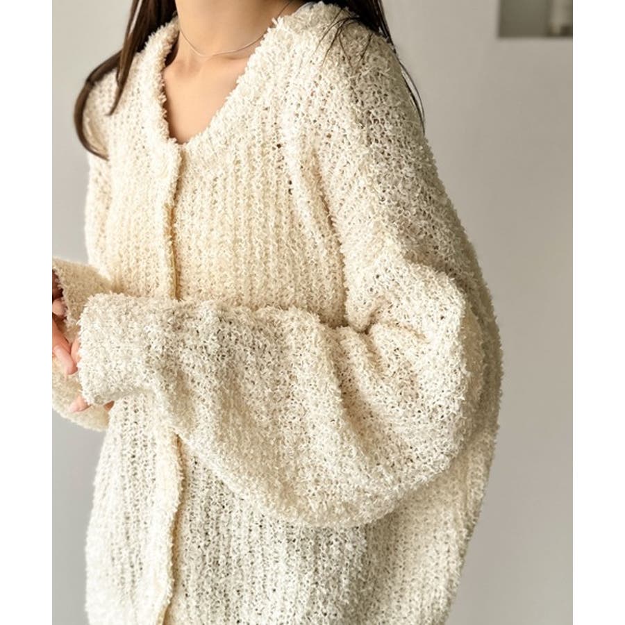 ざっくりと柔らかく編み上げられた、大人の抜け感漂うリボンヤーンカーディガン。