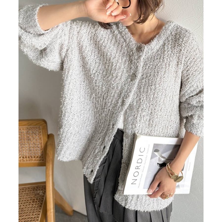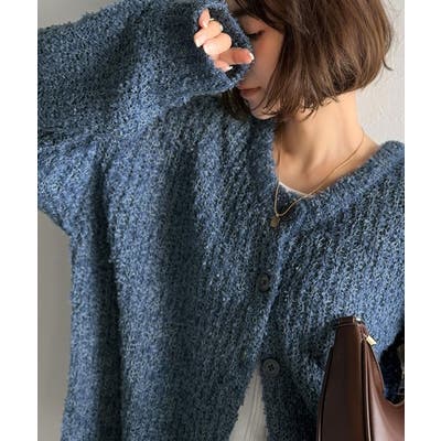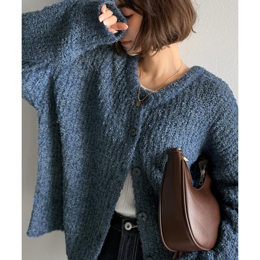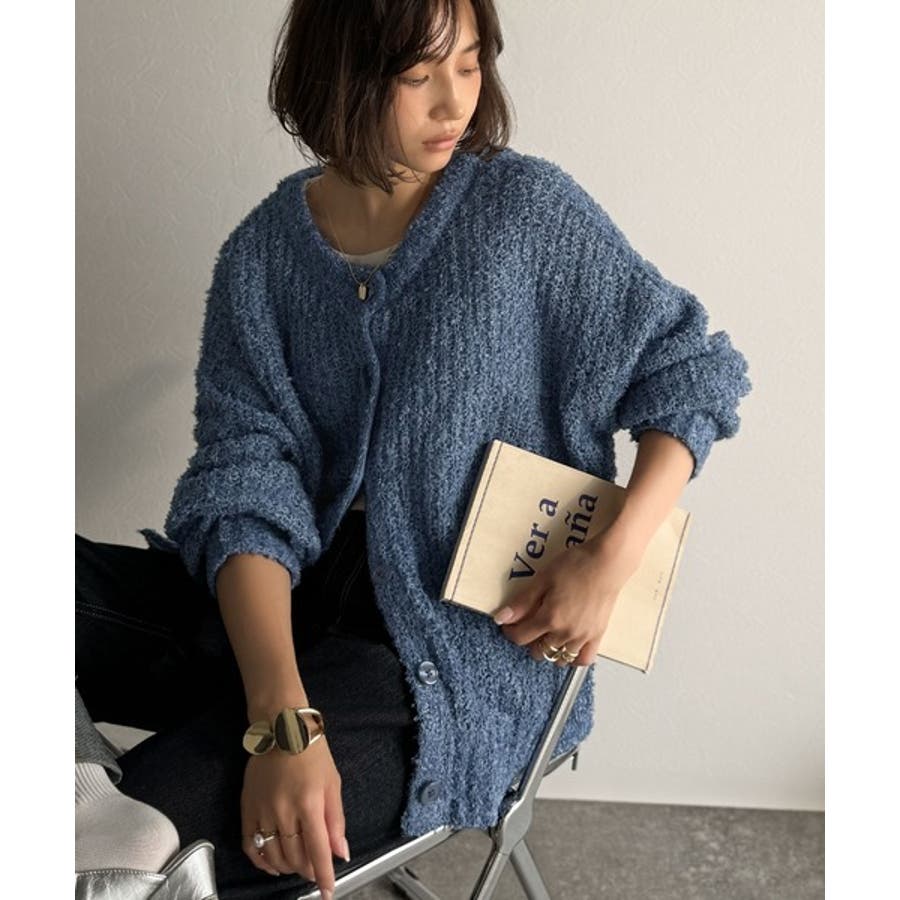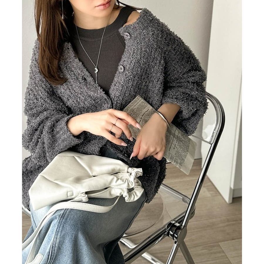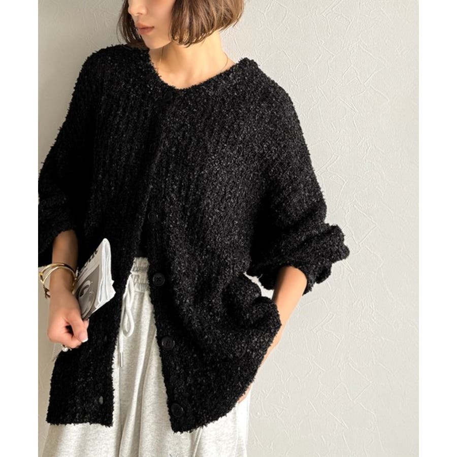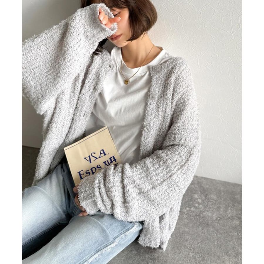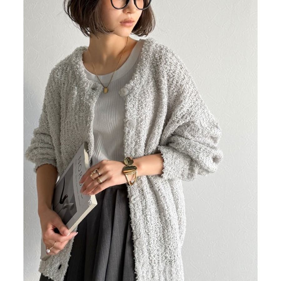 ざっくりと柔らかく編み上げられた、大人の抜け感漂うリボンヤーンカーディガン。