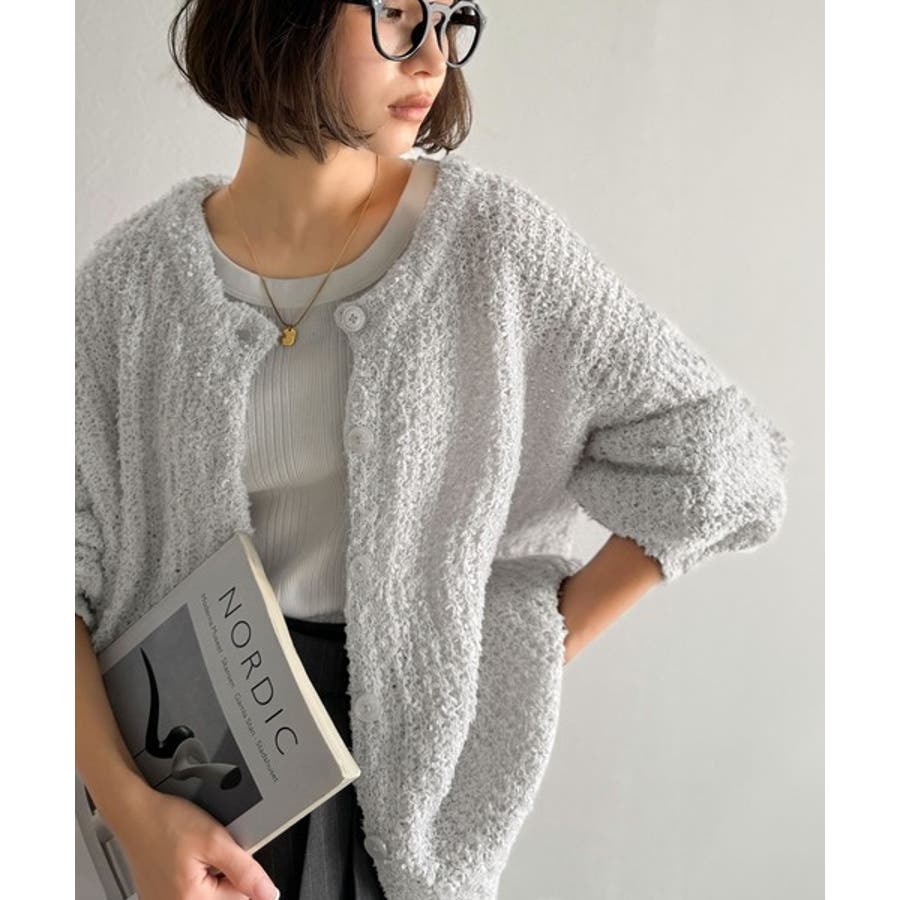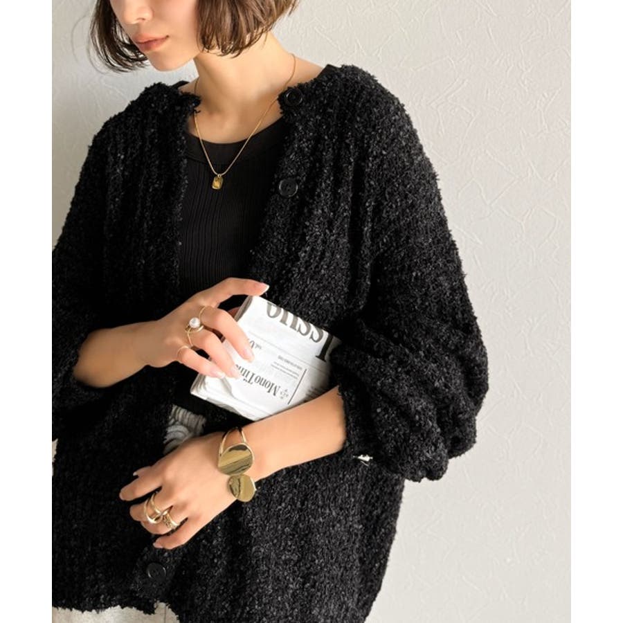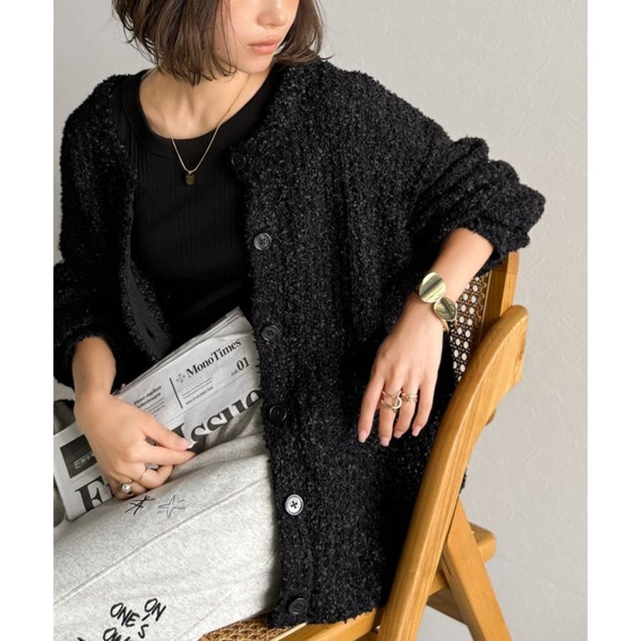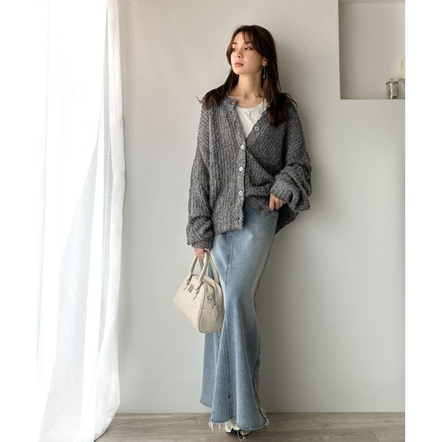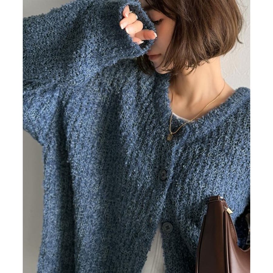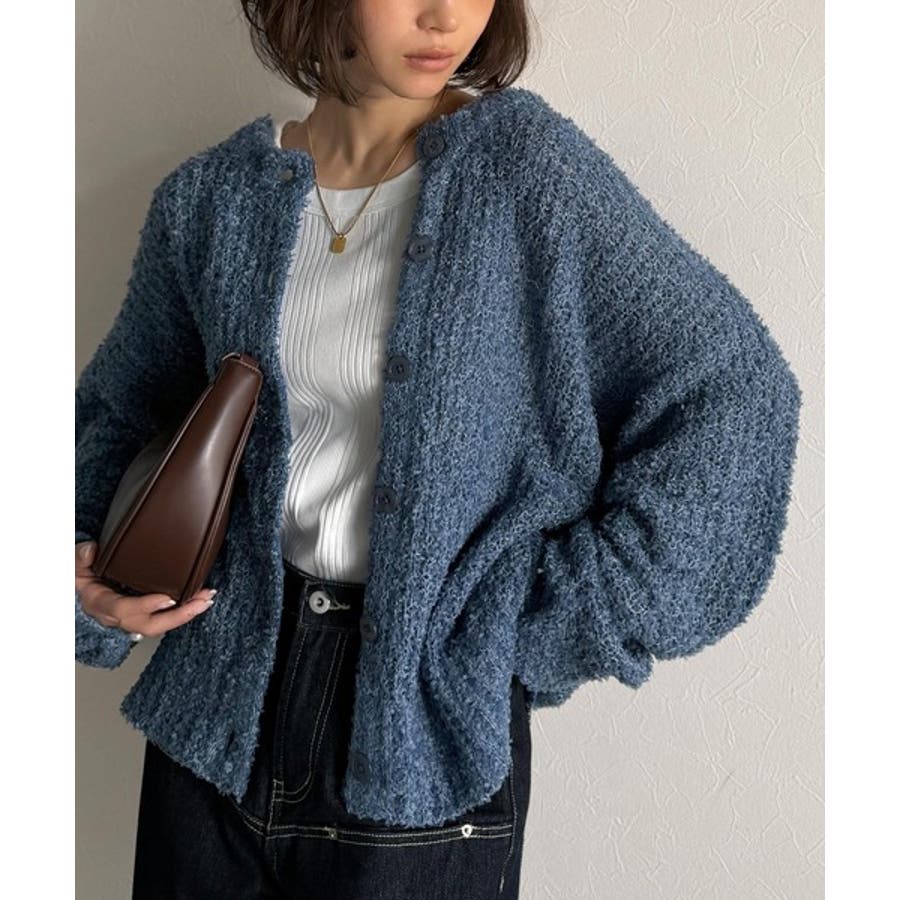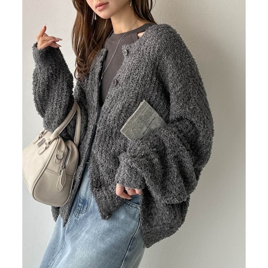 ざっくりと柔らかく編み上げられた、大人の抜け感漂うリボンヤーンカーディガン。