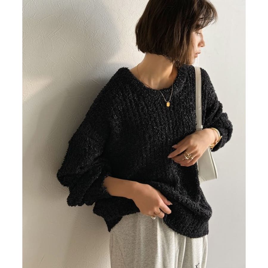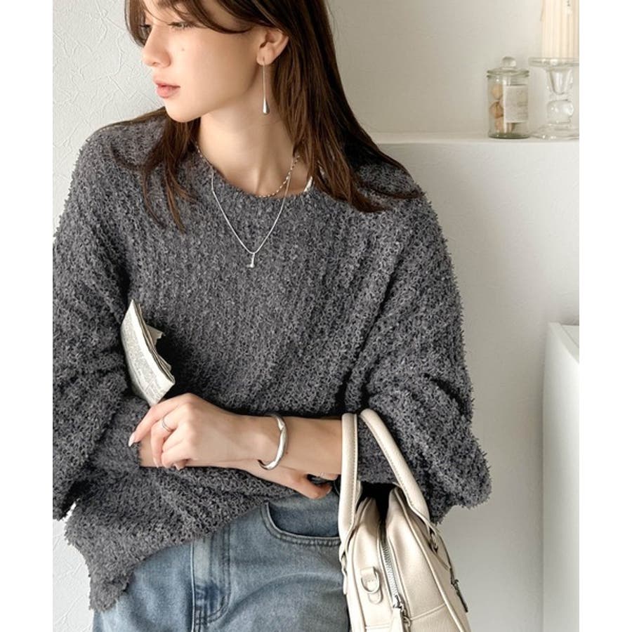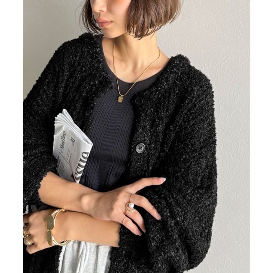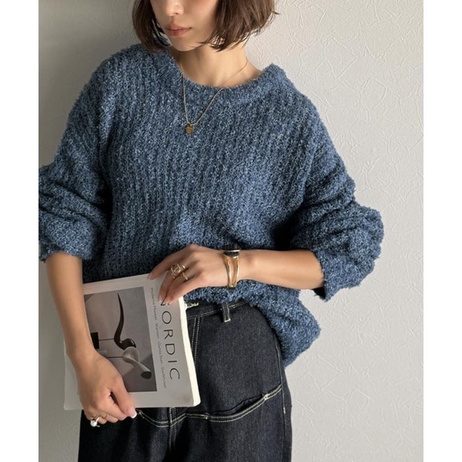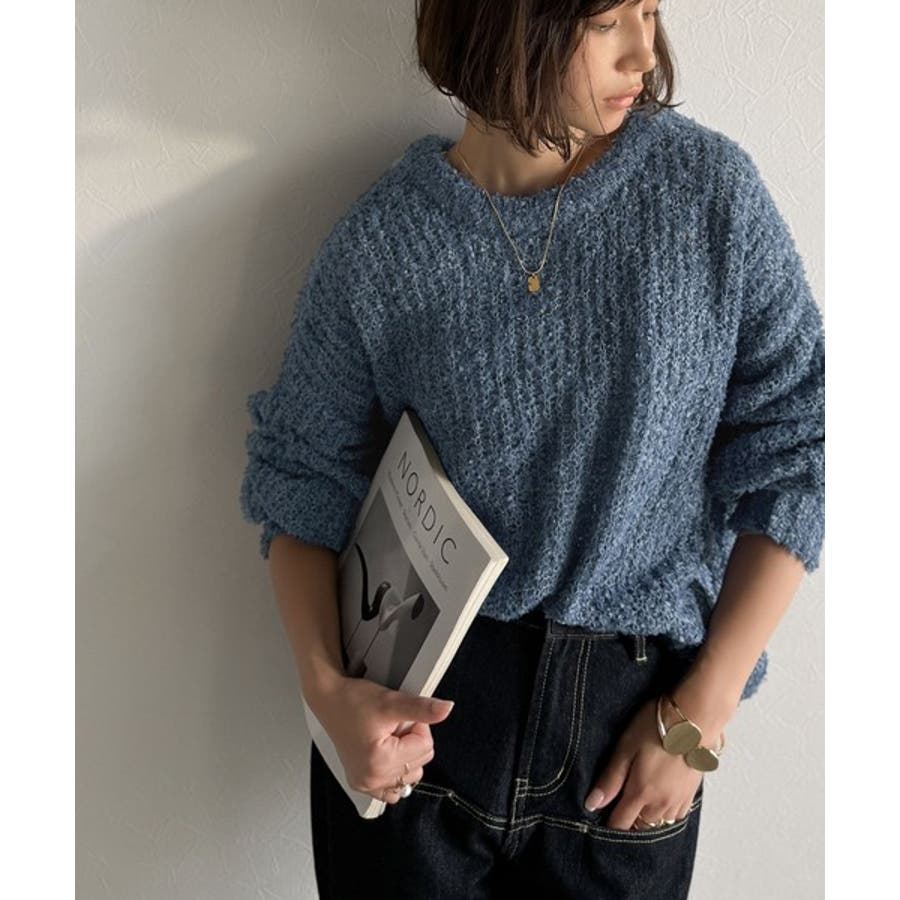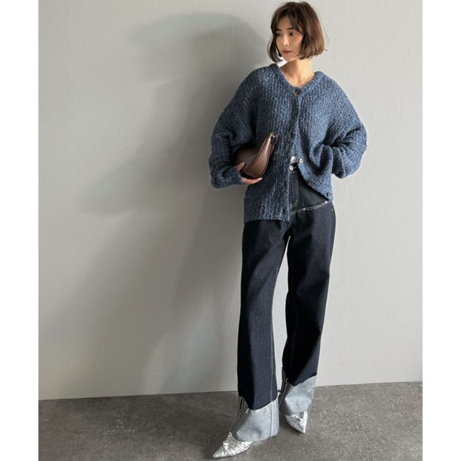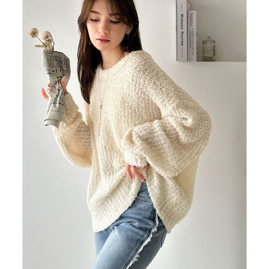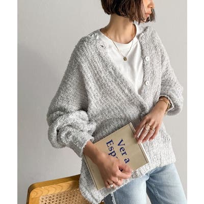 ざっくりと柔らかく編み上げられた、大人の抜け感漂うリボンヤーンカーディガン。