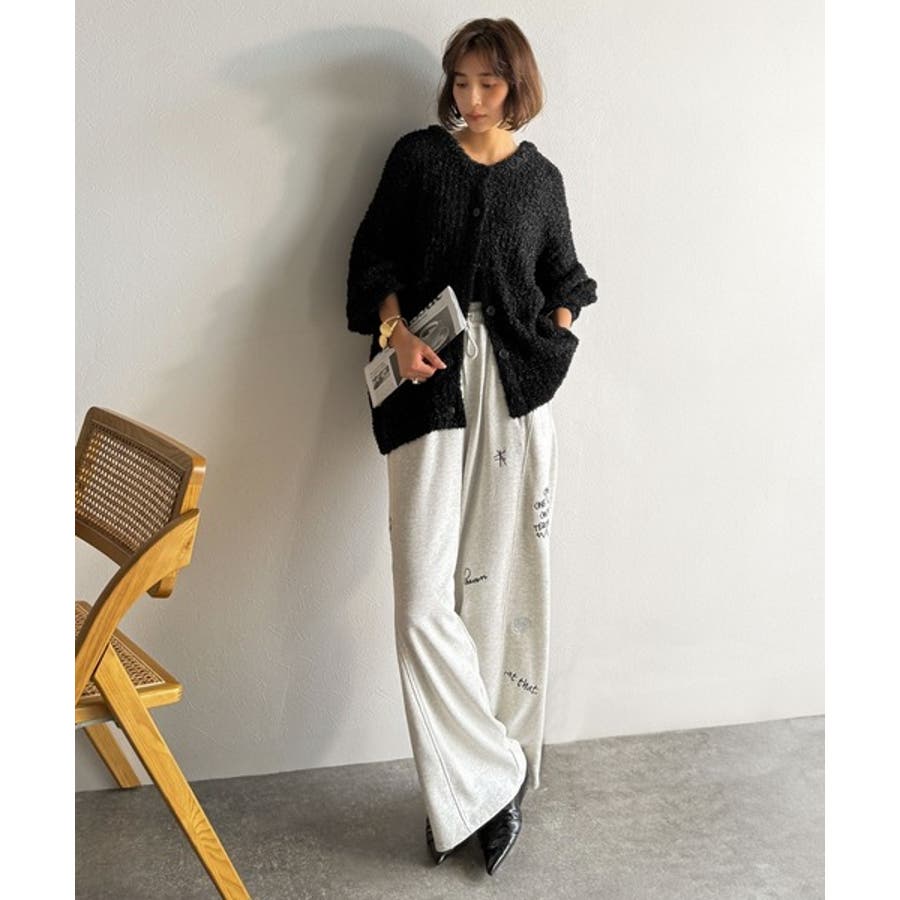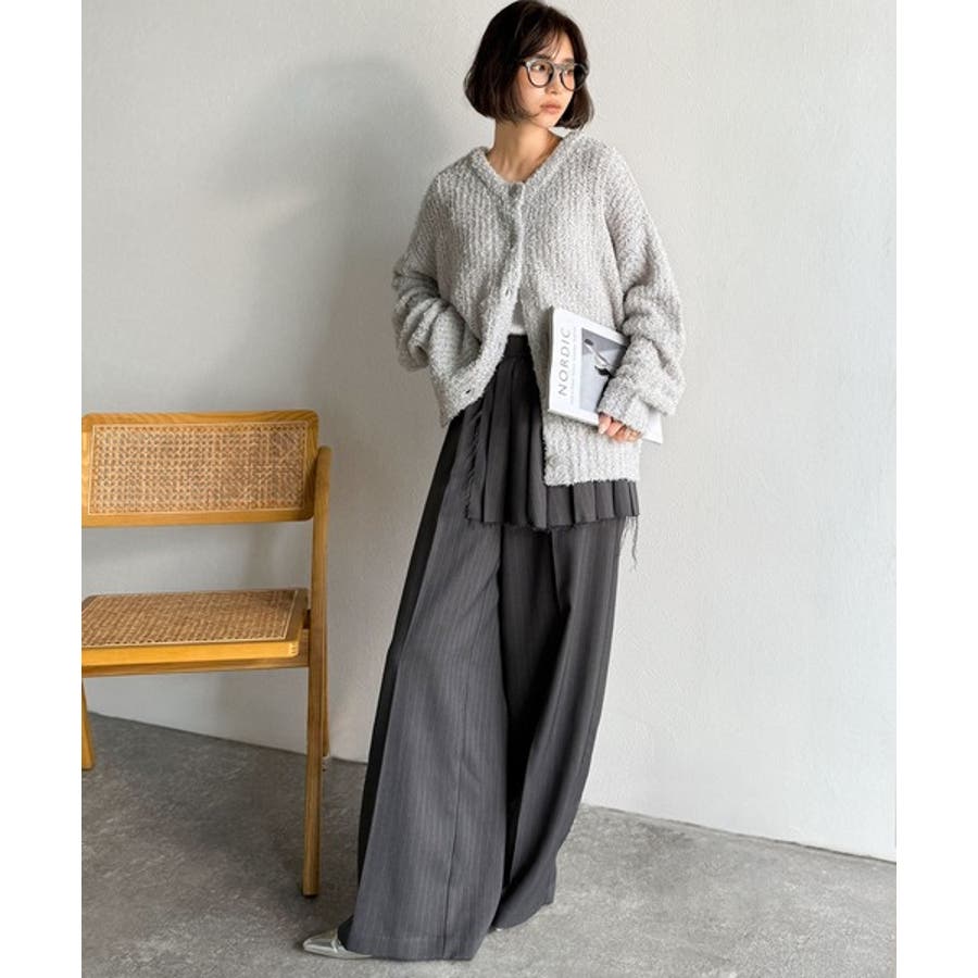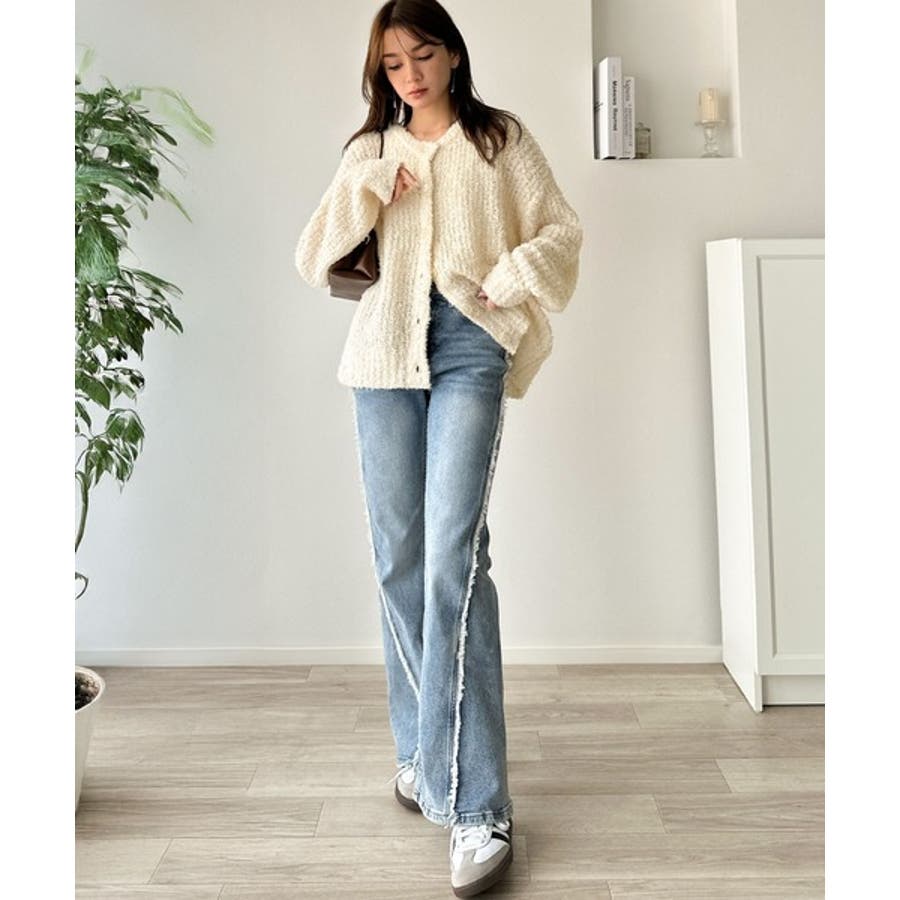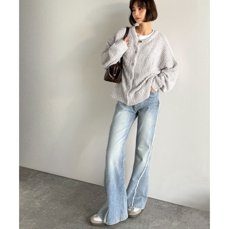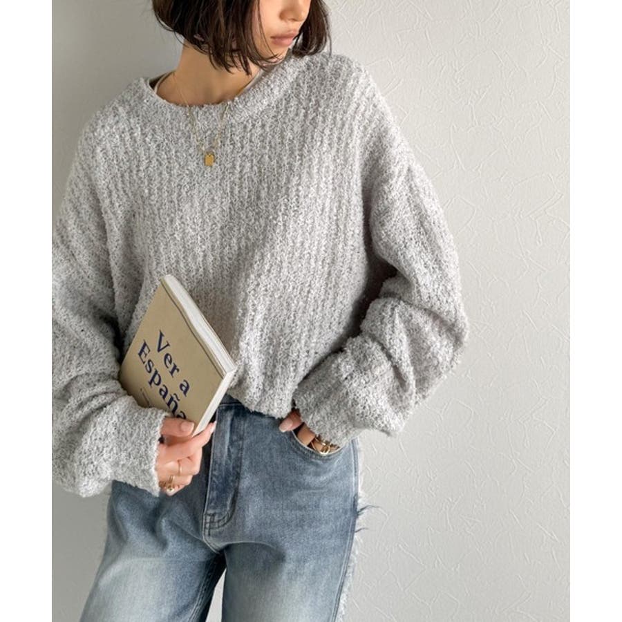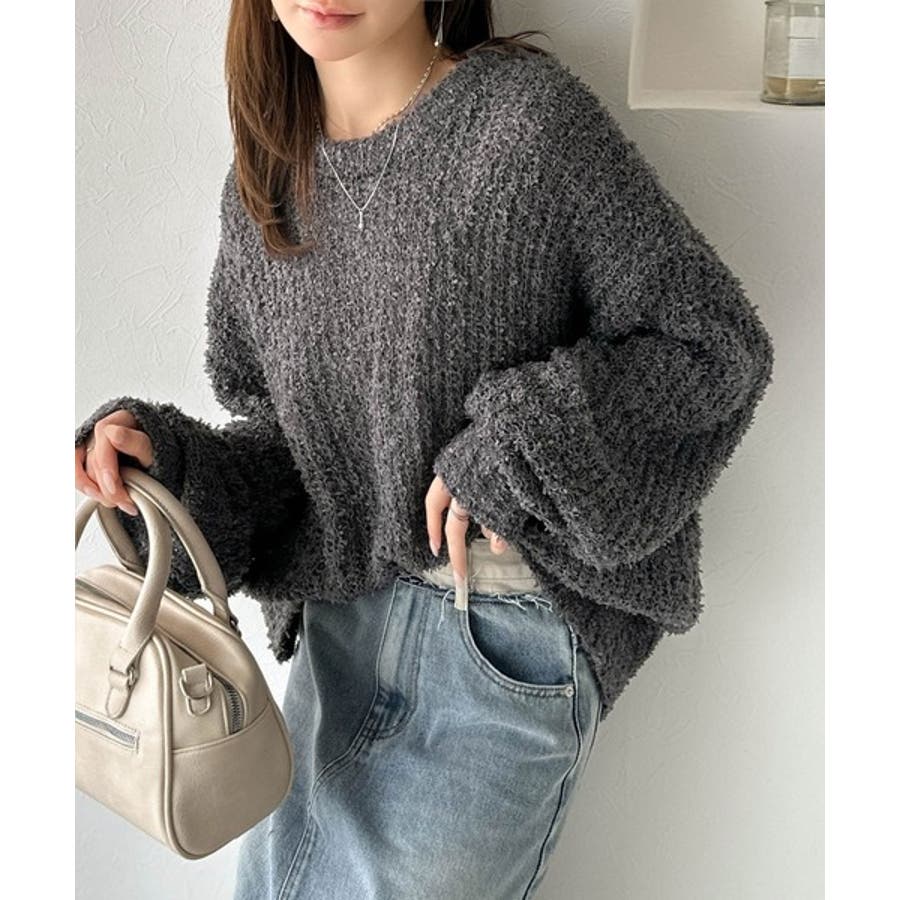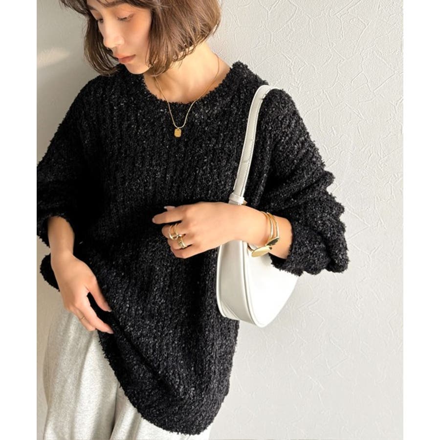ざっくりと柔らかく編み上げられた、大人の抜け感漂うリボンヤーンカーディガン。