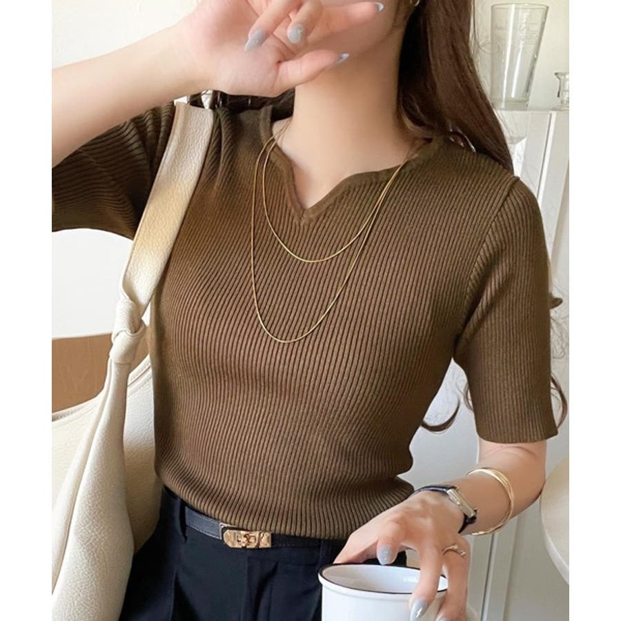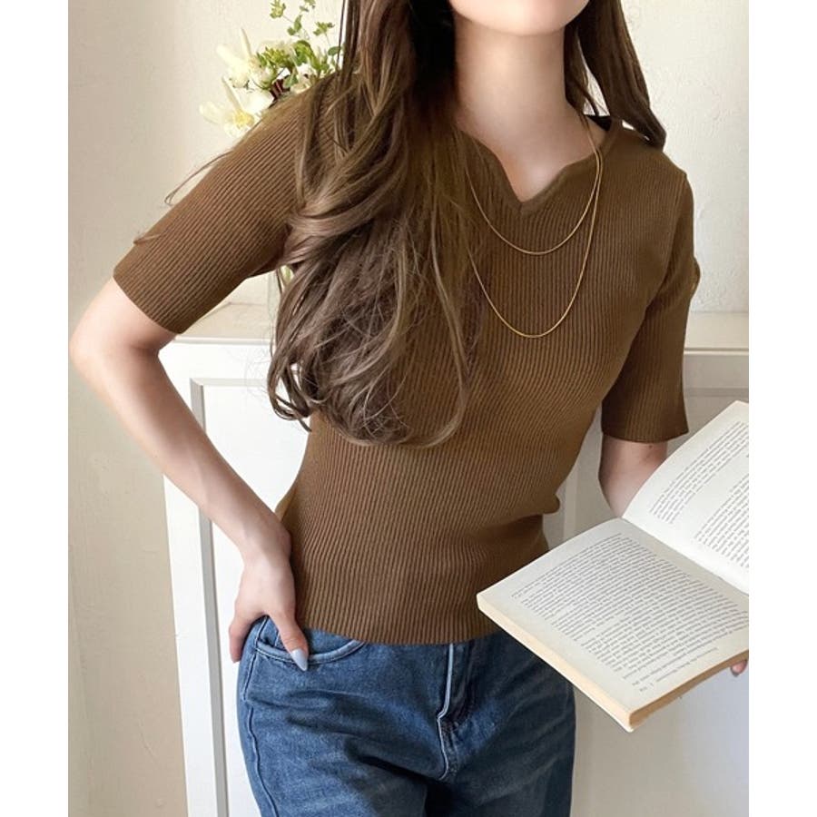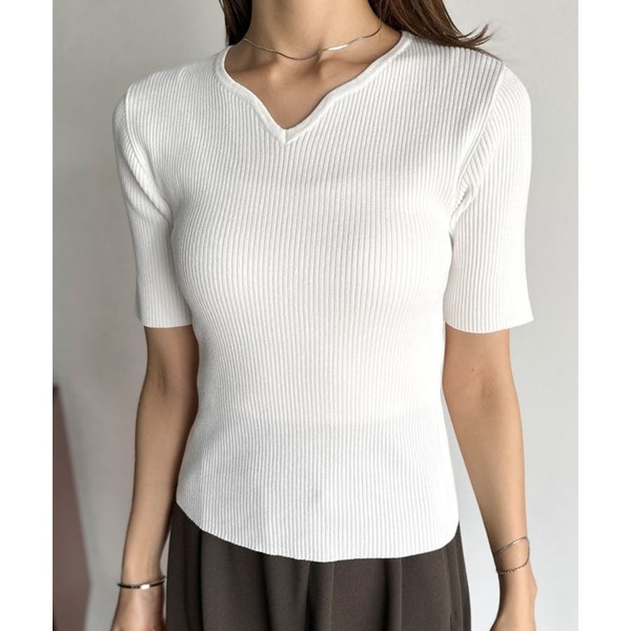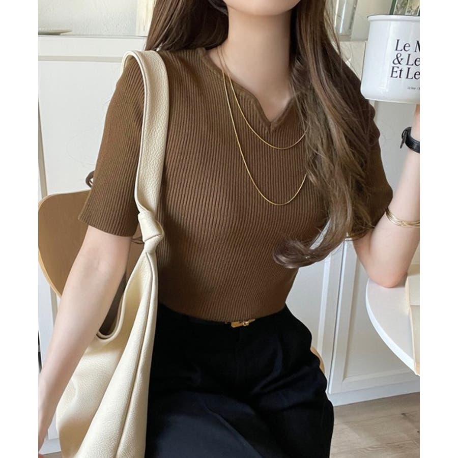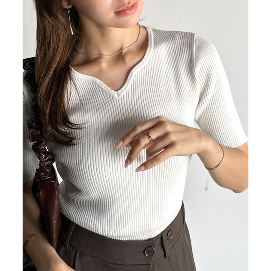 美デコルテを演出♪リブニットカーヴィーネックトップス(半袖)