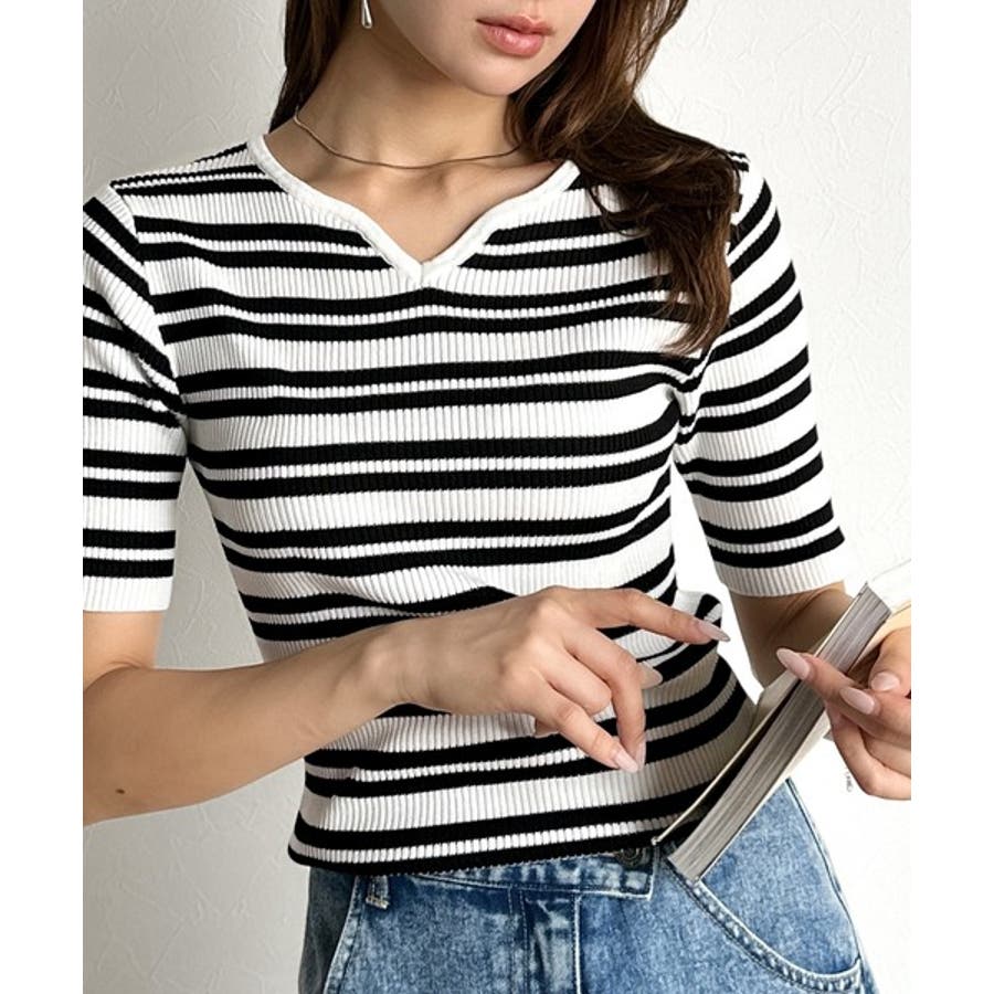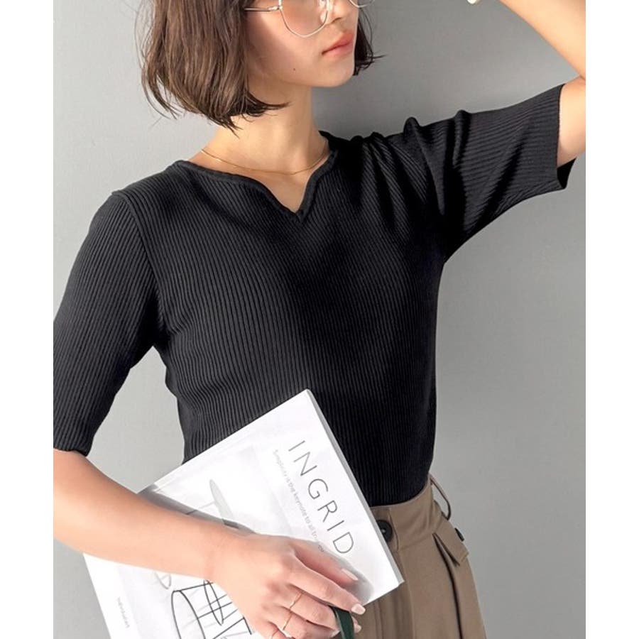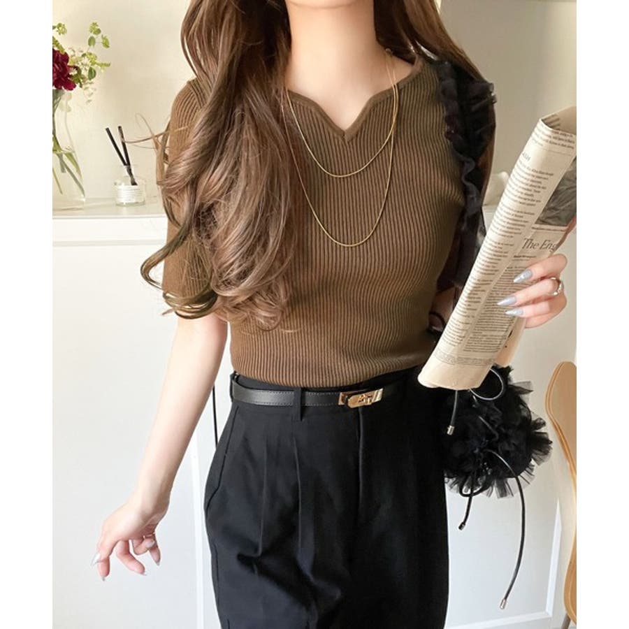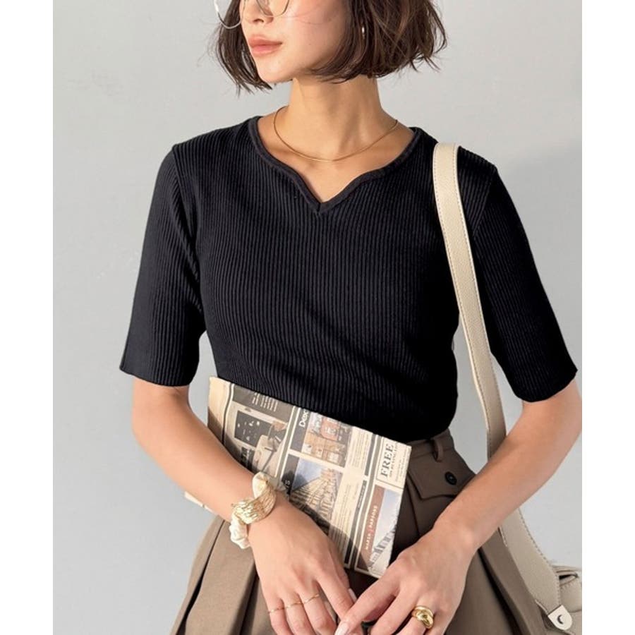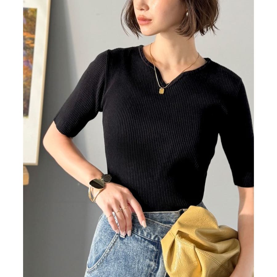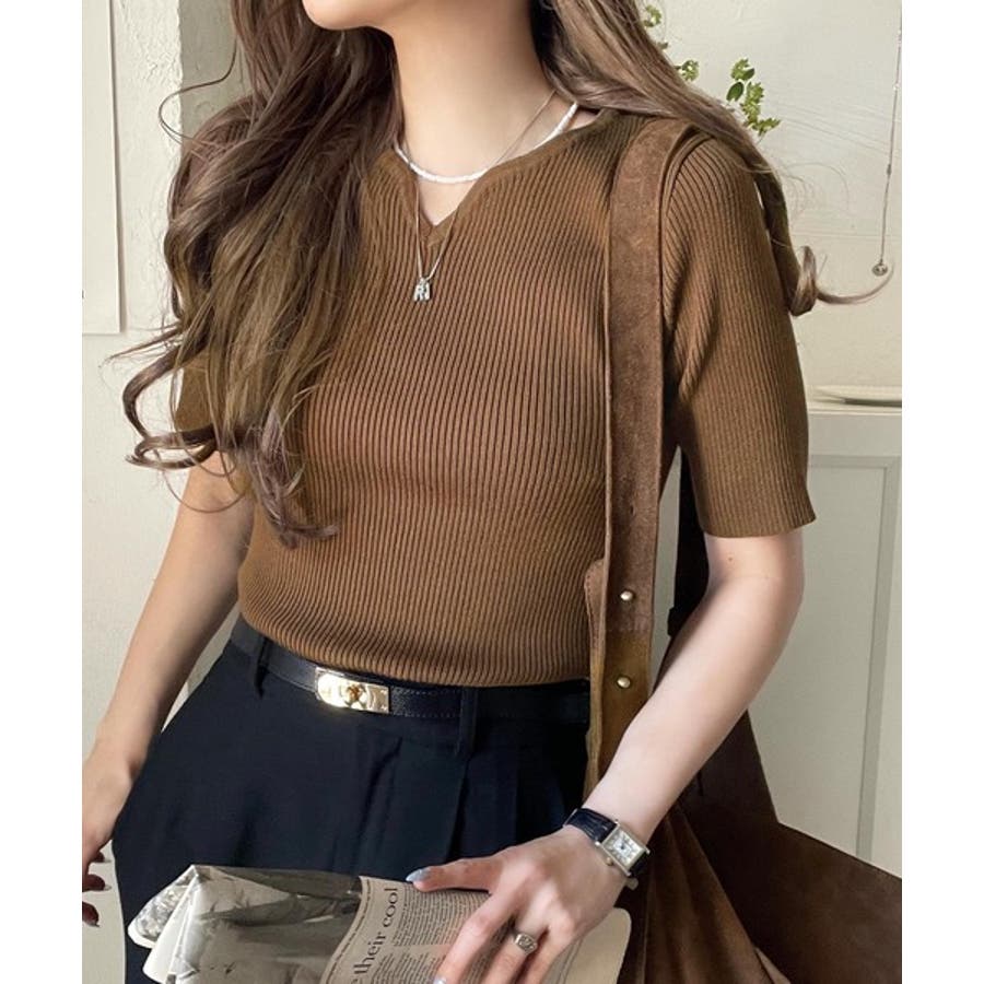 美デコルテを演出♪リブニットカーヴィーネックトップス(半袖)