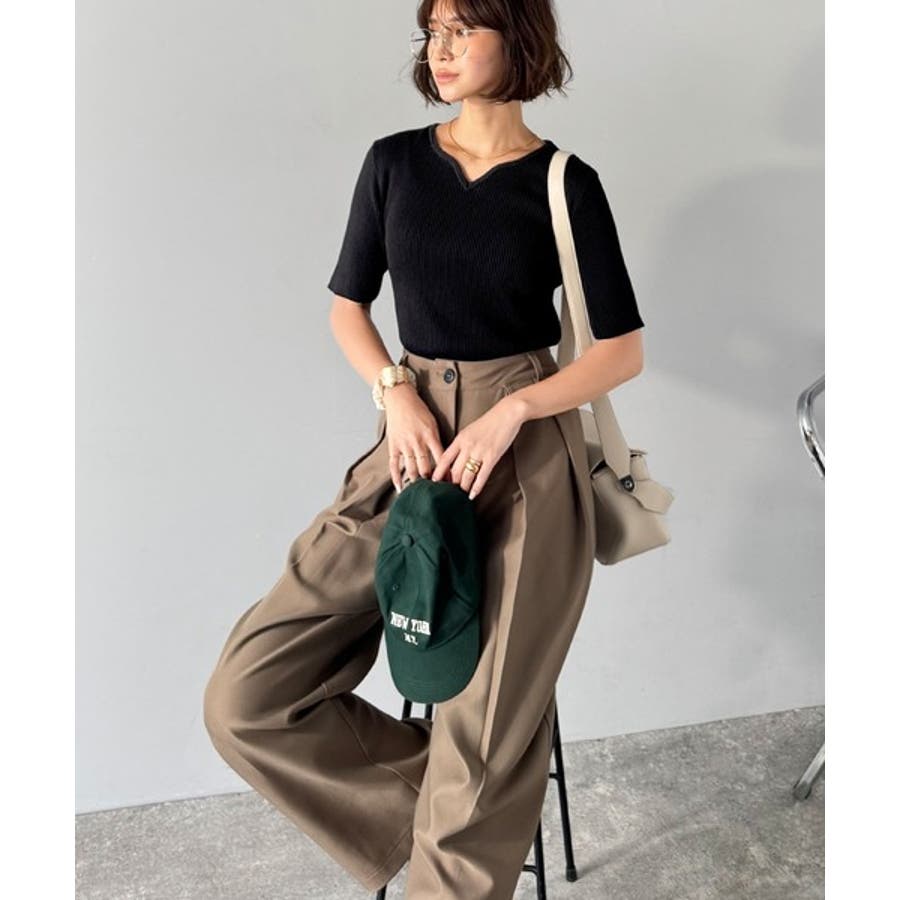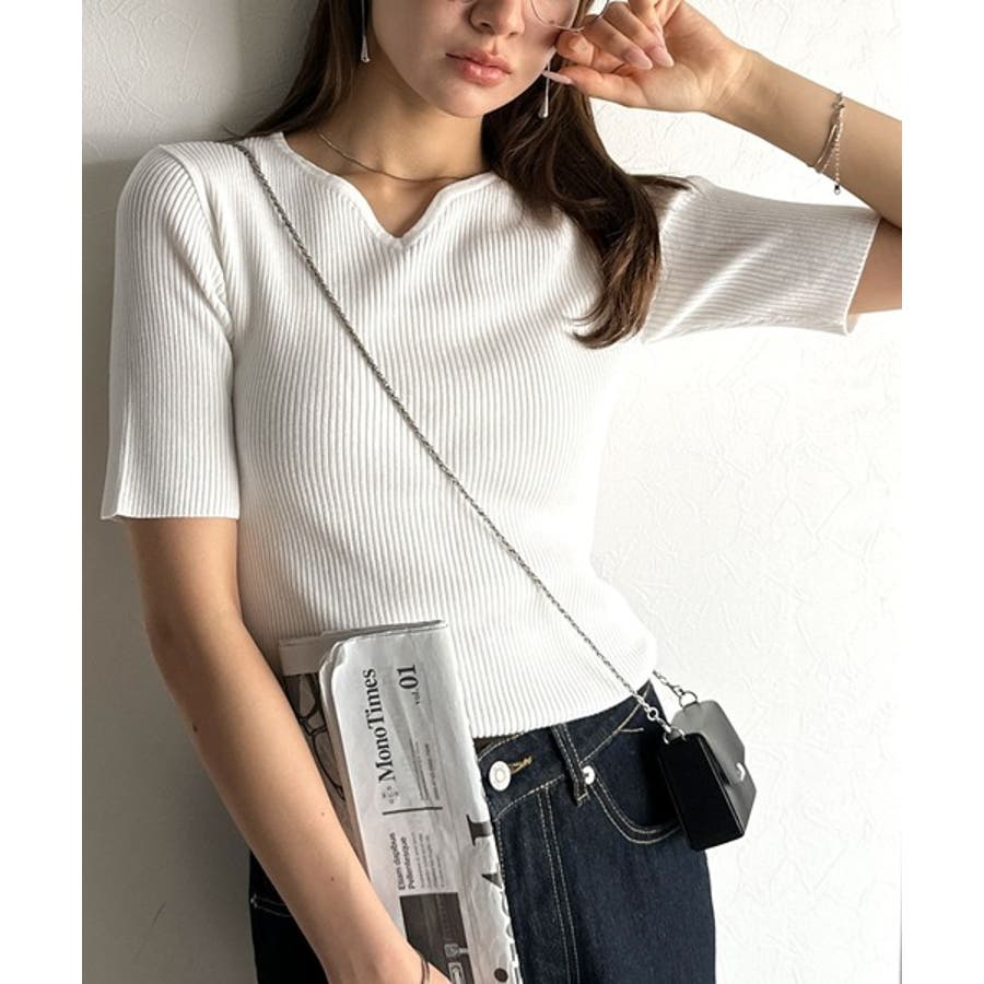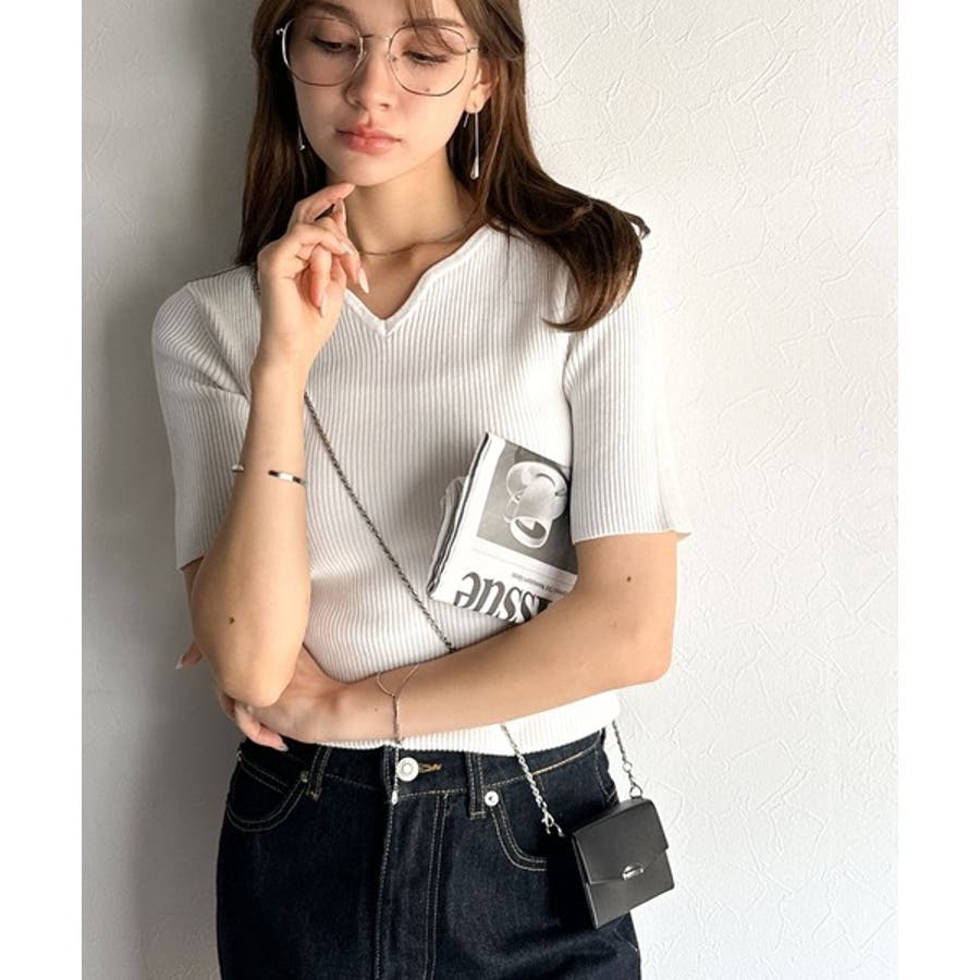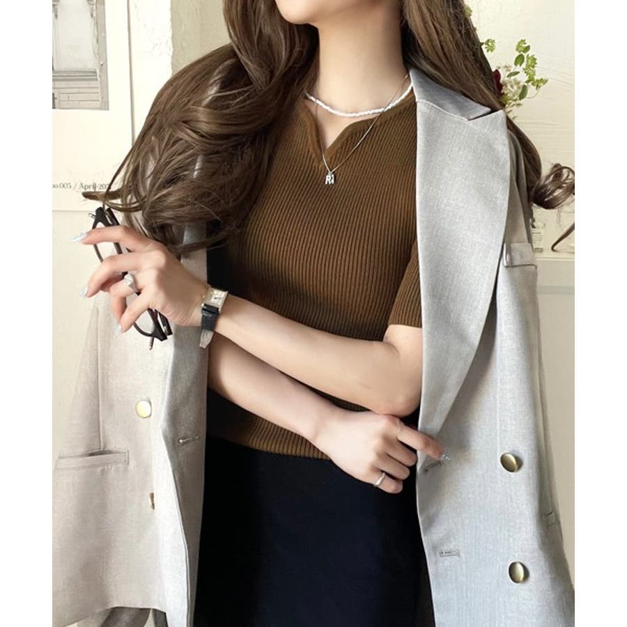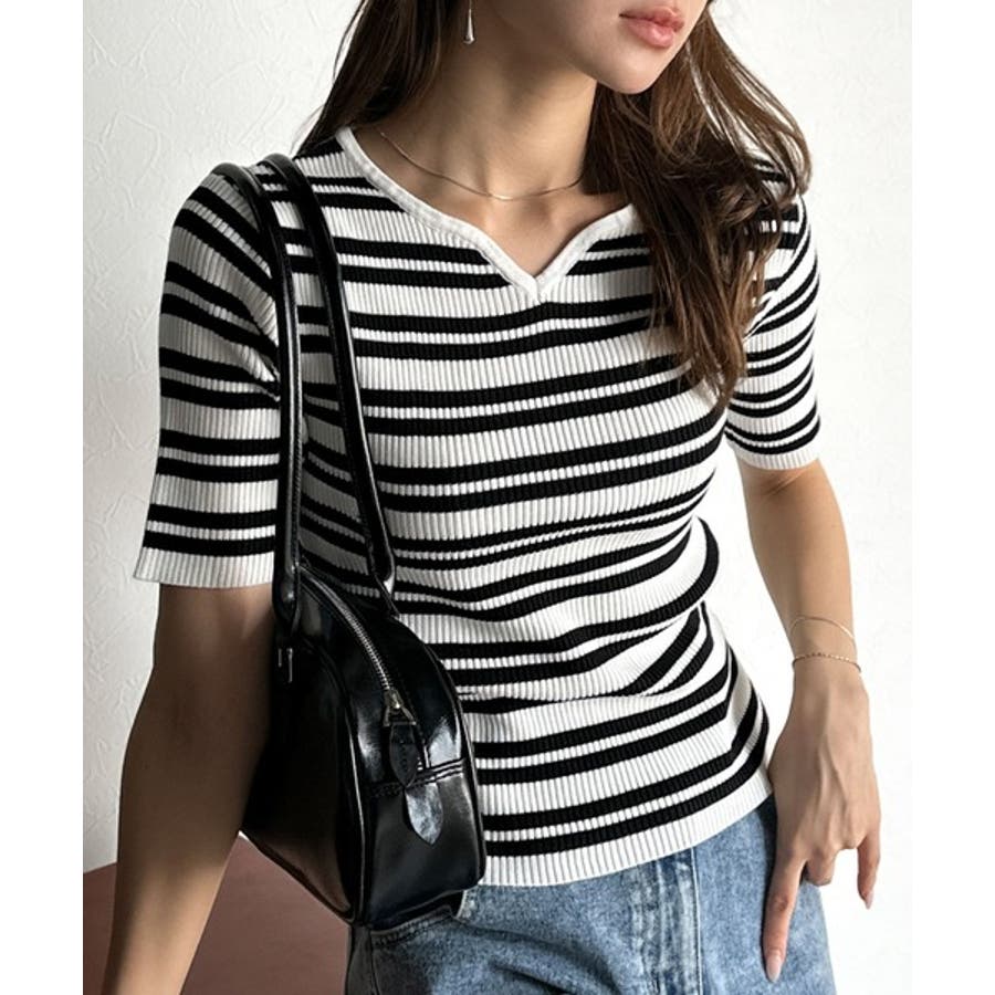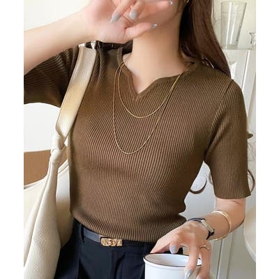 美デコルテを演出♪リブニットカーヴィーネックトップス(半袖)