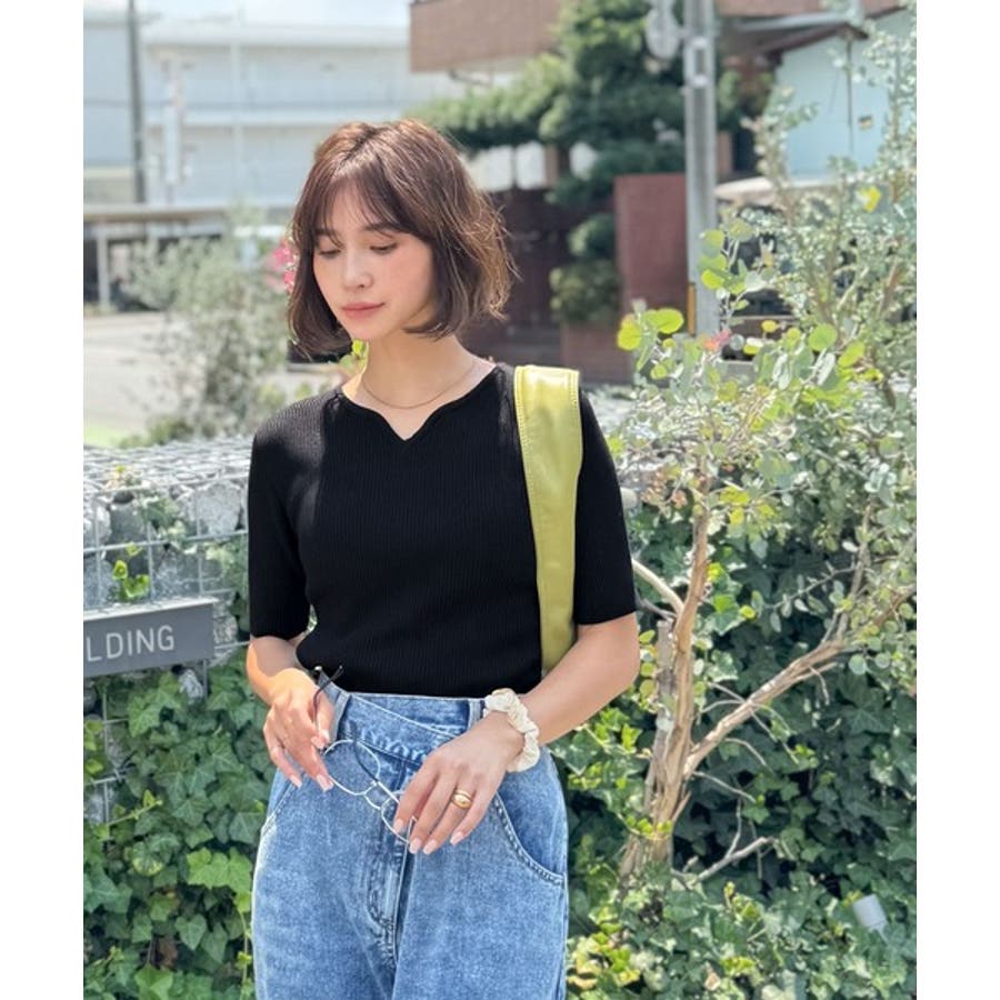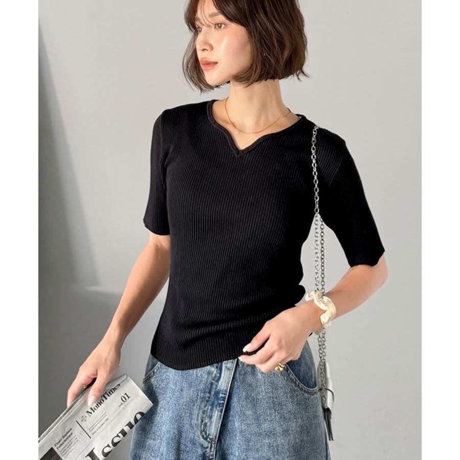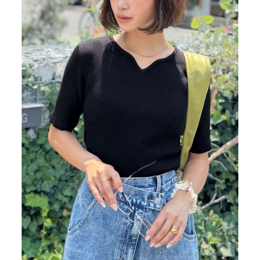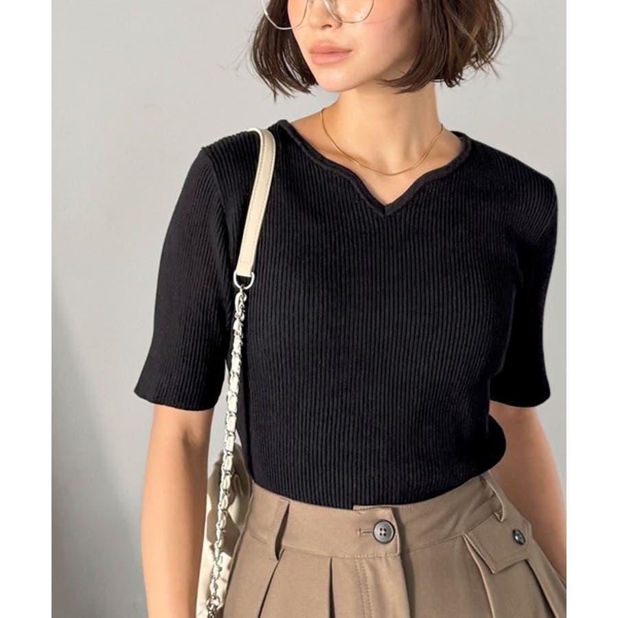緩やかにカーブを描いたネックラインが女性らしさを引き立てる、半袖のリブニットプルオーバー。