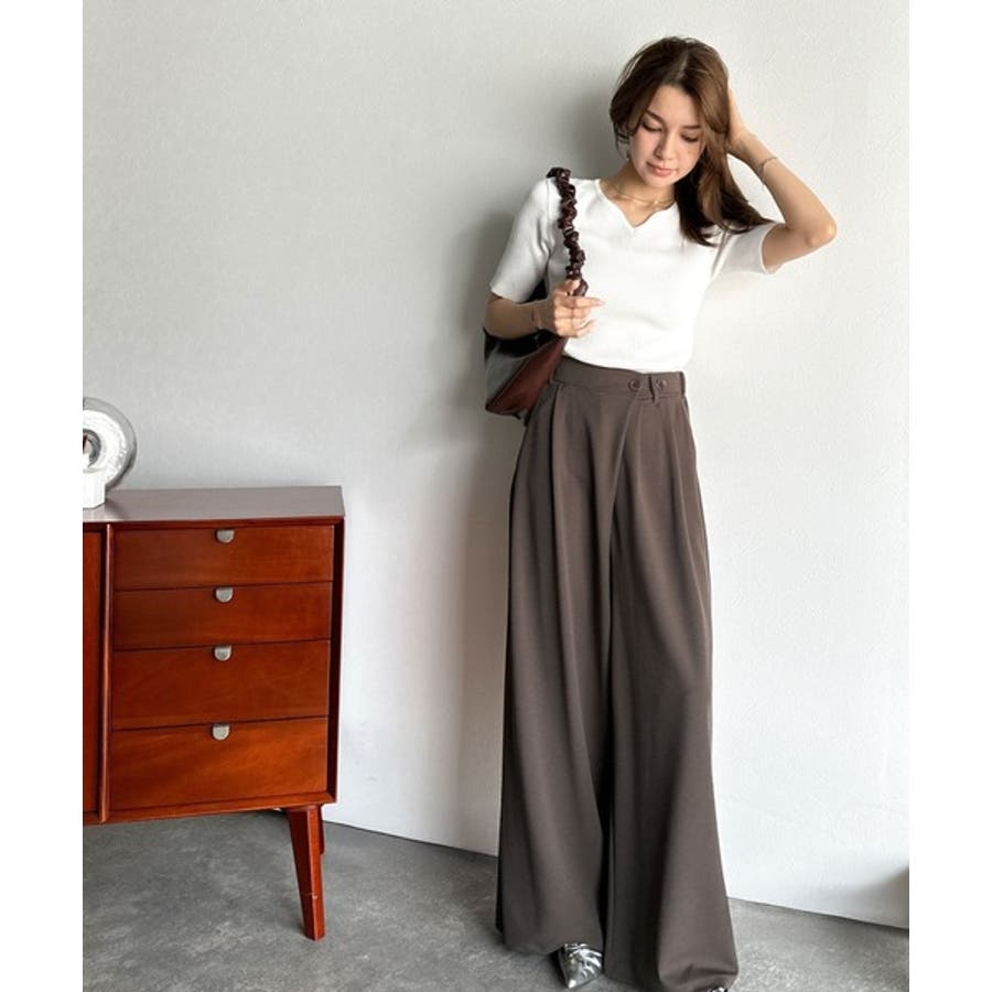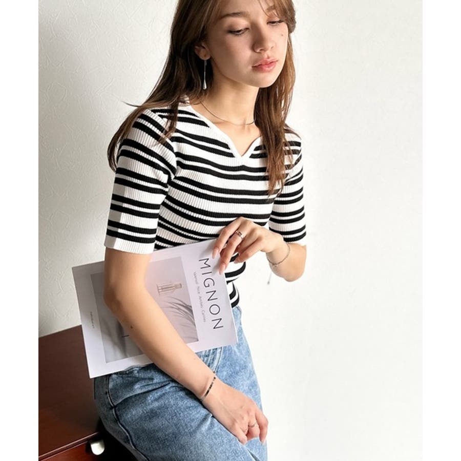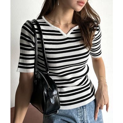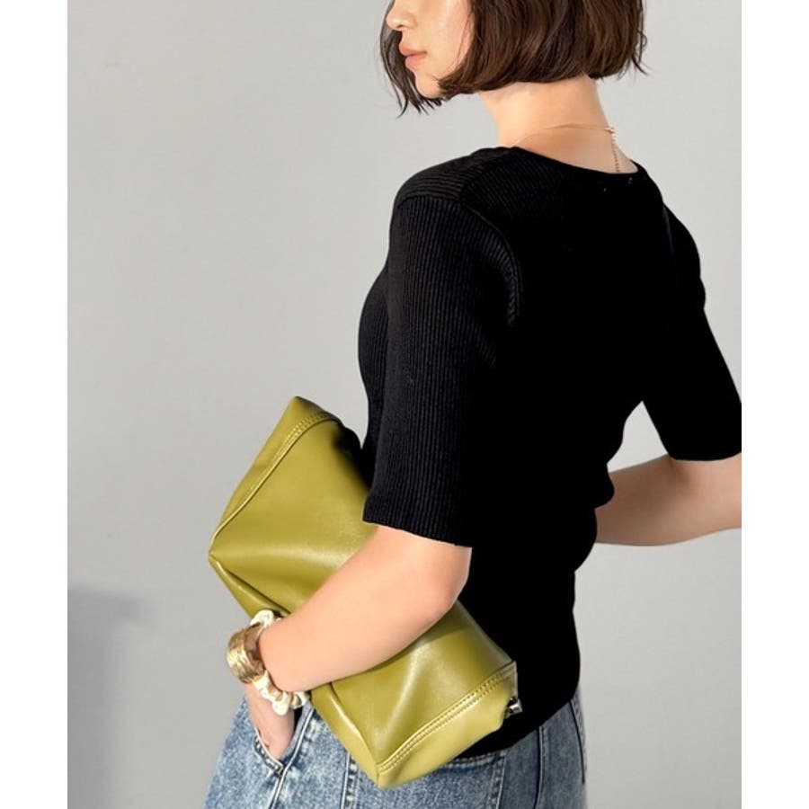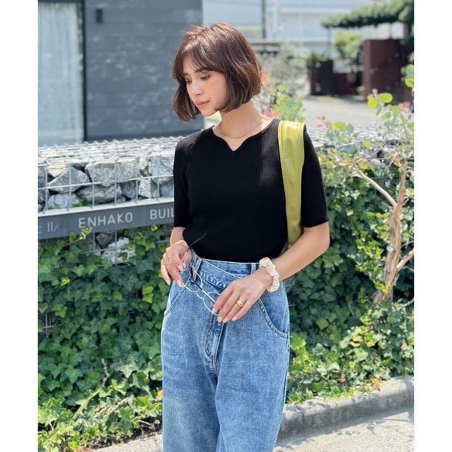 緩やかにカーブを描いたネックラインが女性らしさを引き立てる、半袖のリブニットプルオーバー。
