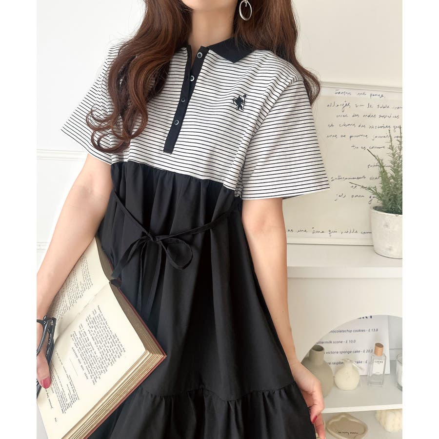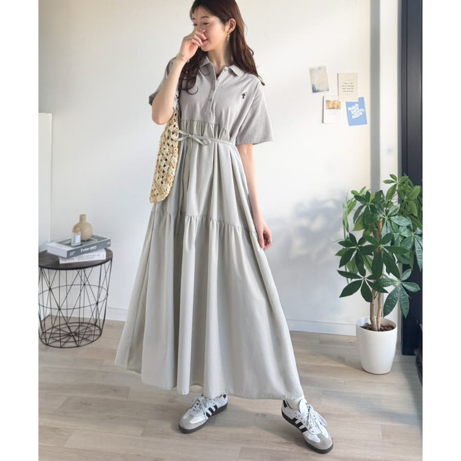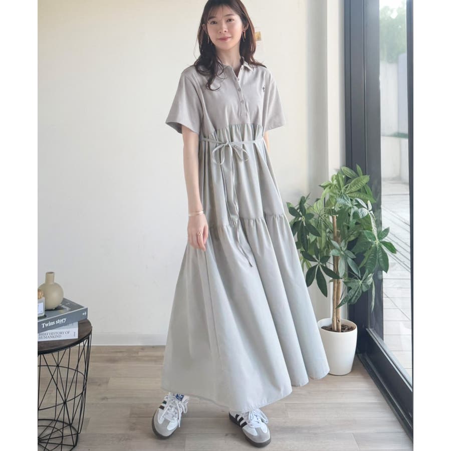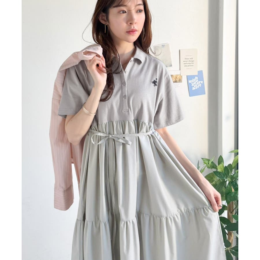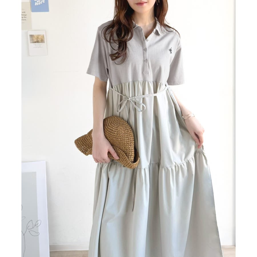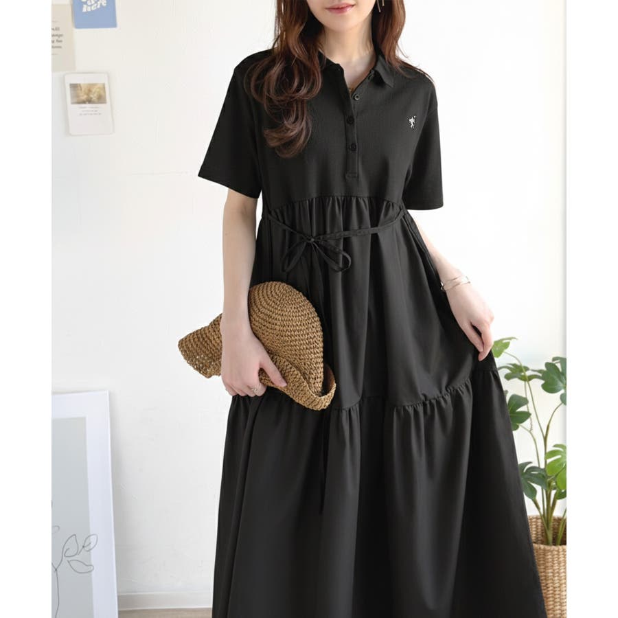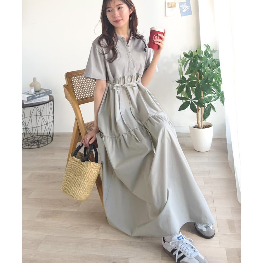 異素材ミックスが目を惹く。胸刺繍ポロ衿布帛切り替えカットティアードワンピース(半…
