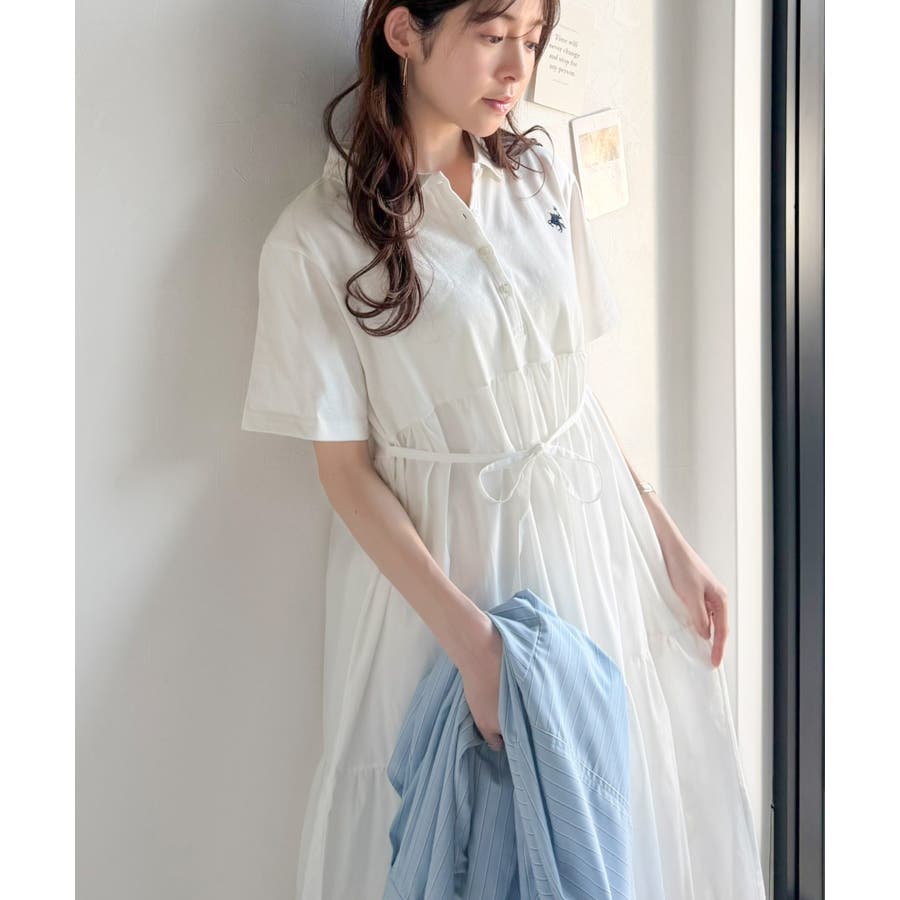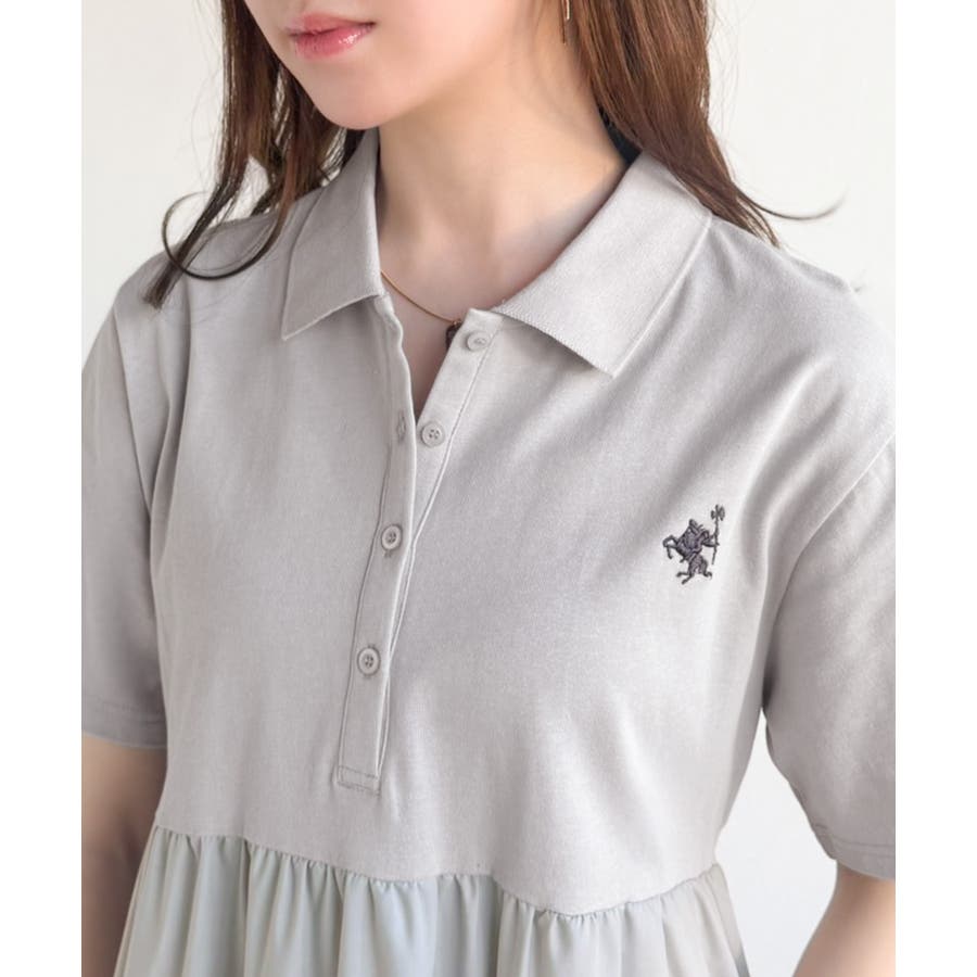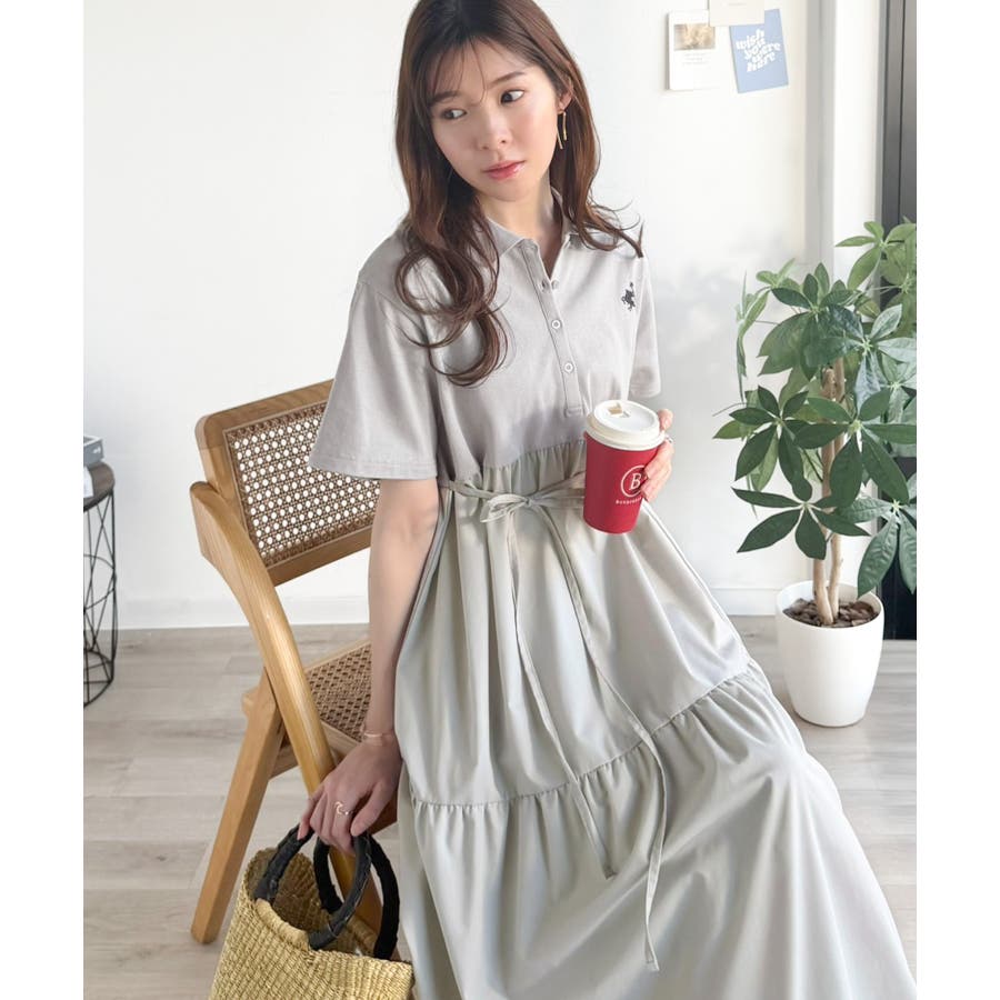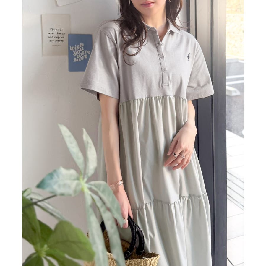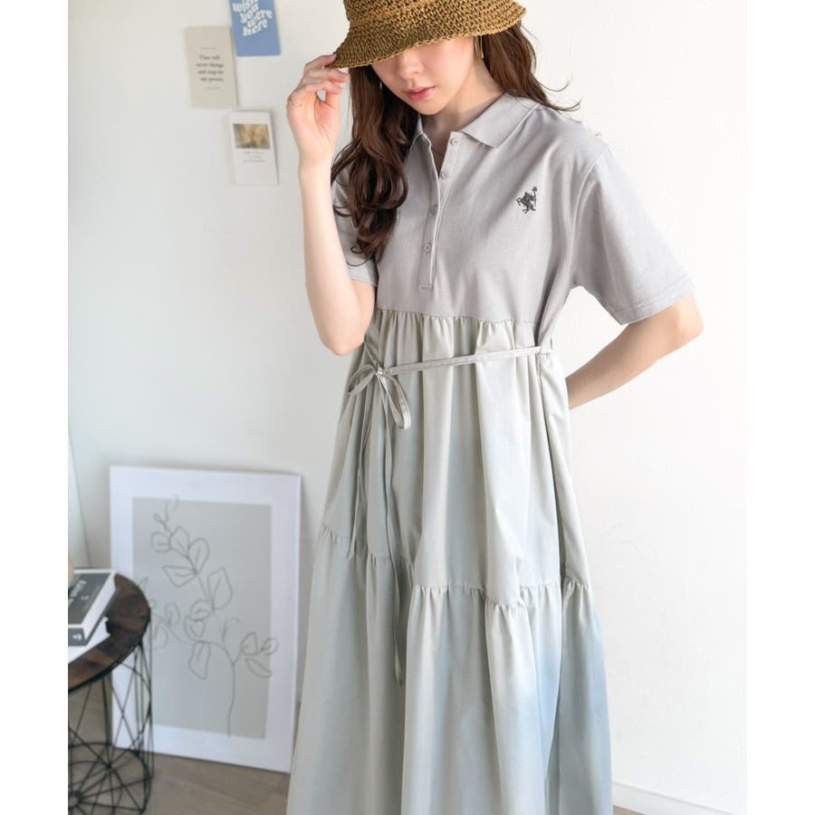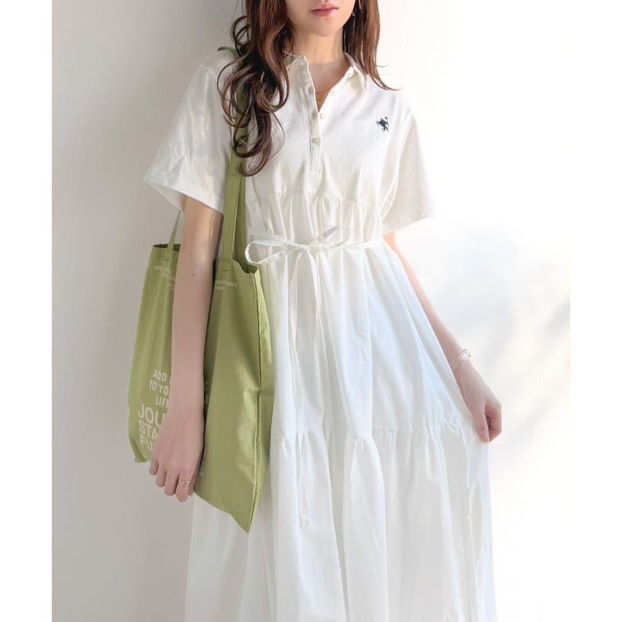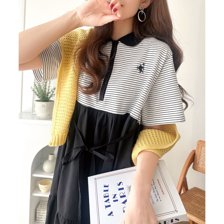 異素材ミックスが目を惹く。胸刺繍ポロ衿布帛切り替えカットティアードワンピース(半…