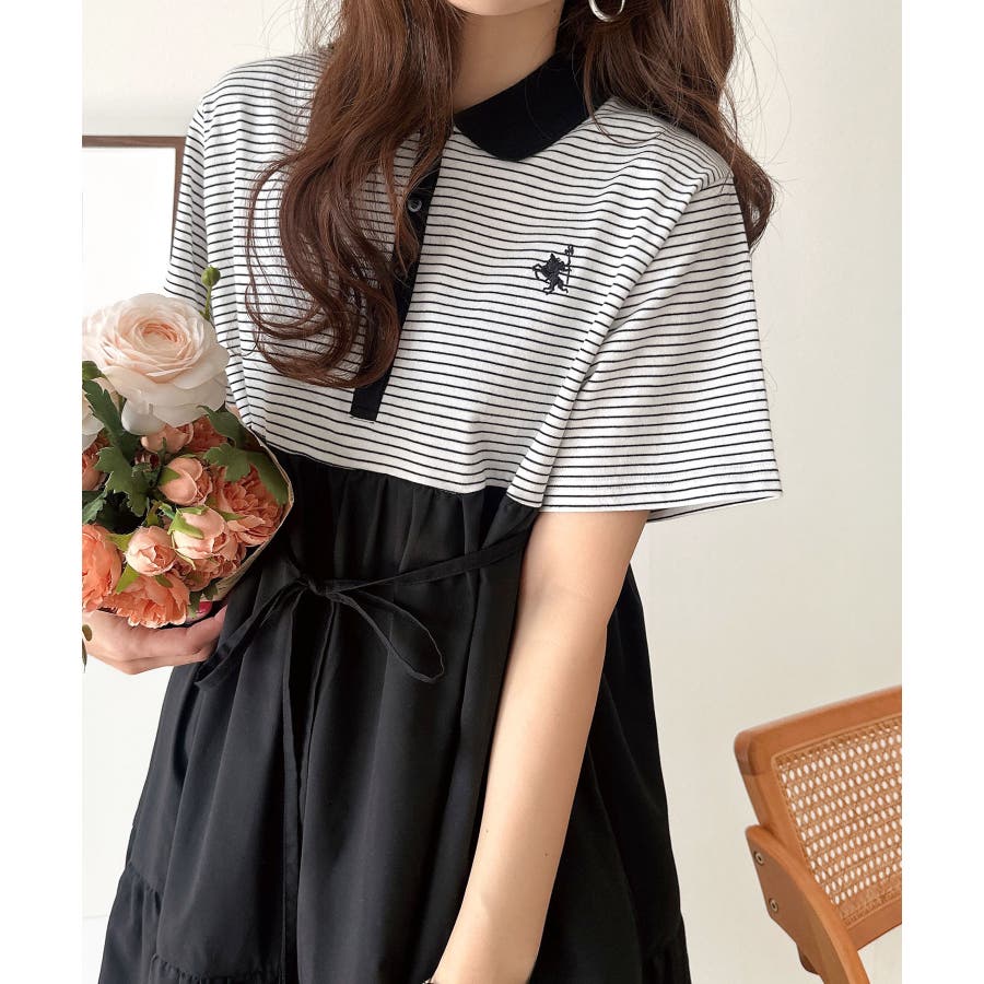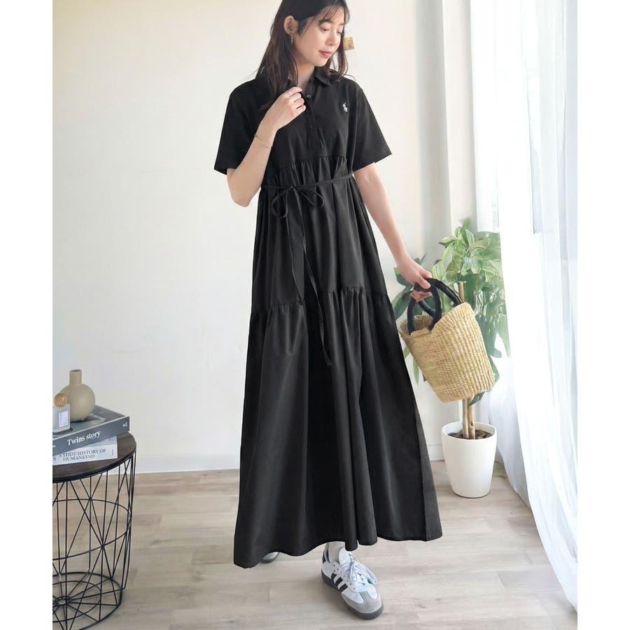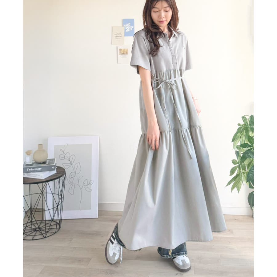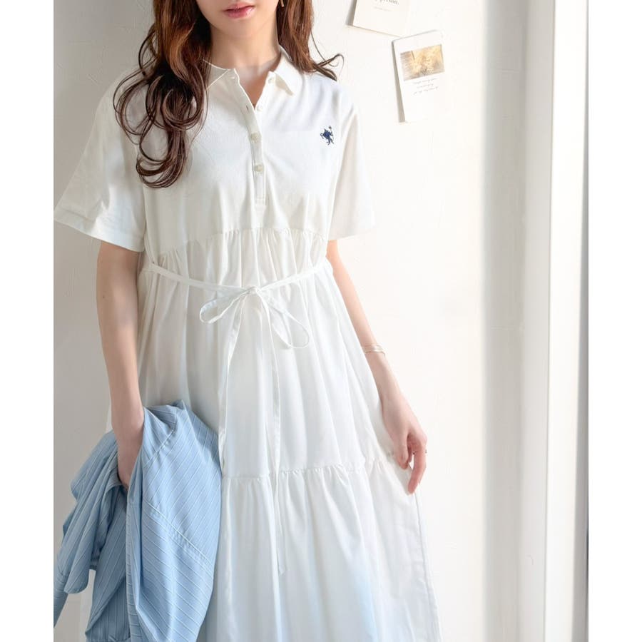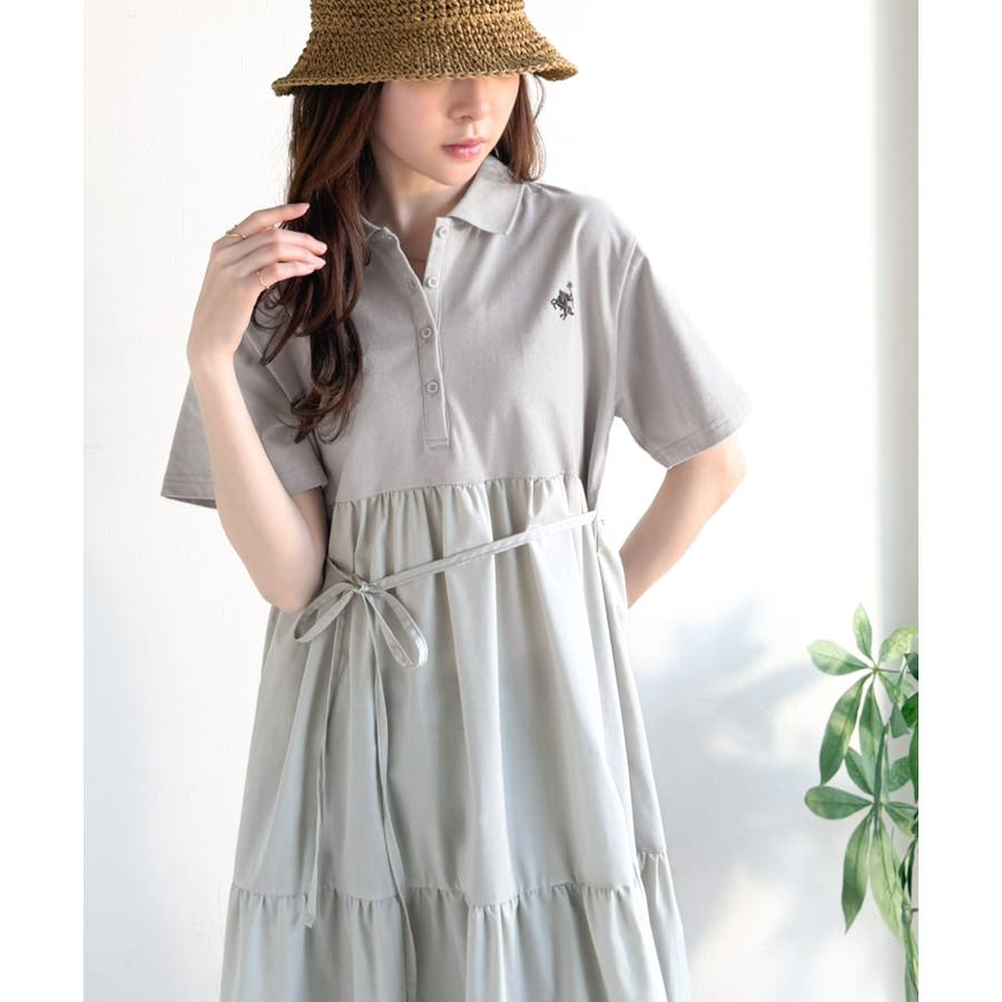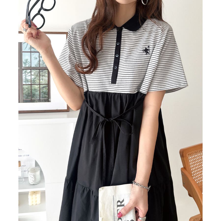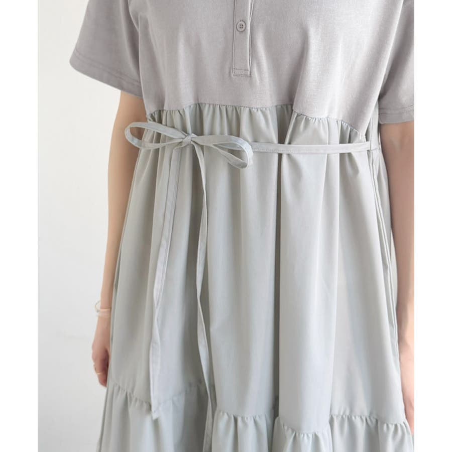 異素材ミックスが目を惹く。胸刺繍ポロ衿布帛切り替えカットティアードワンピース(半…