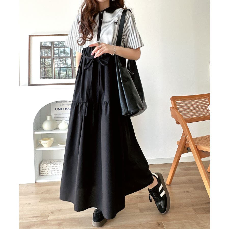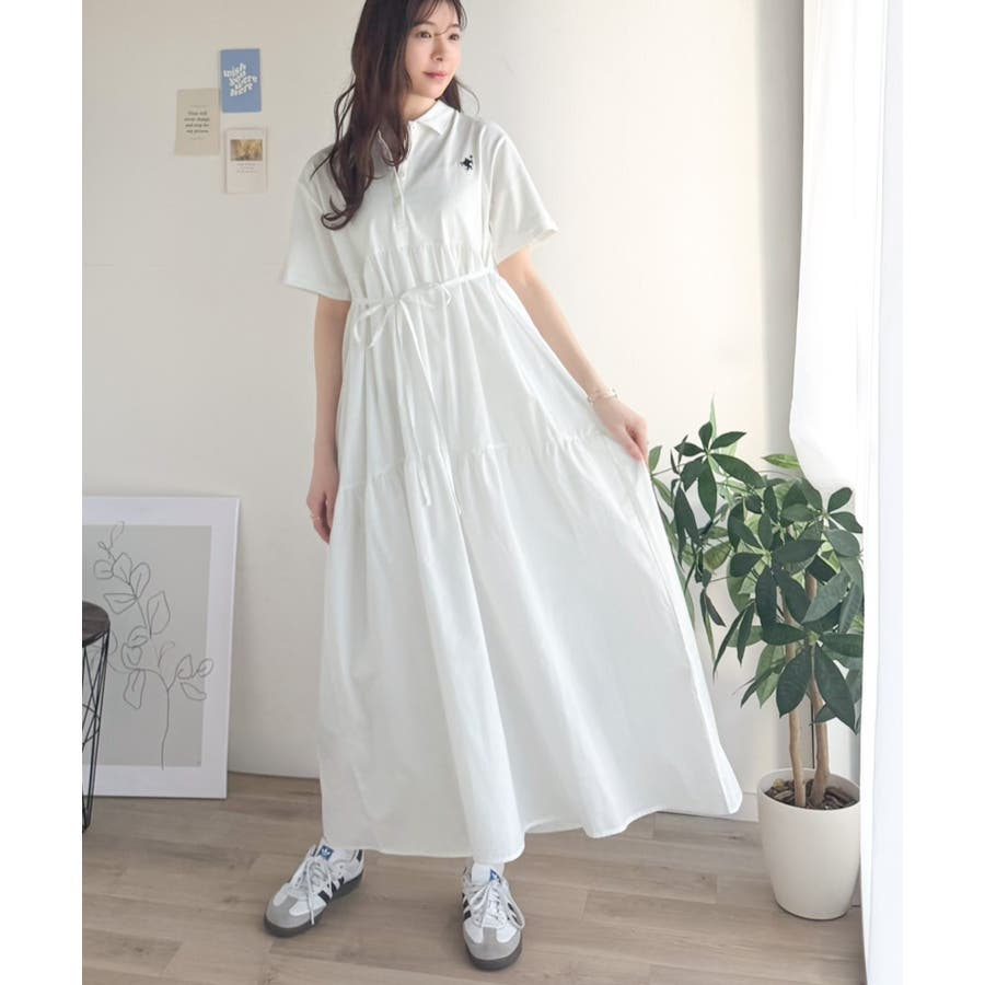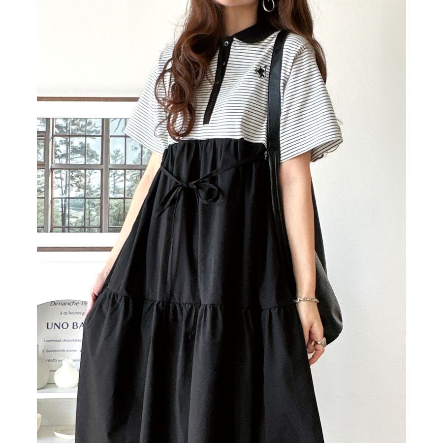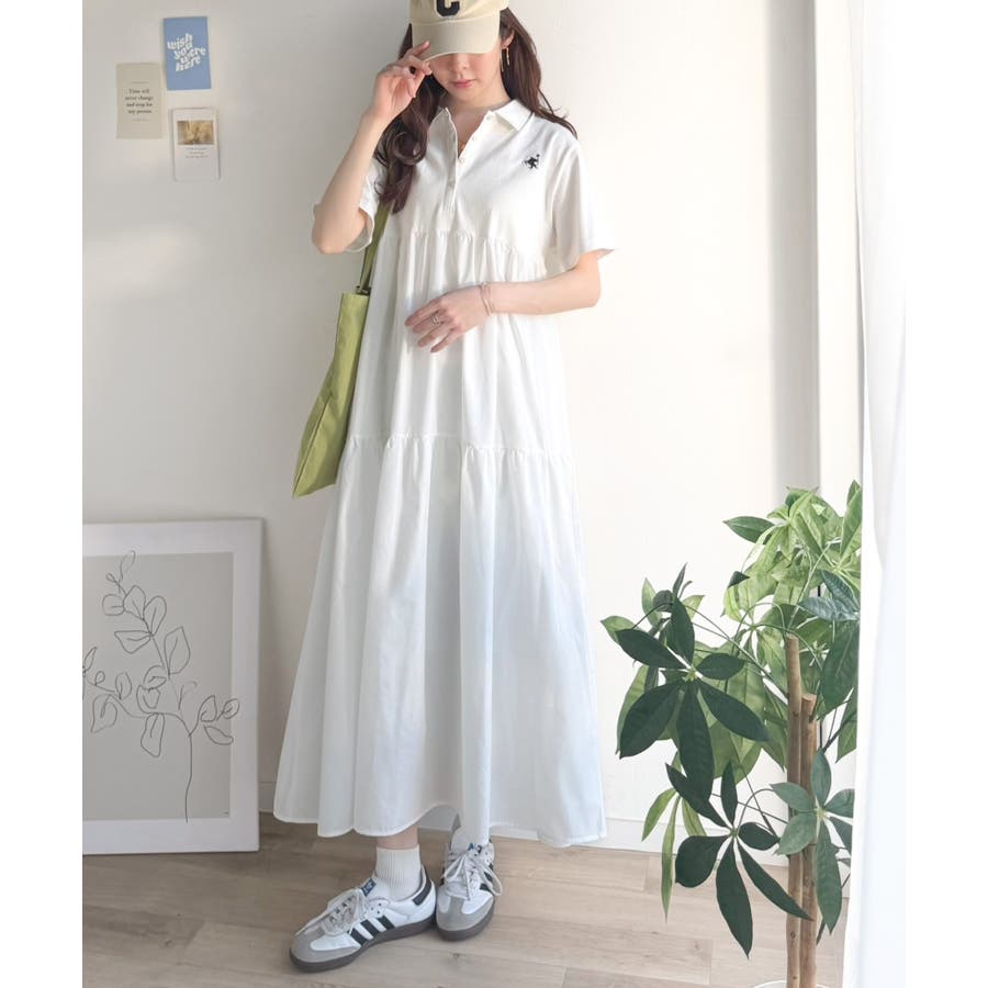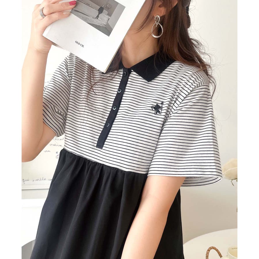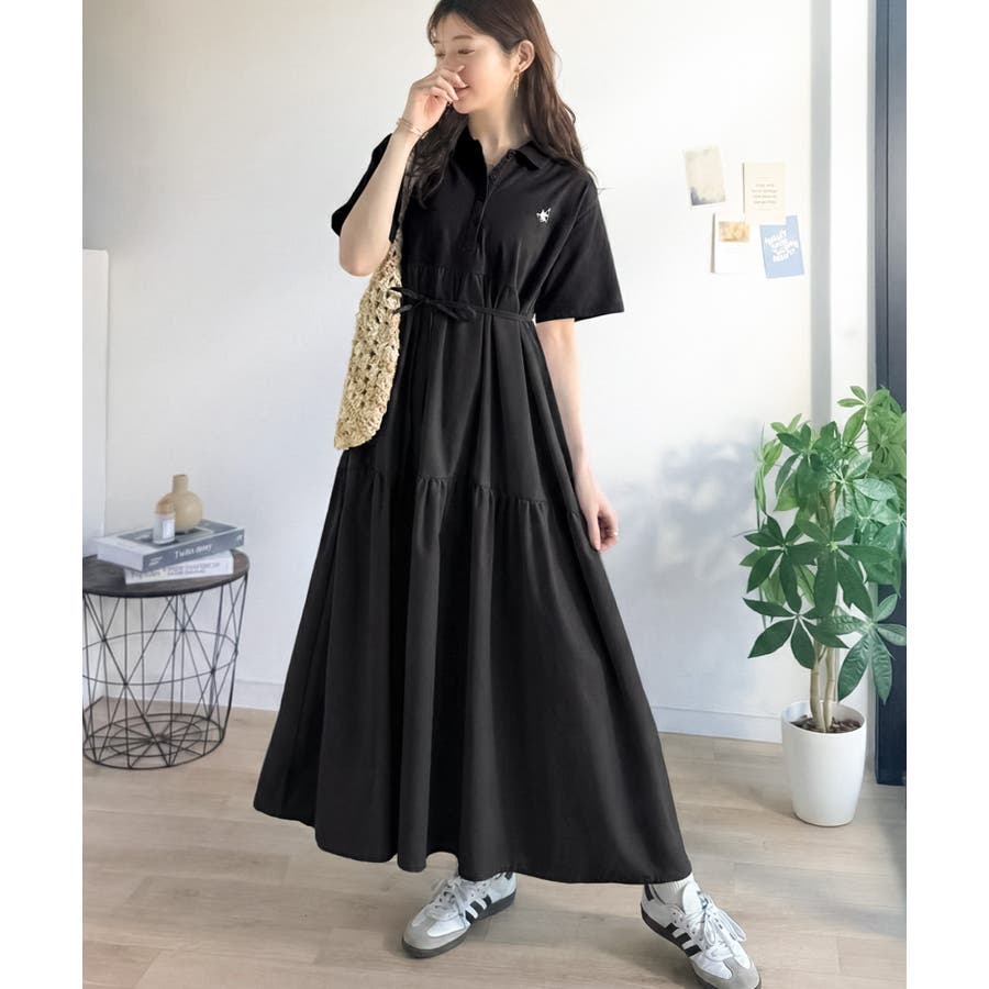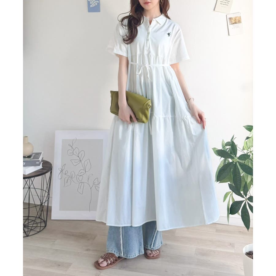 異素材ミックスが目を惹く。胸刺繍ポロ衿布帛切り替えカットティアードワンピース(半…