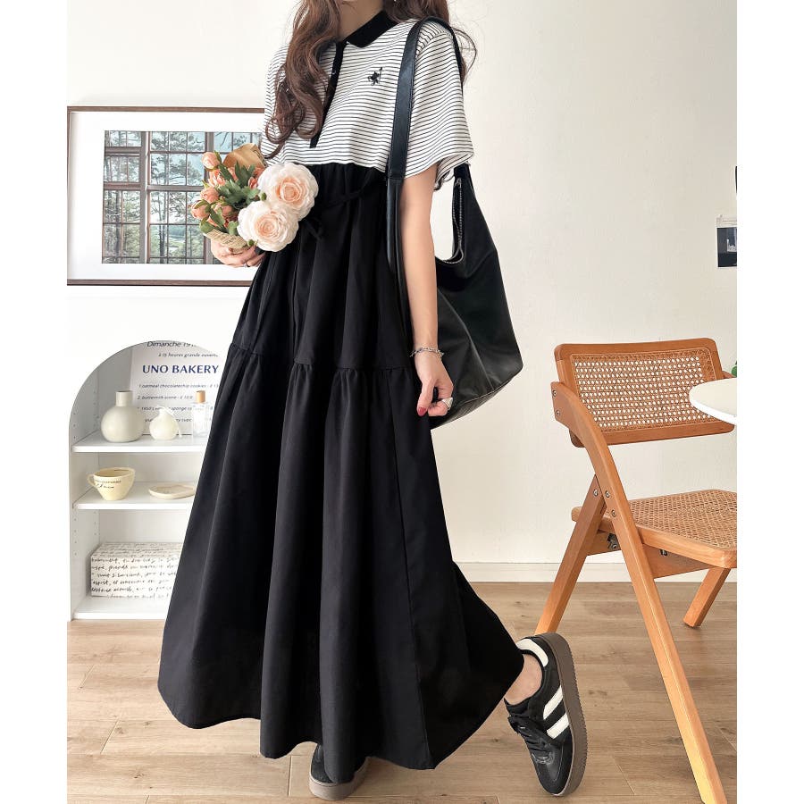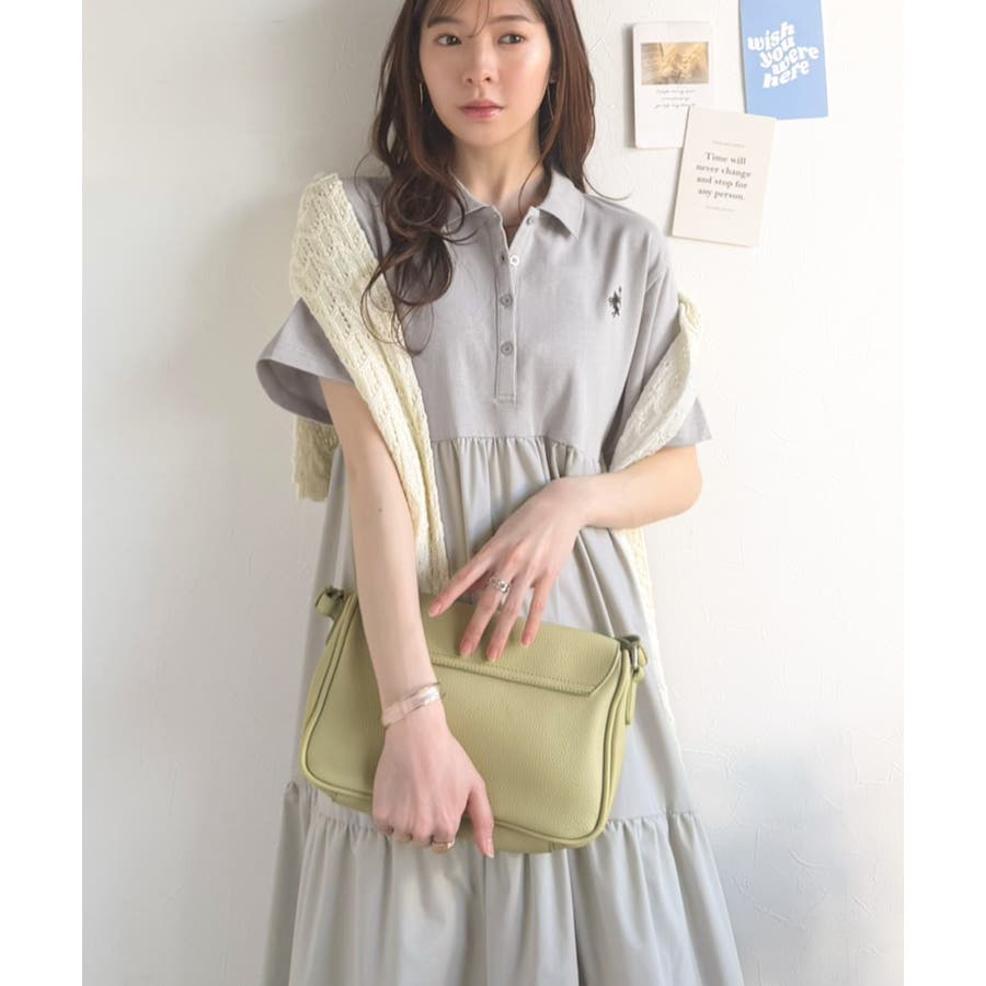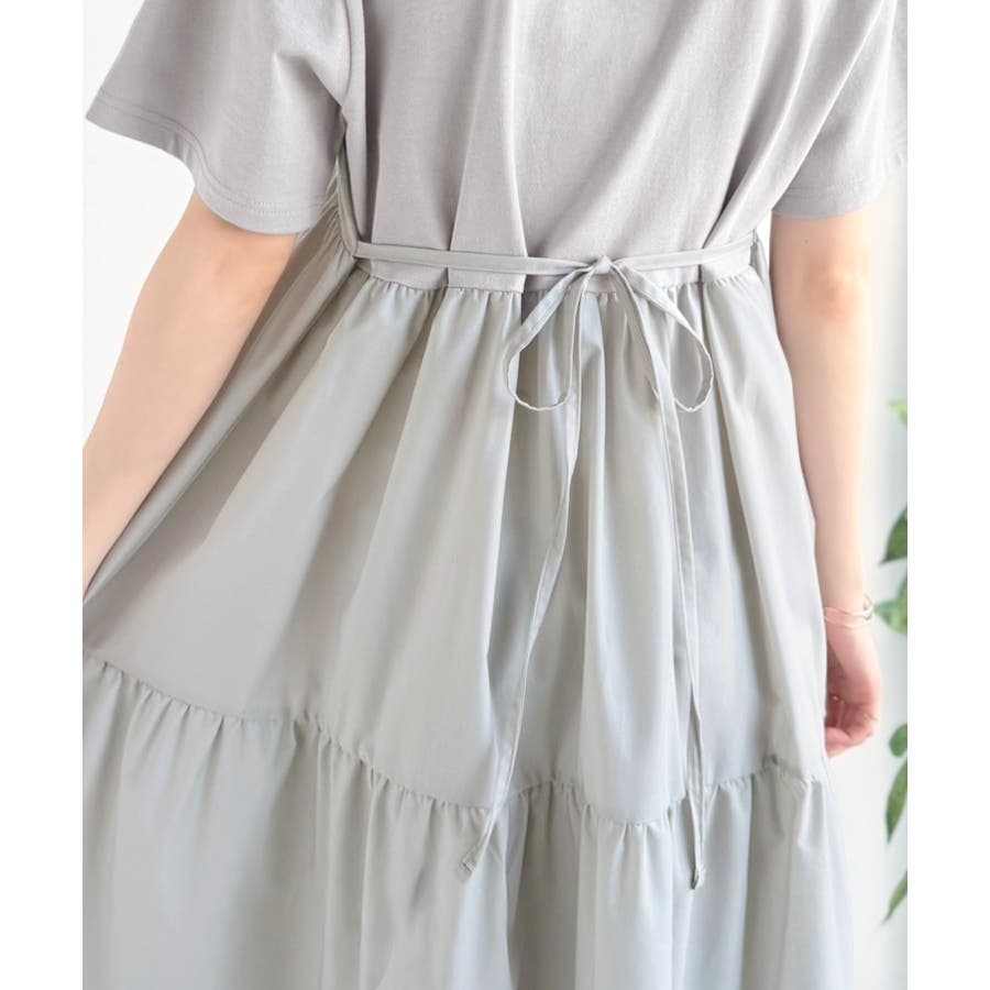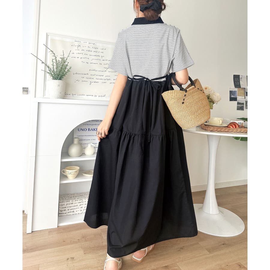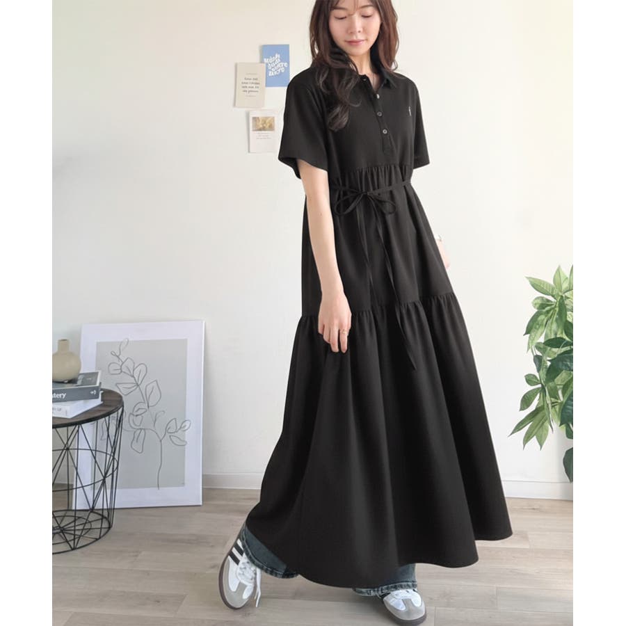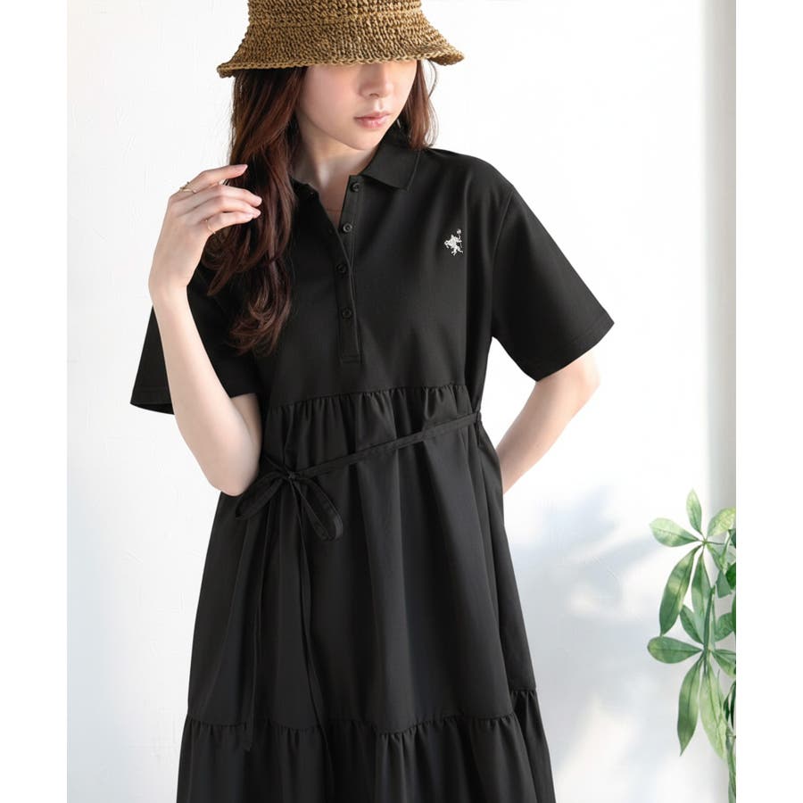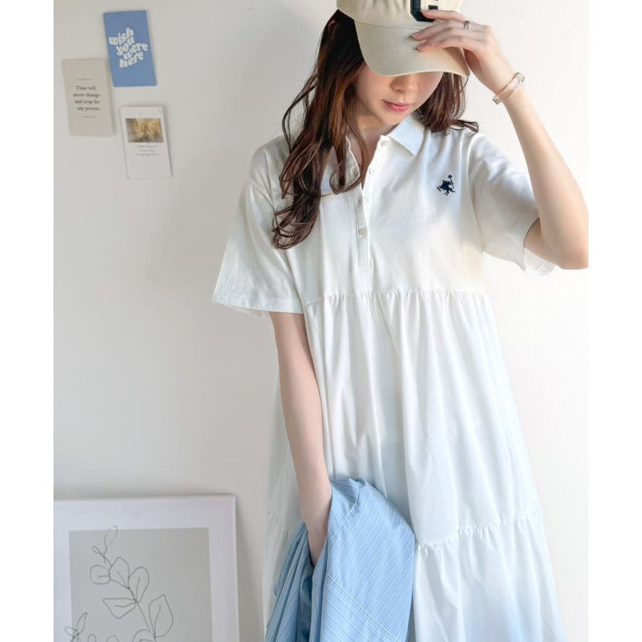異素材ミックスが目を惹く。胸刺繍ポロ衿布帛切り替えカットティアードワンピース(半…