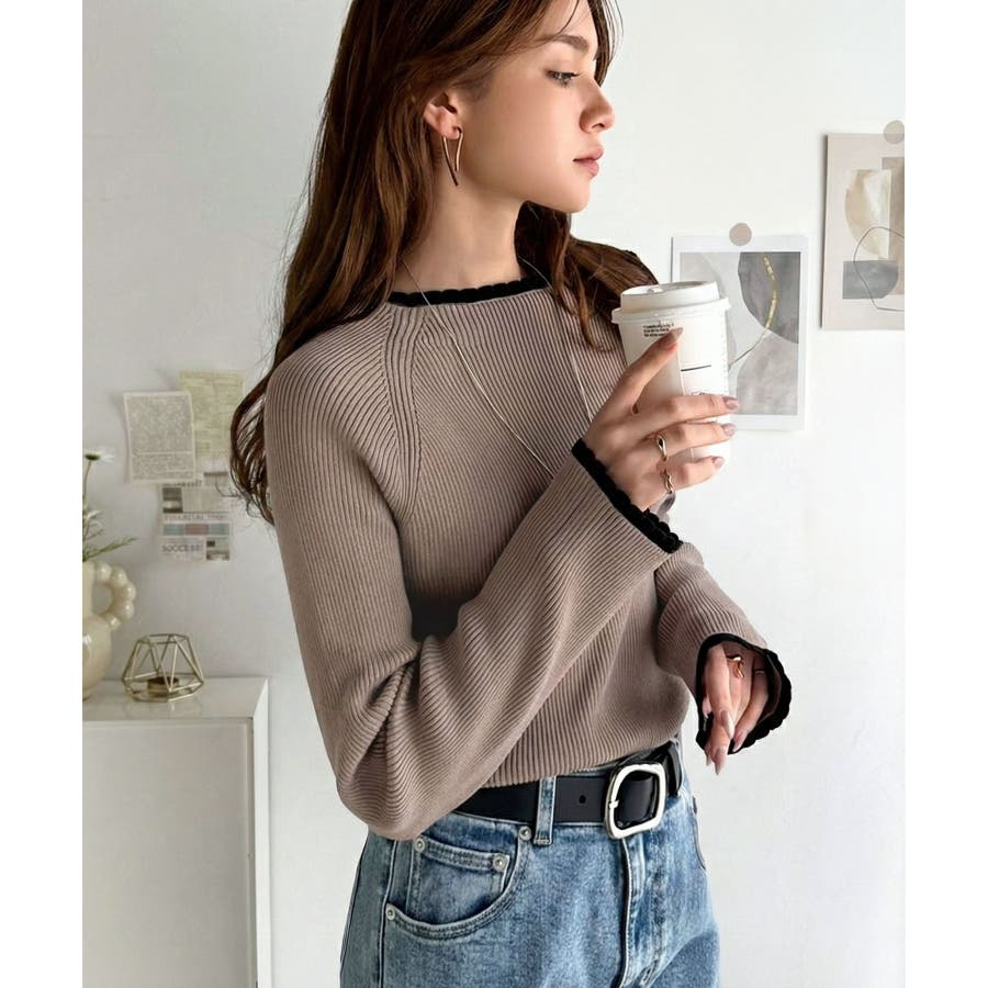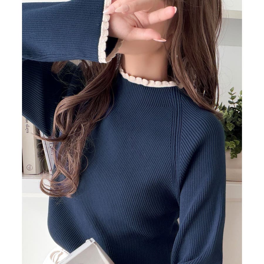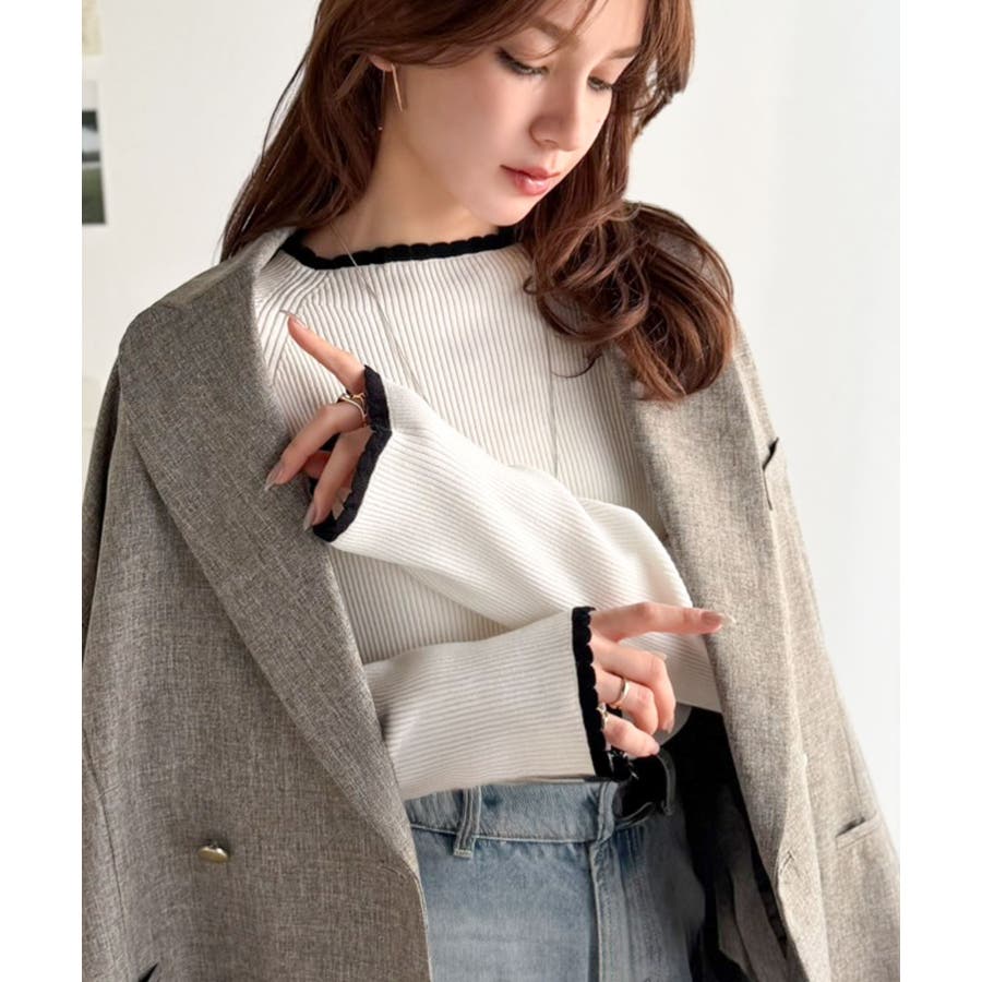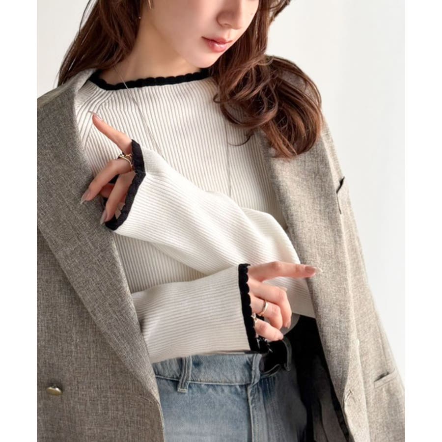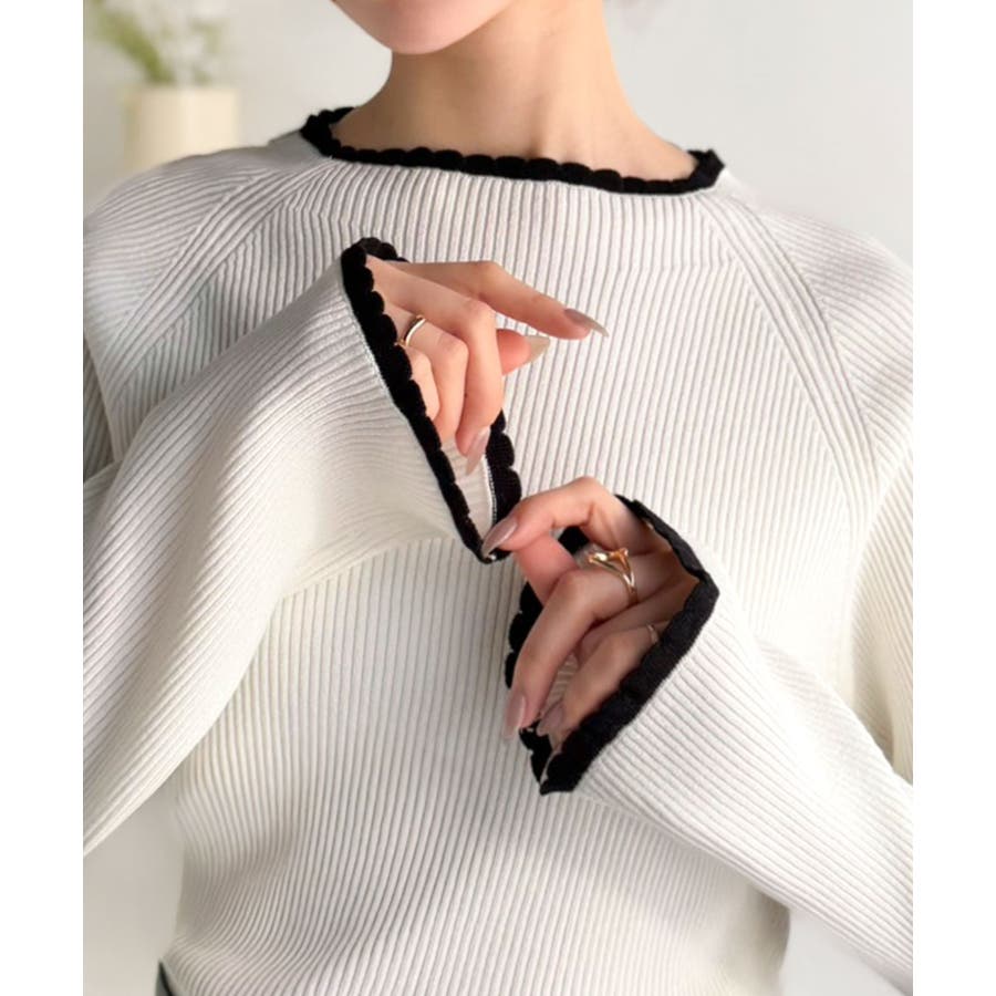 衿と袖口にスカラップフリルを施した、フェミニンムード漂うニットトップス。