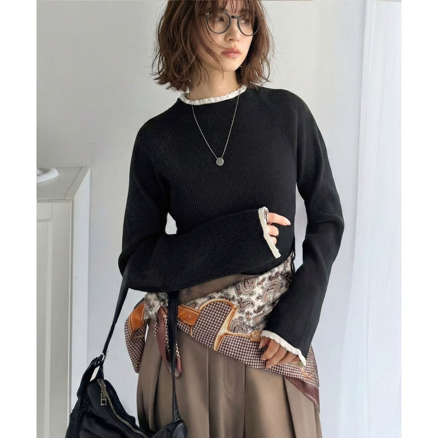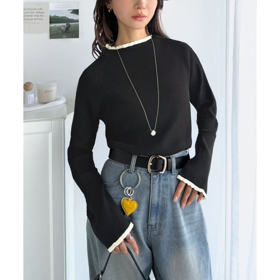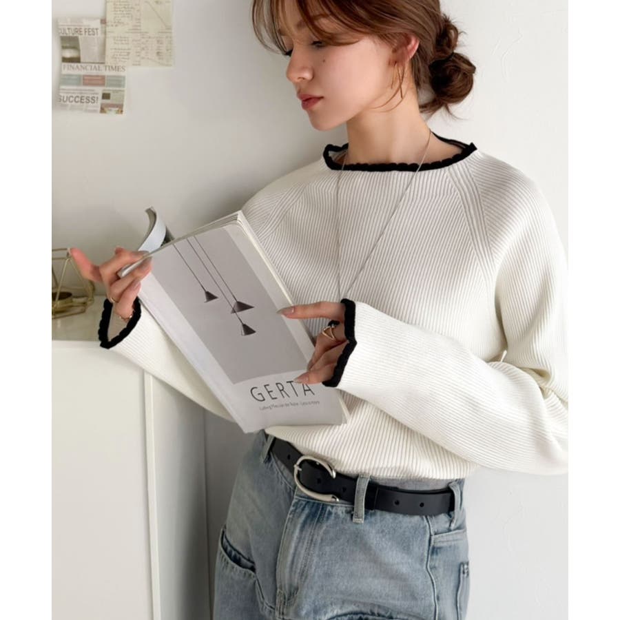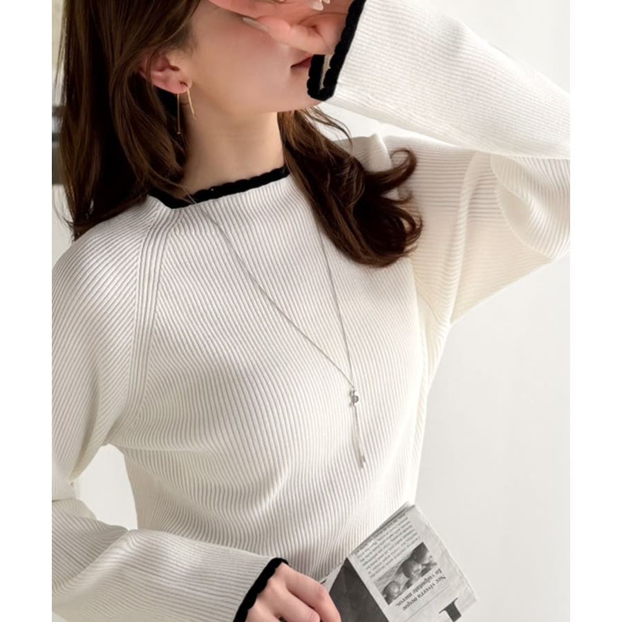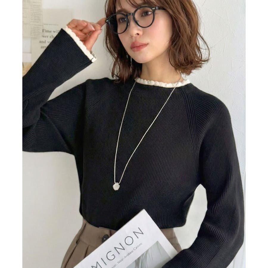衿と袖口にスカラップフリルを施した、フェミニンムード漂うニットトップス。