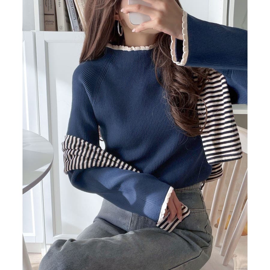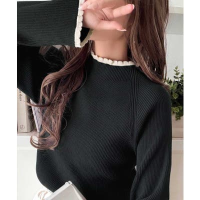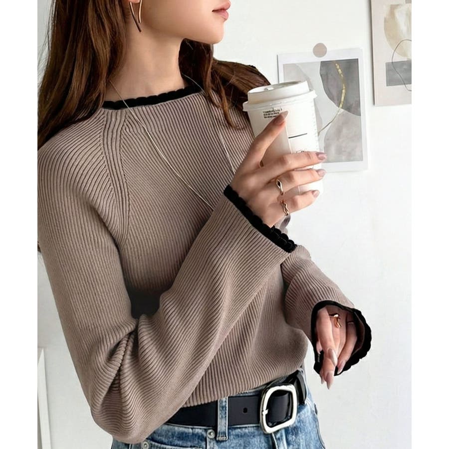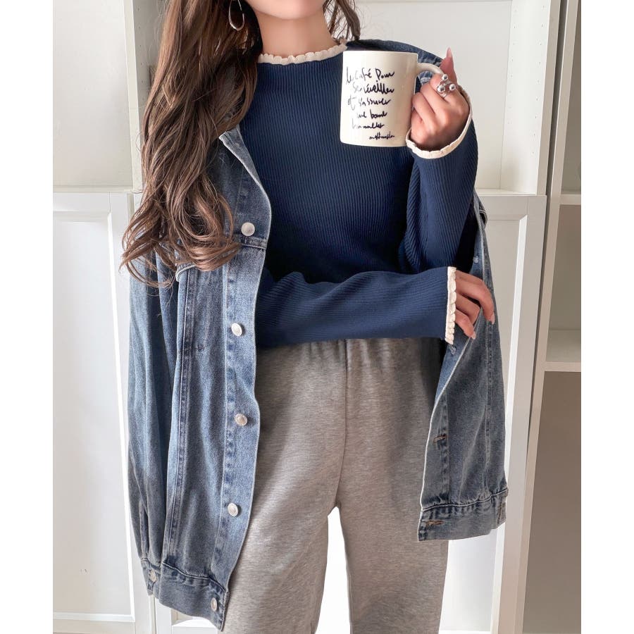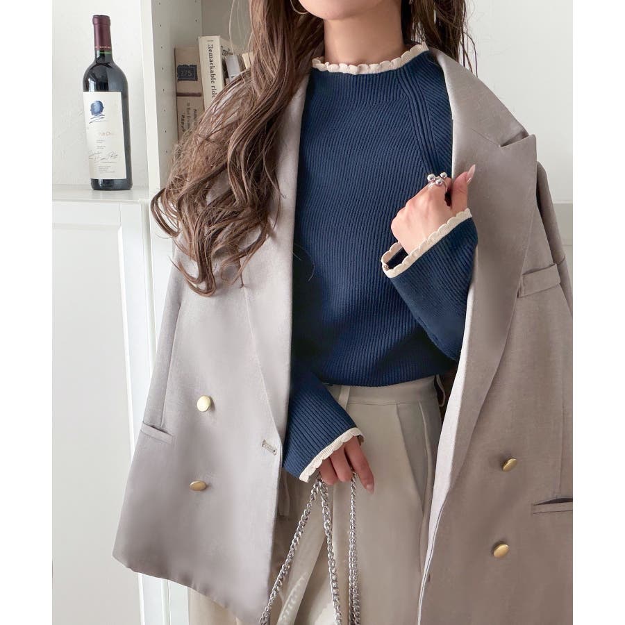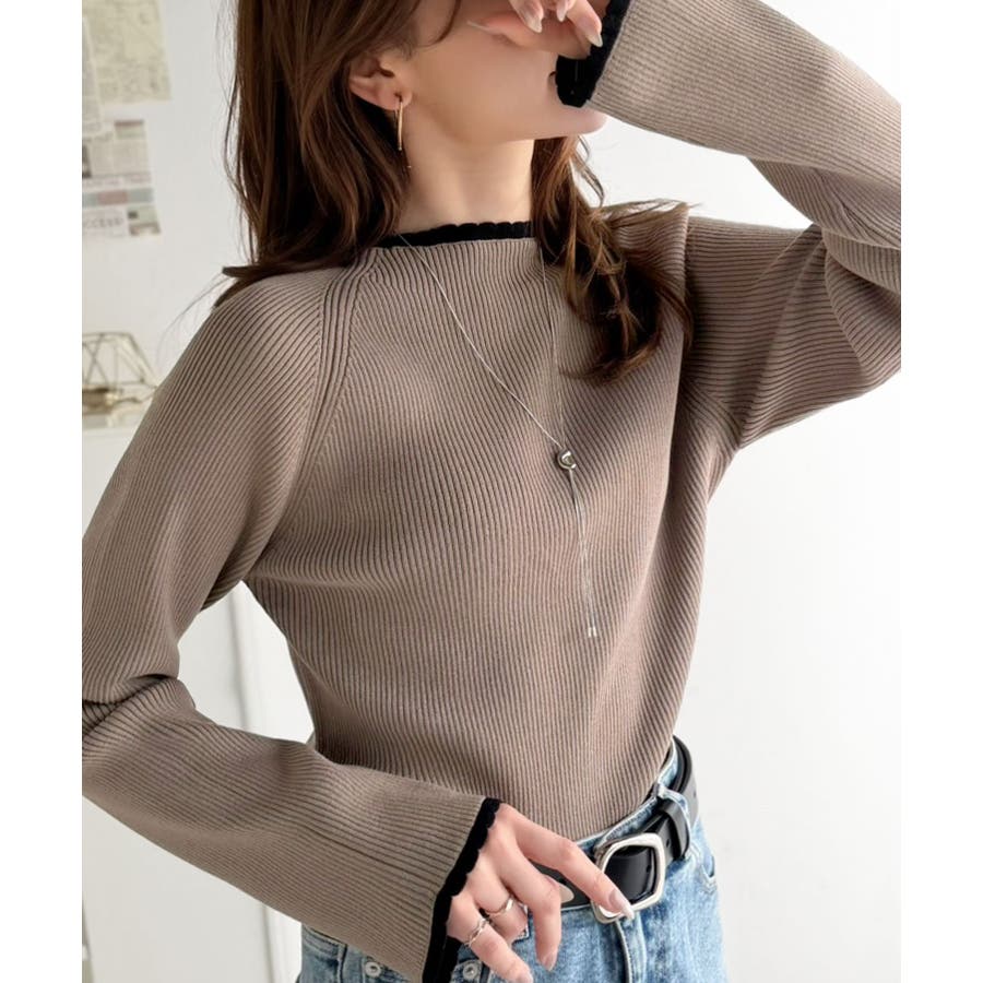 衿と袖口にスカラップフリルを施した、フェミニンムード漂うニットトップス。