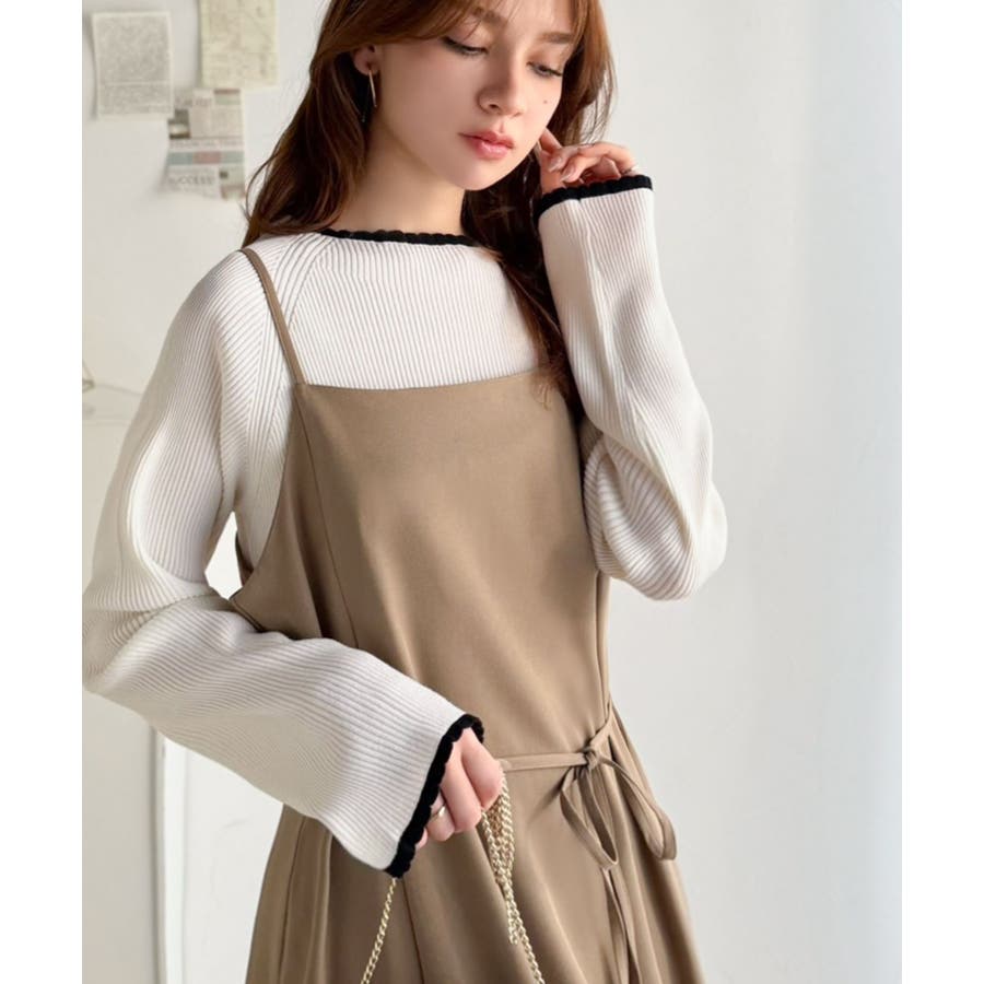 上品なネックデザインで首元と袖に大人っぽさを演出し、