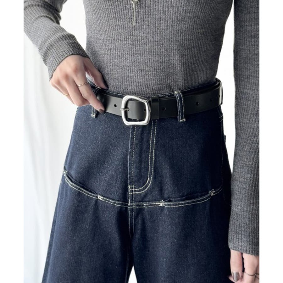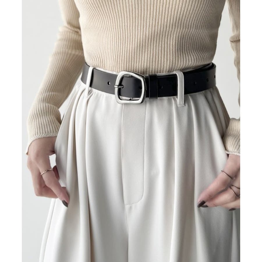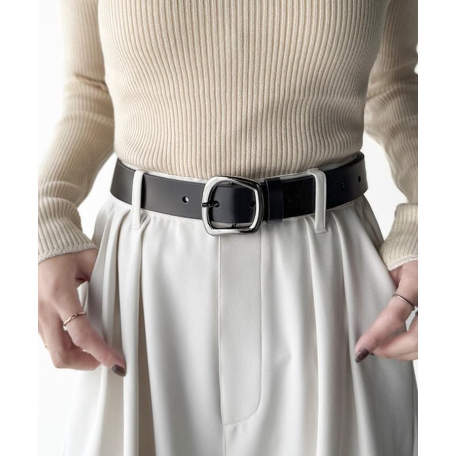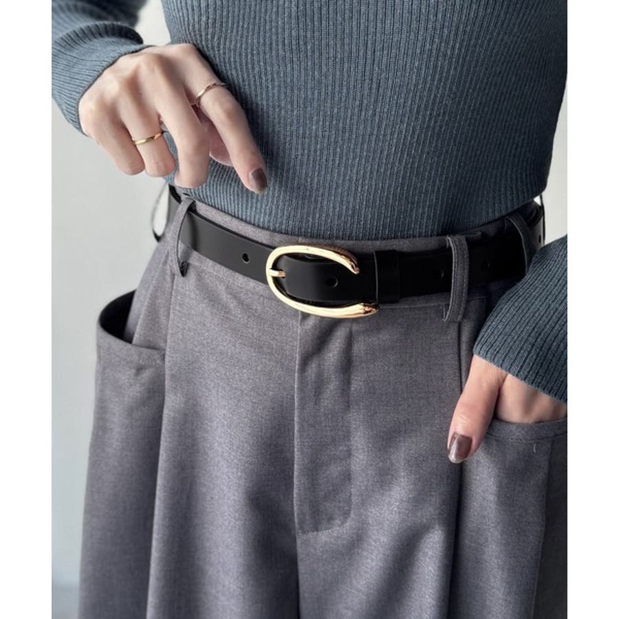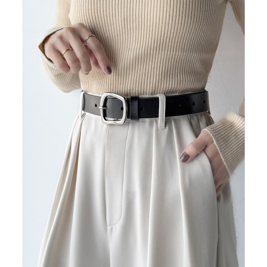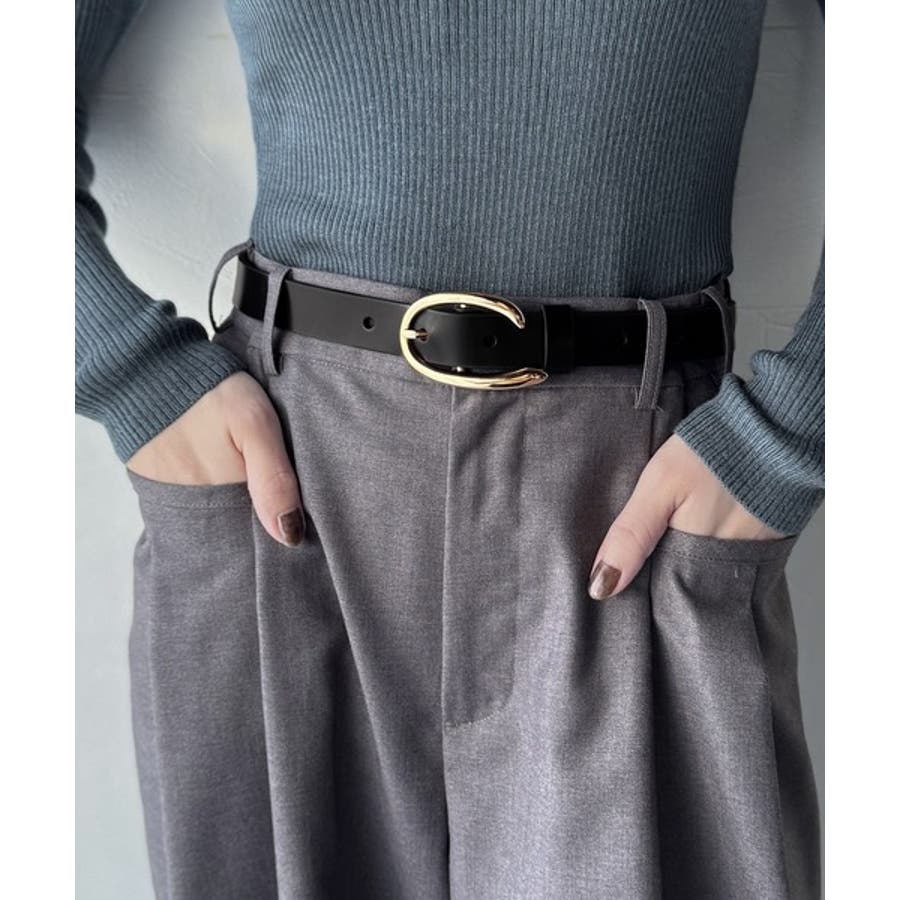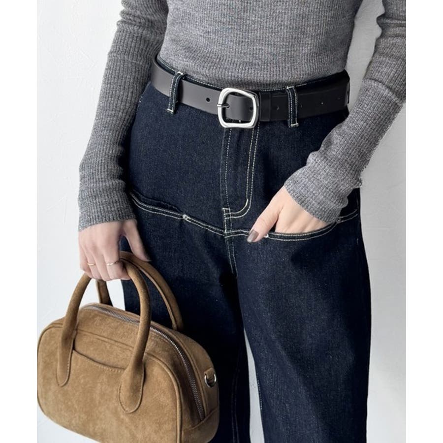 トップスをインしたスタイリングで、バックルのデザインが映える着こなしに。
