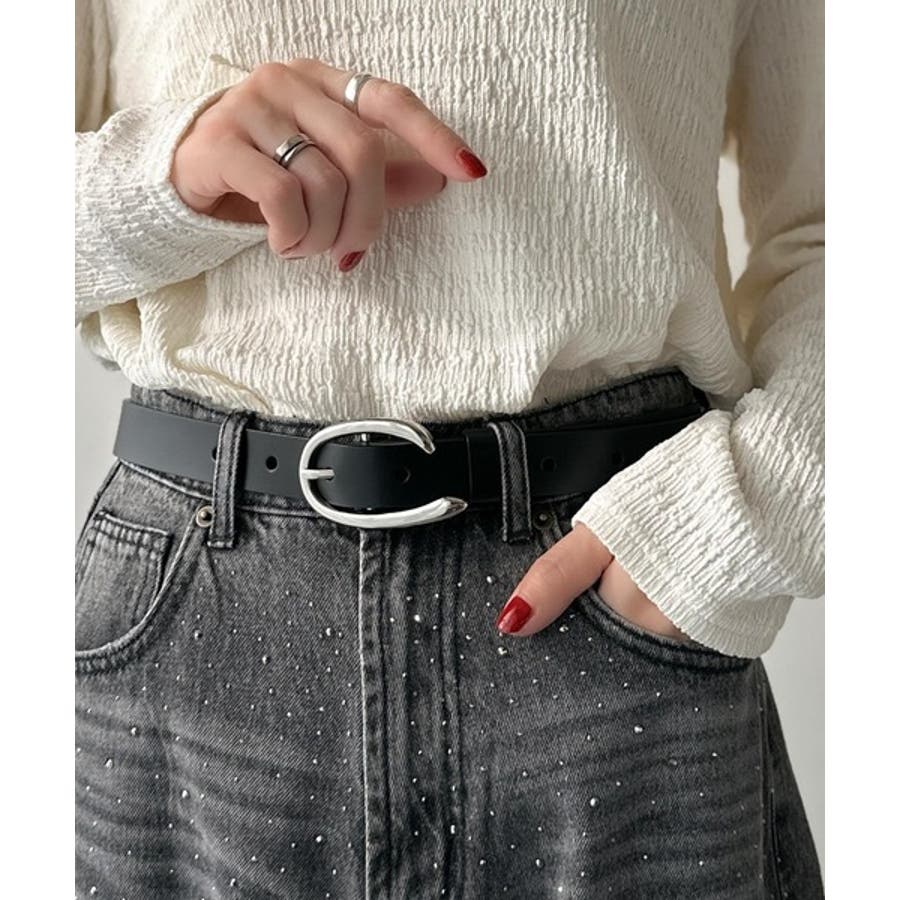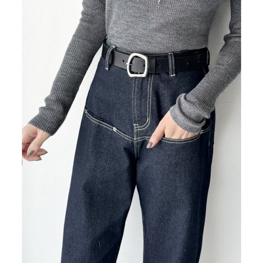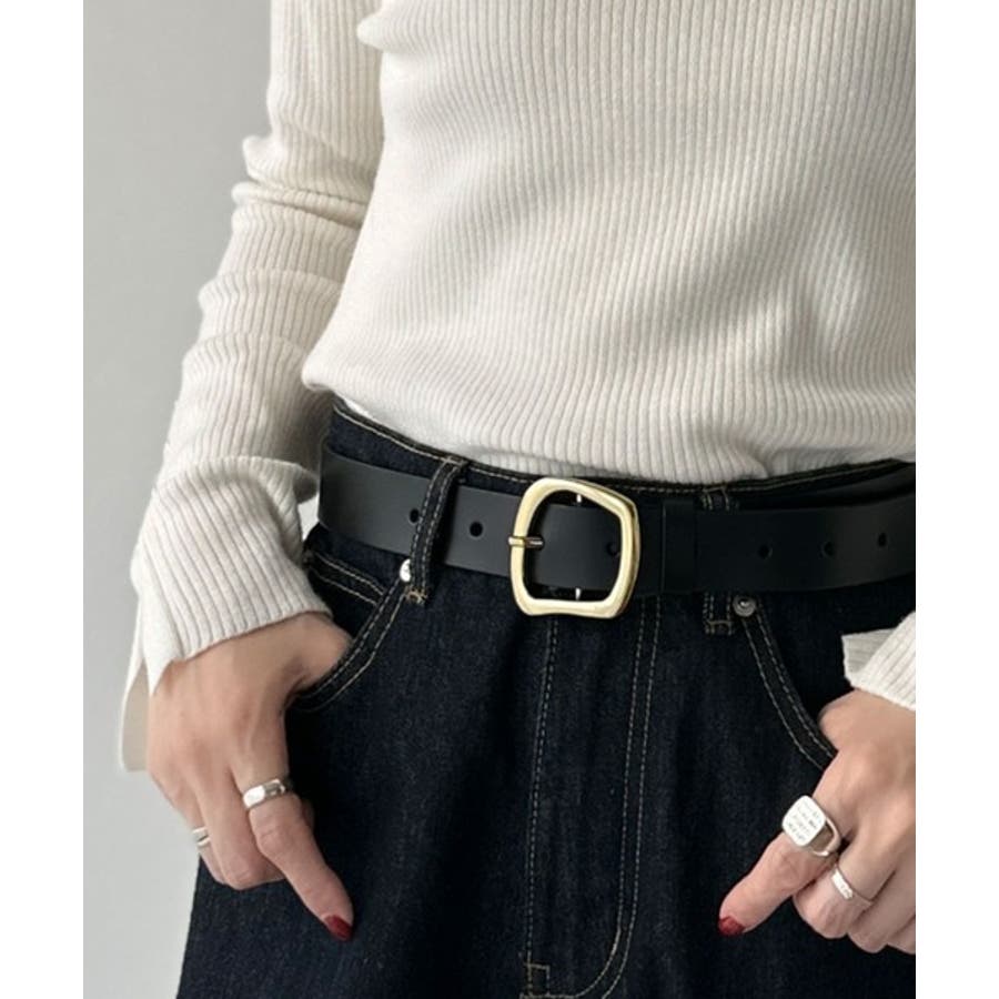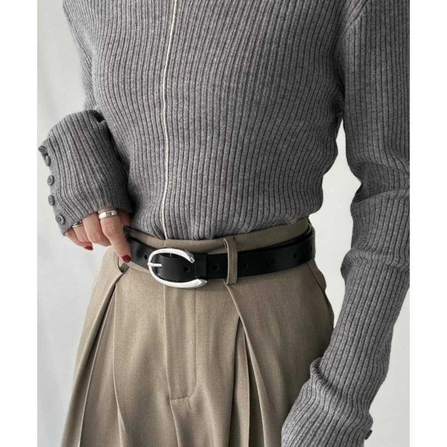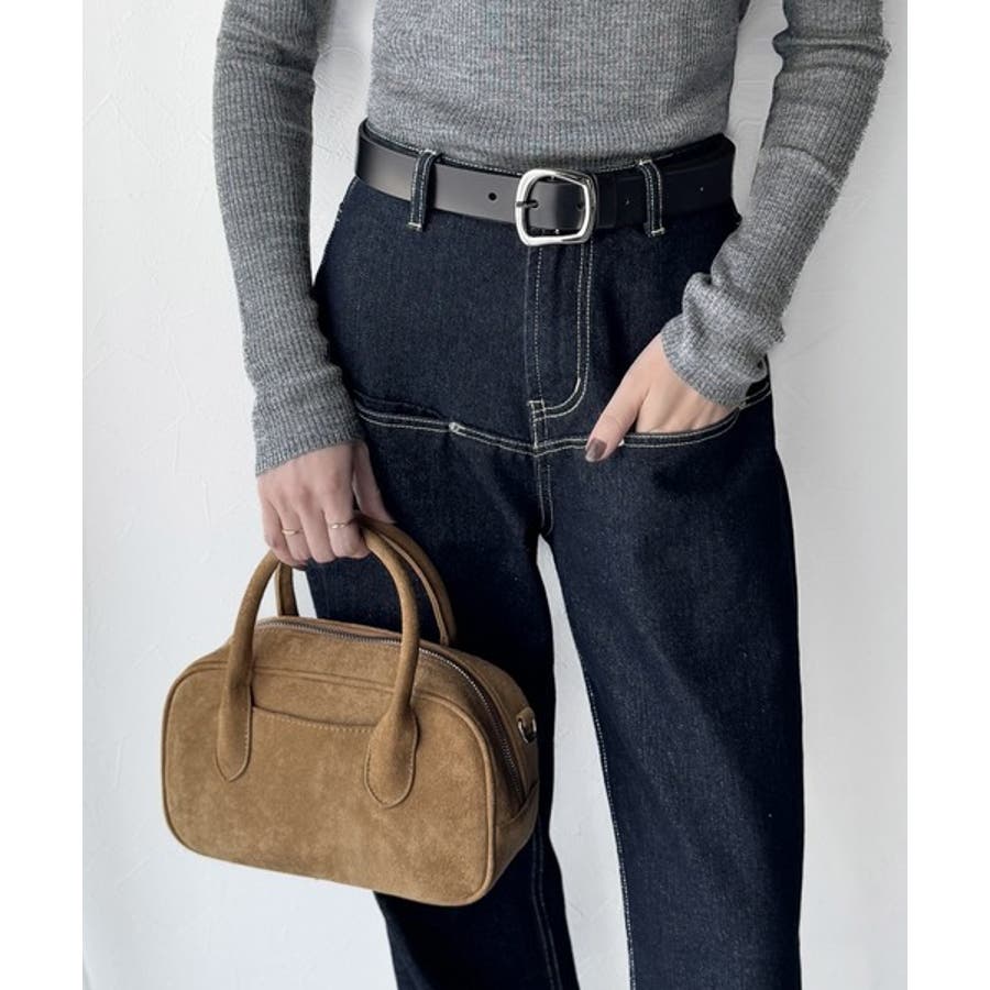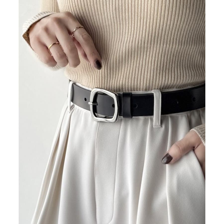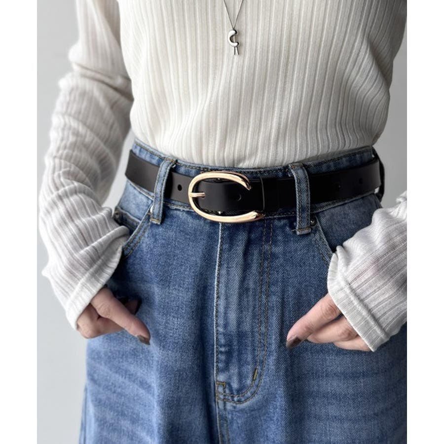 トップスをインしたスタイリングで、バックルのデザインが映える着こなしに。