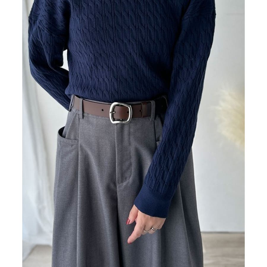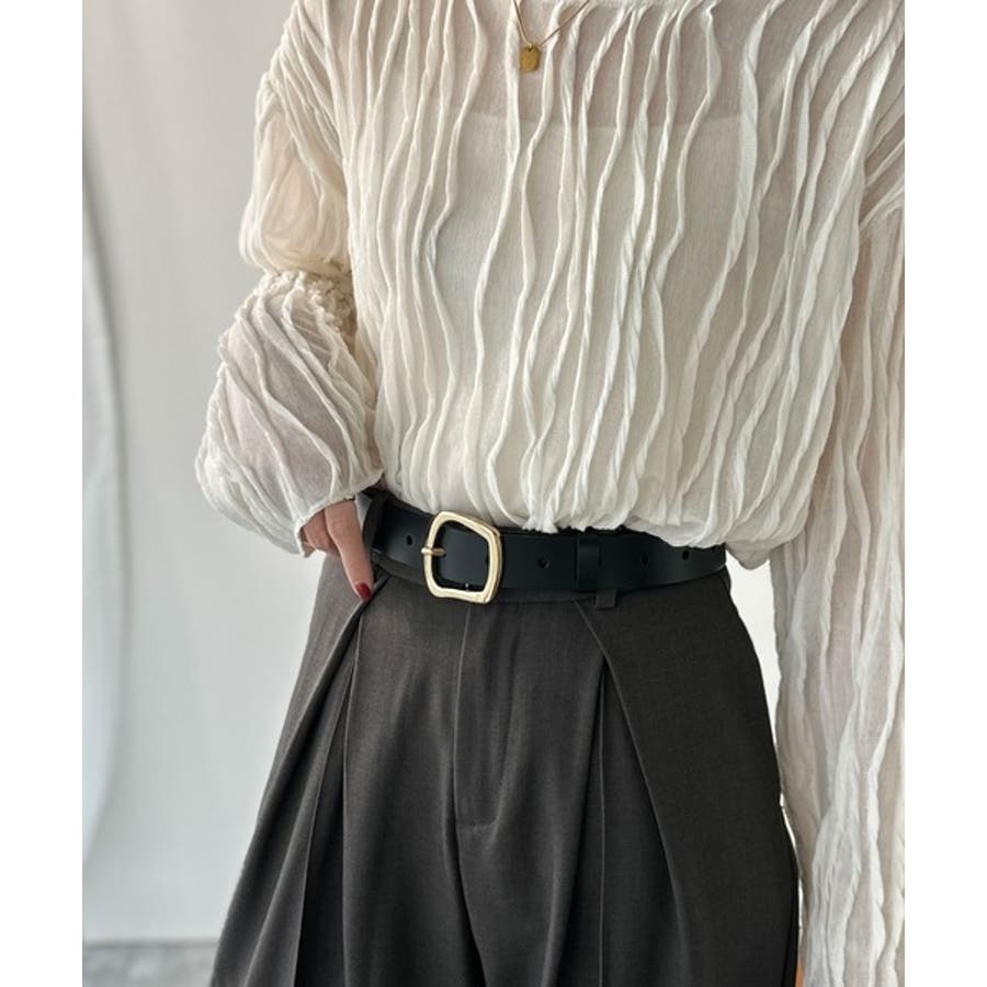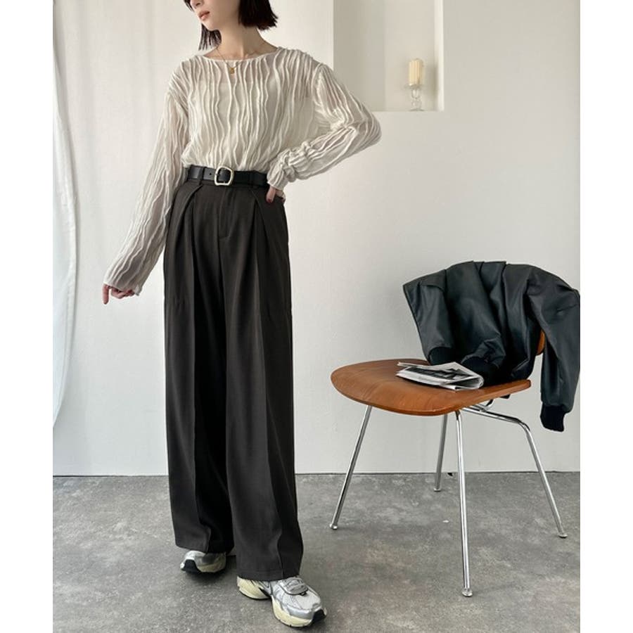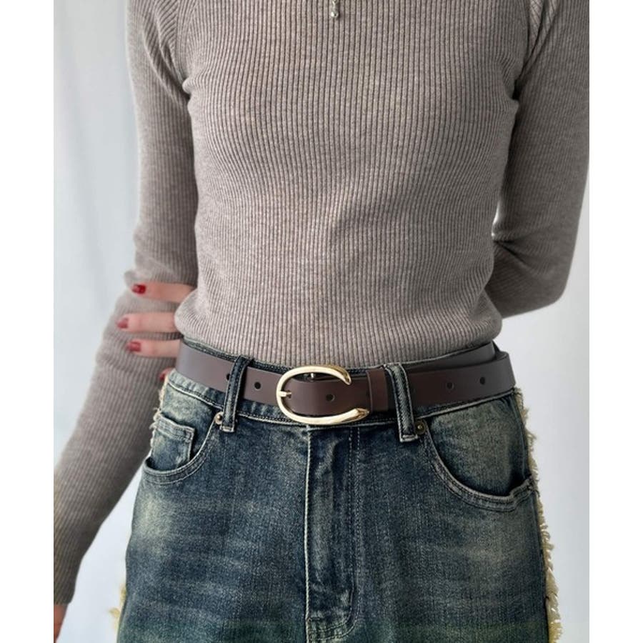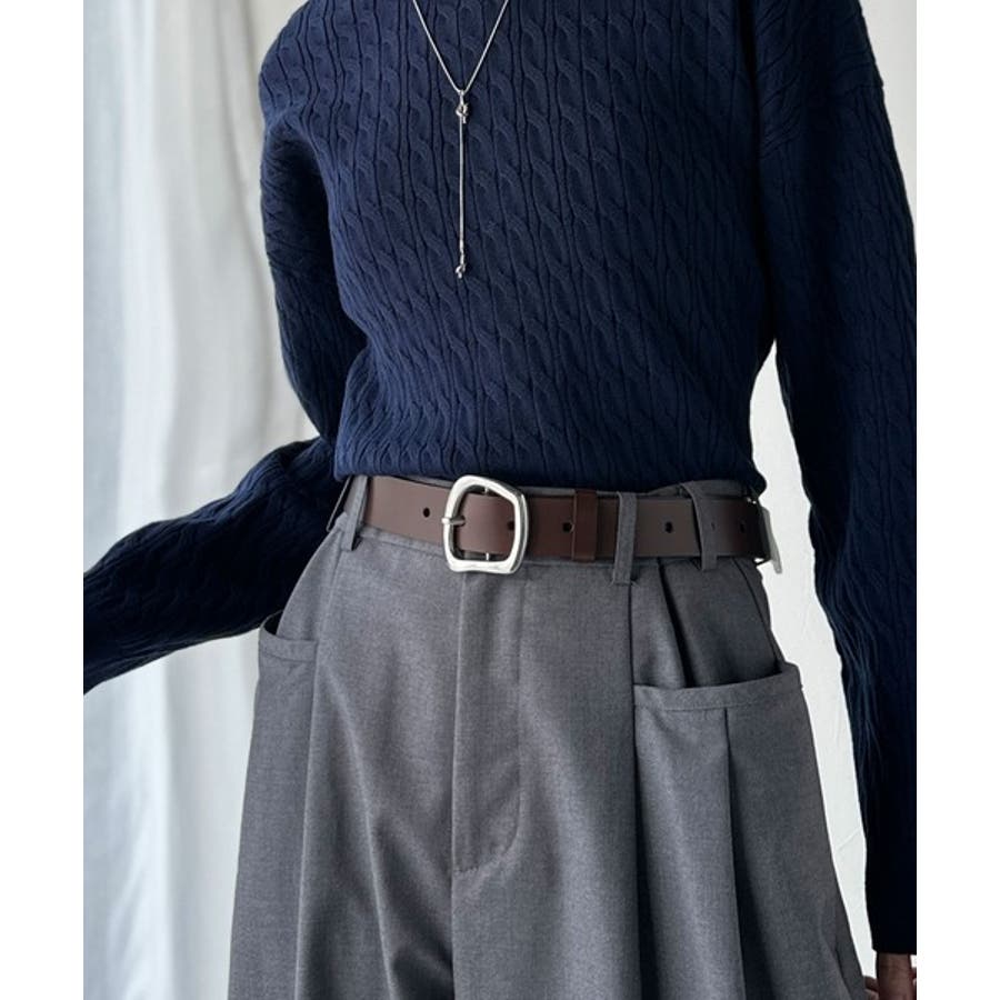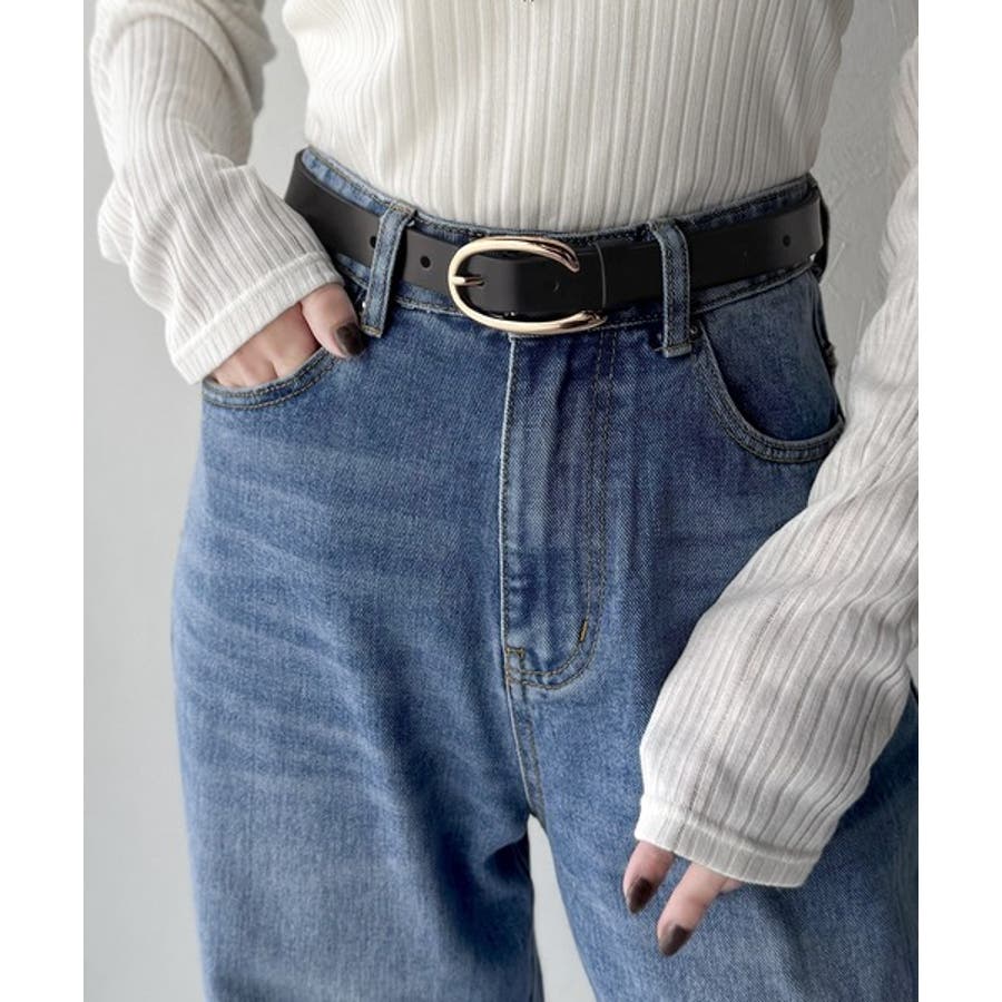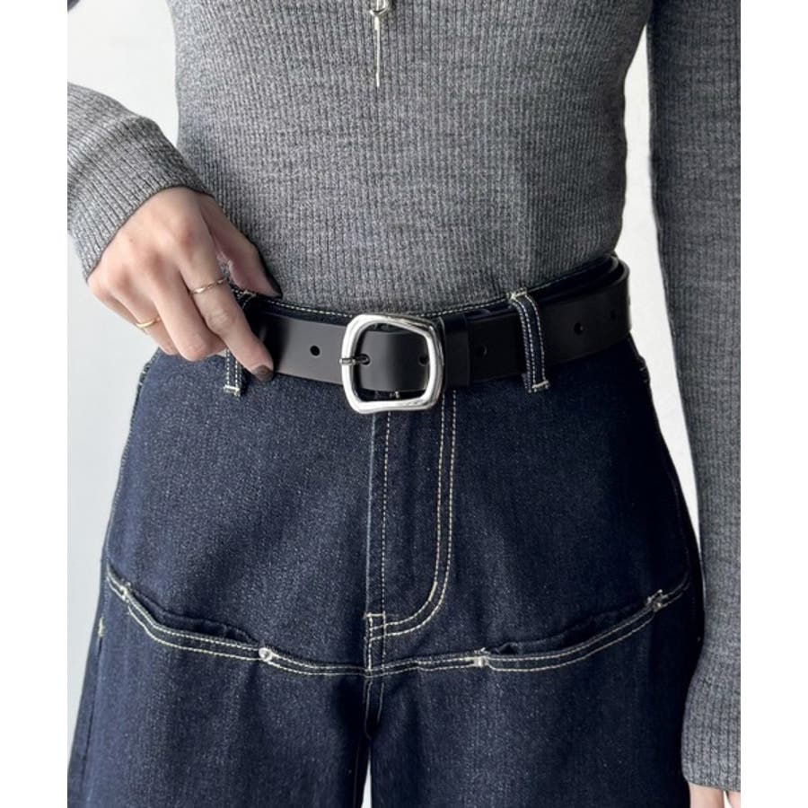 トップスをインしたスタイリングで、バックルのデザインが映える着こなしに。