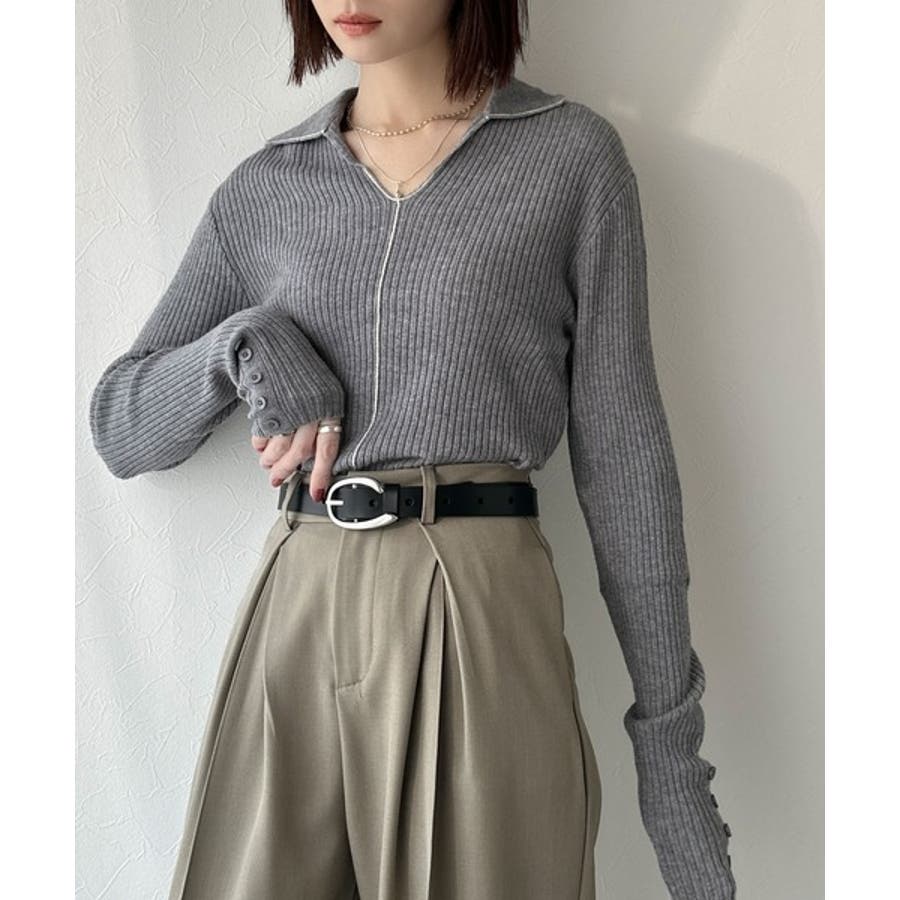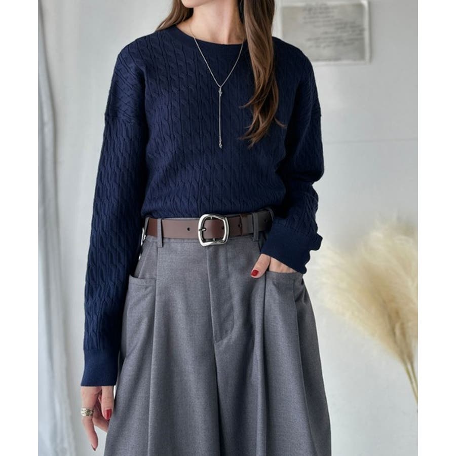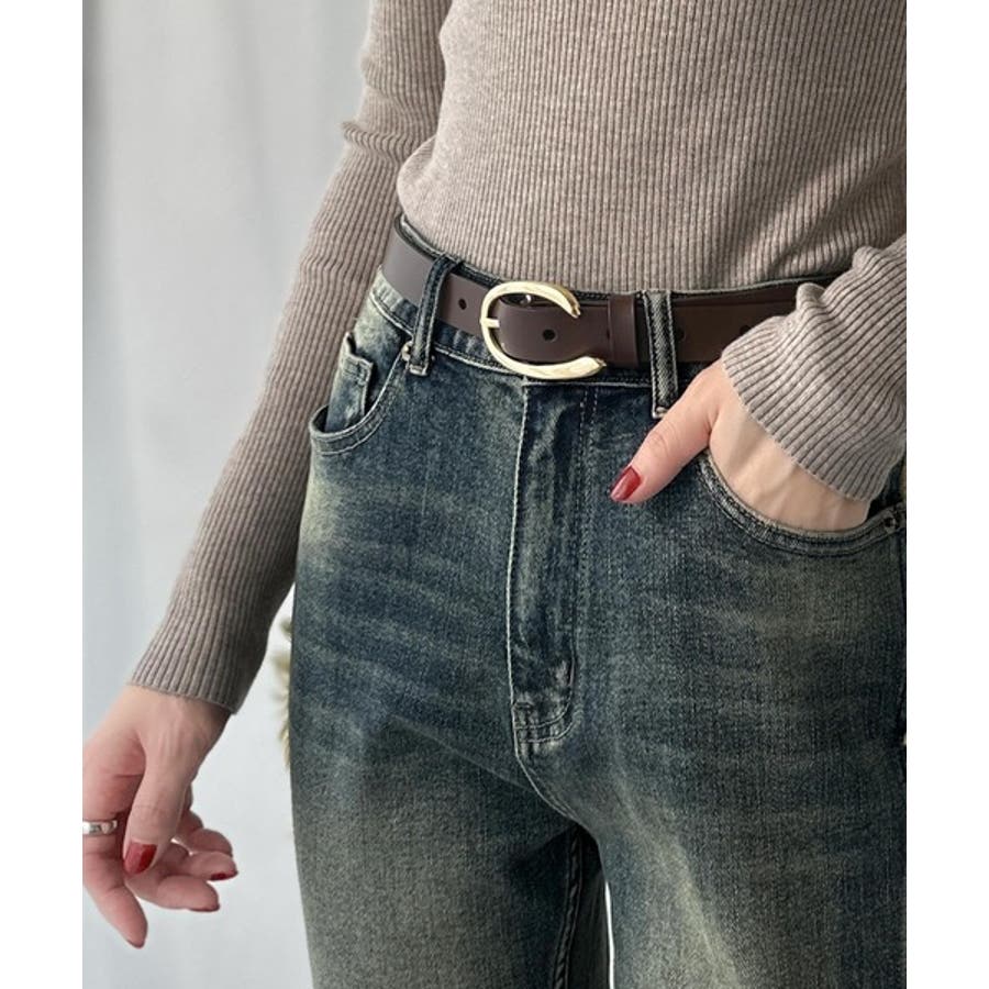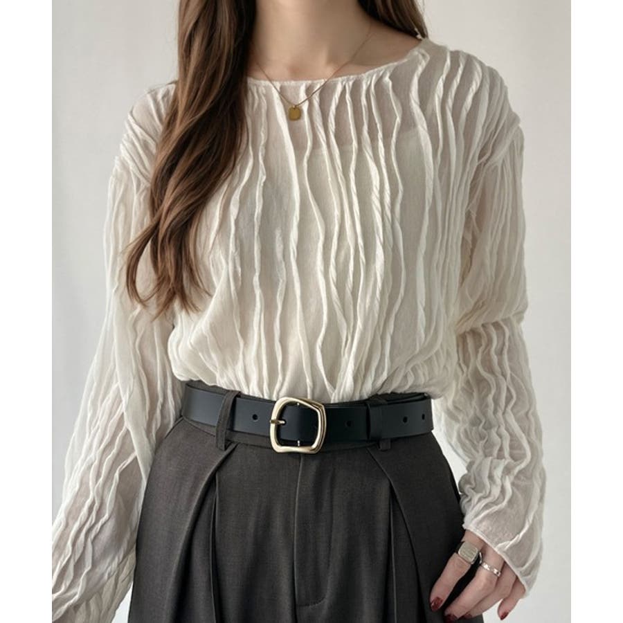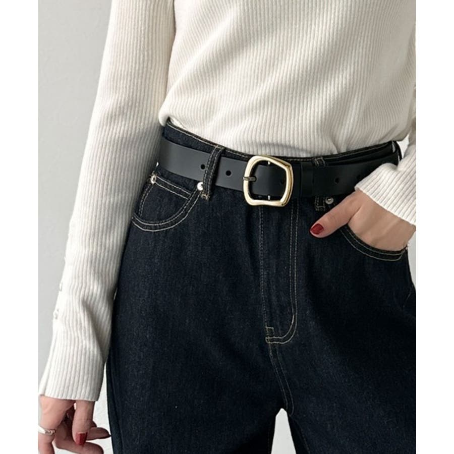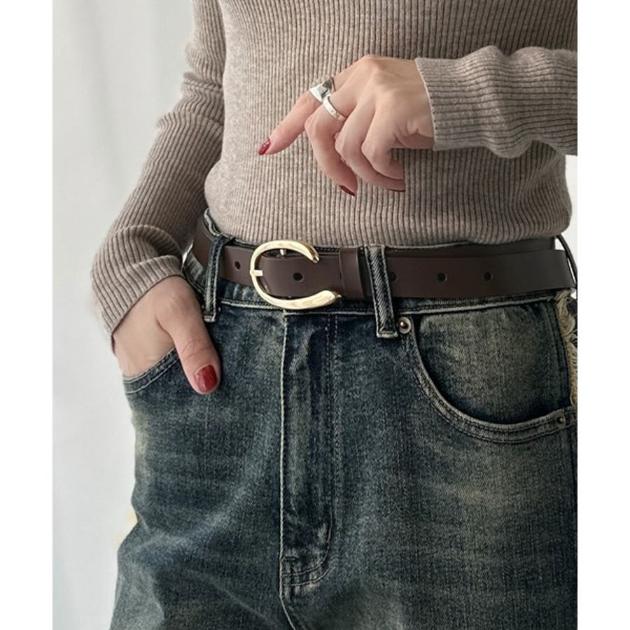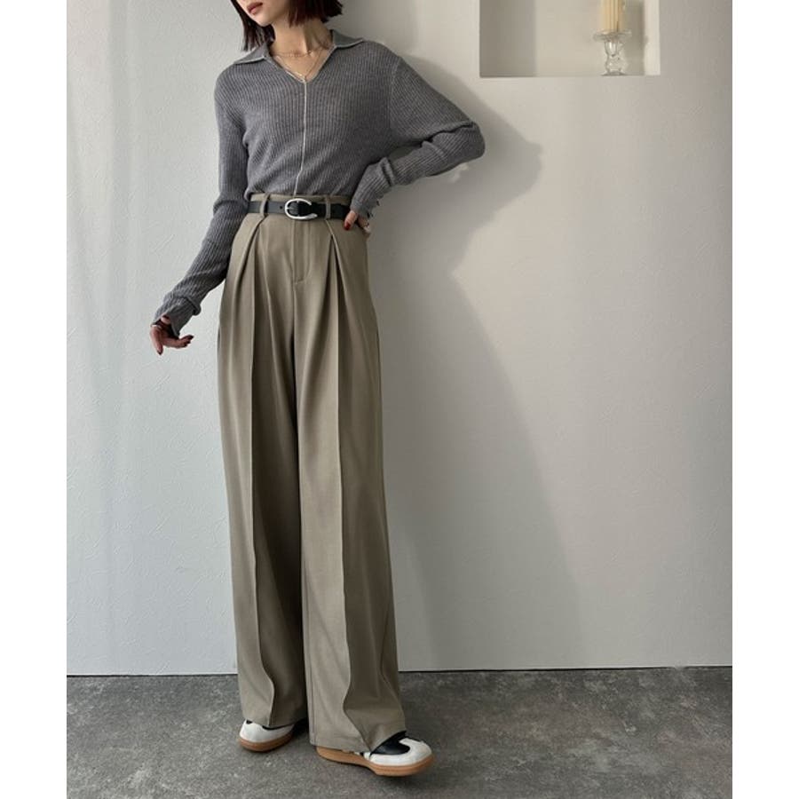 トップスをインしたスタイリングで、バックルのデザインが映える着こなしに。
