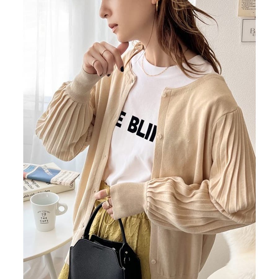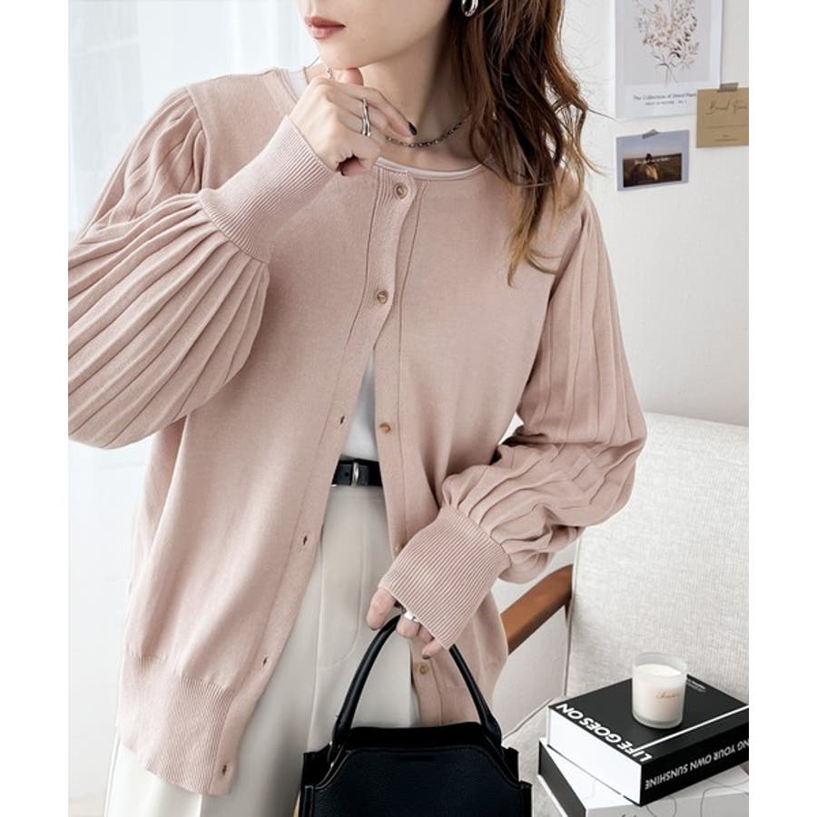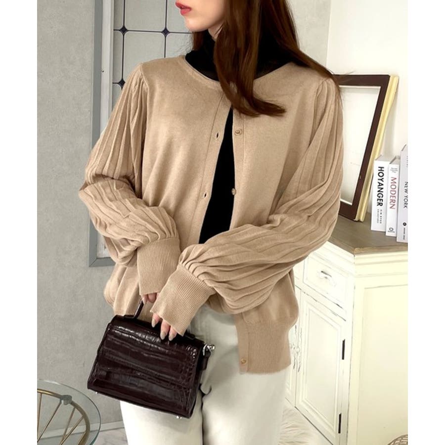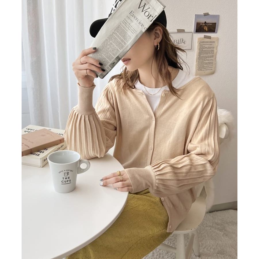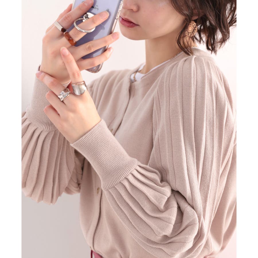 袖プリーツが目を引くお洒落可愛いトレンドニットカーディガン。