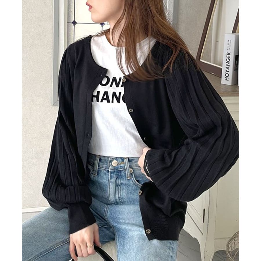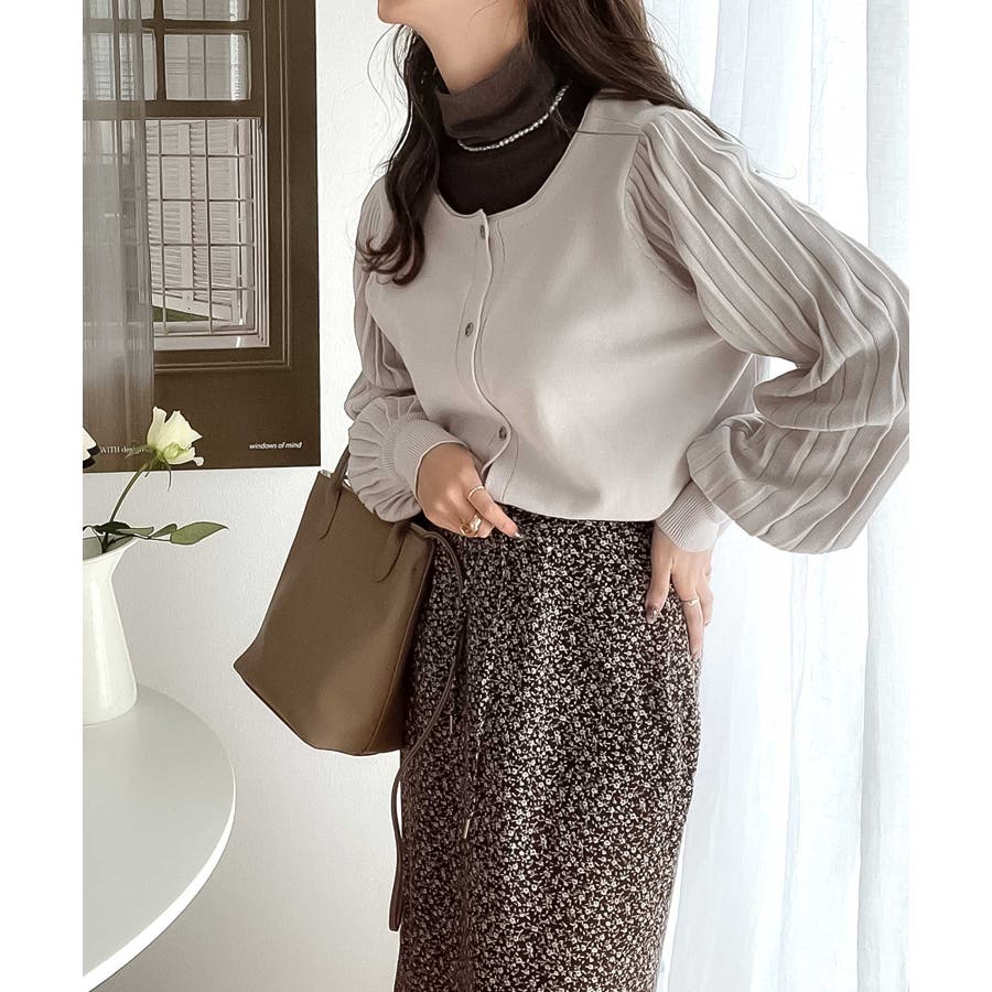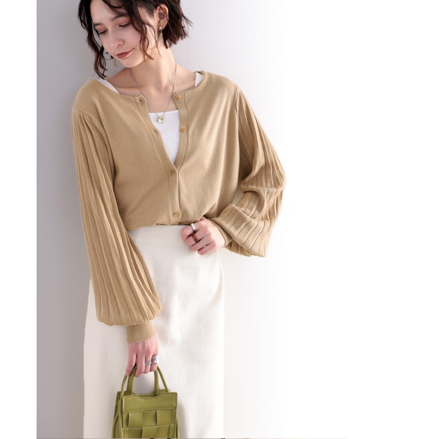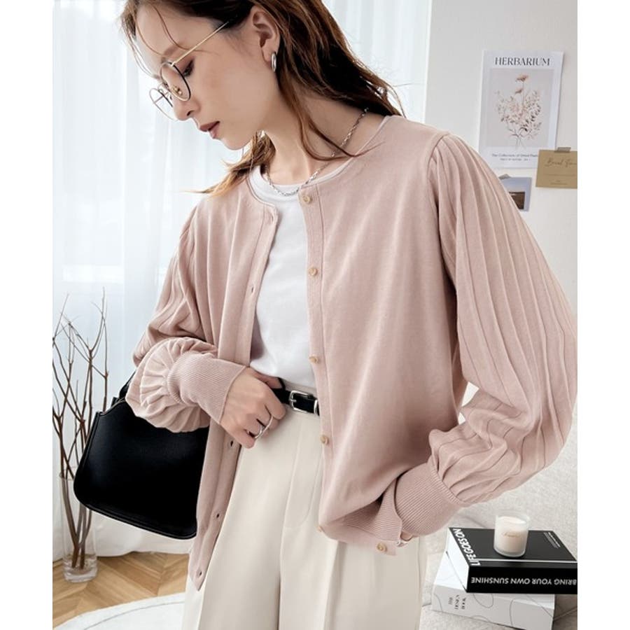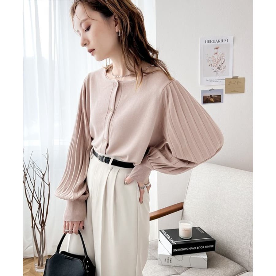 袖プリーツが目を引くお洒落可愛いトレンドニットカーディガン。